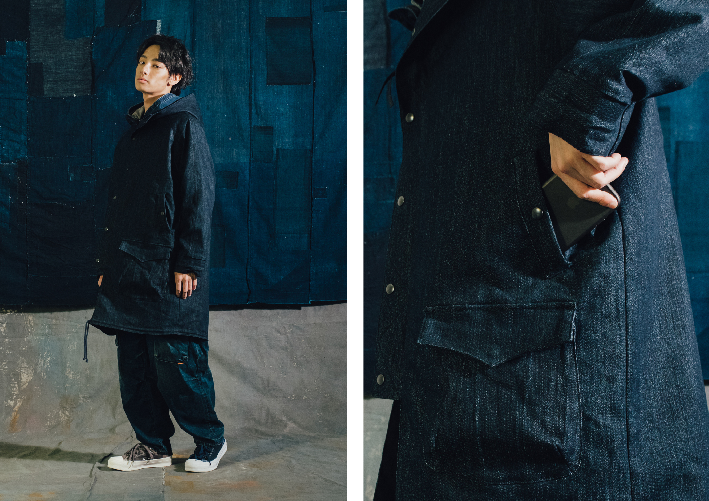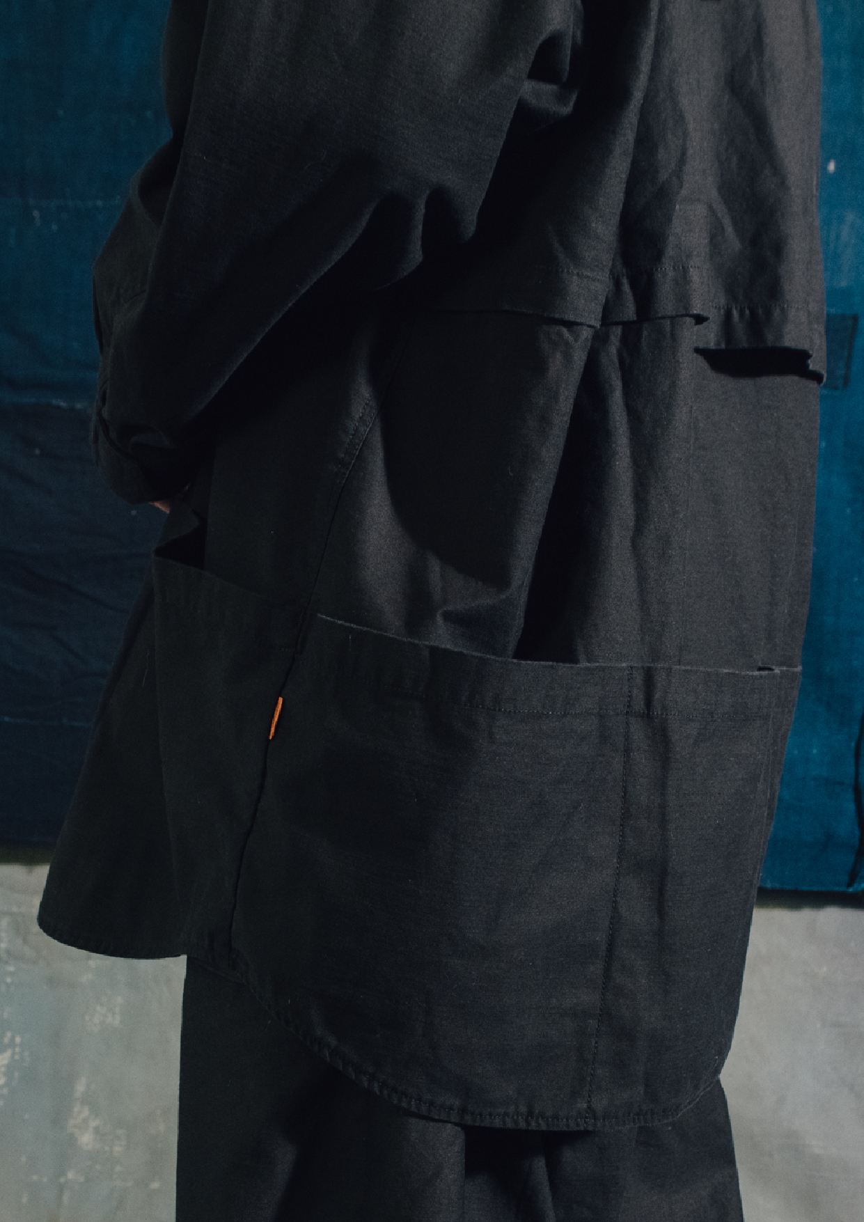 irregular hand crafted pockets, fabric made in Japan.