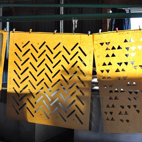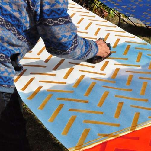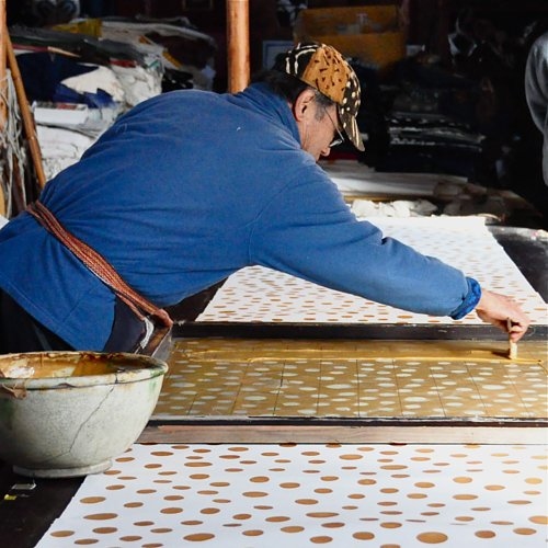 在紙張或是金屬片上雕出鏤空圖案,貼附在欲染布上,於鏤空區域注入染料,將圖案印上去。