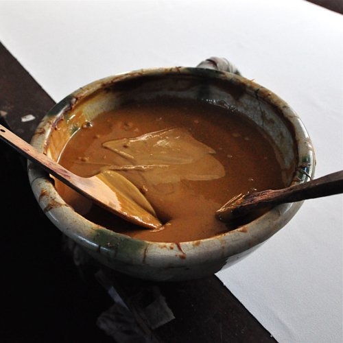 將不透水的材料如蠟、土加熱融化,以畫筆/蠟染針/雕板等蘸之、繪製圖案於待染布料。待深入布料纖維的蠟凝固,將布料浸入染缸,圖案因蠟隔絕水份/染料而保持原色,其餘布料則被染色。染製完成後,以高溫蒸氣與熱水融化洗去蠟圖,成為深底色白花紋的作品,比如照片中這一次進貨的印度飾毯便是。