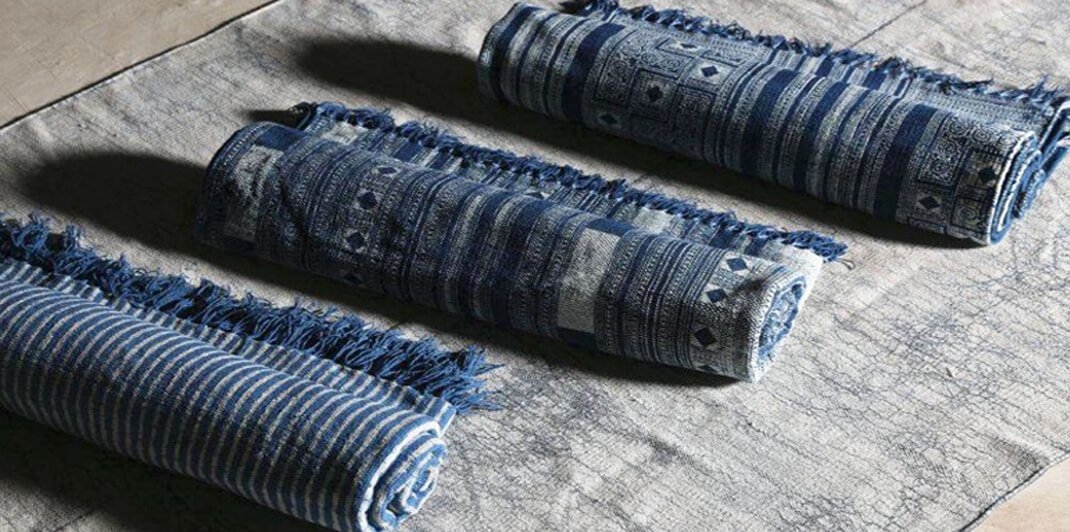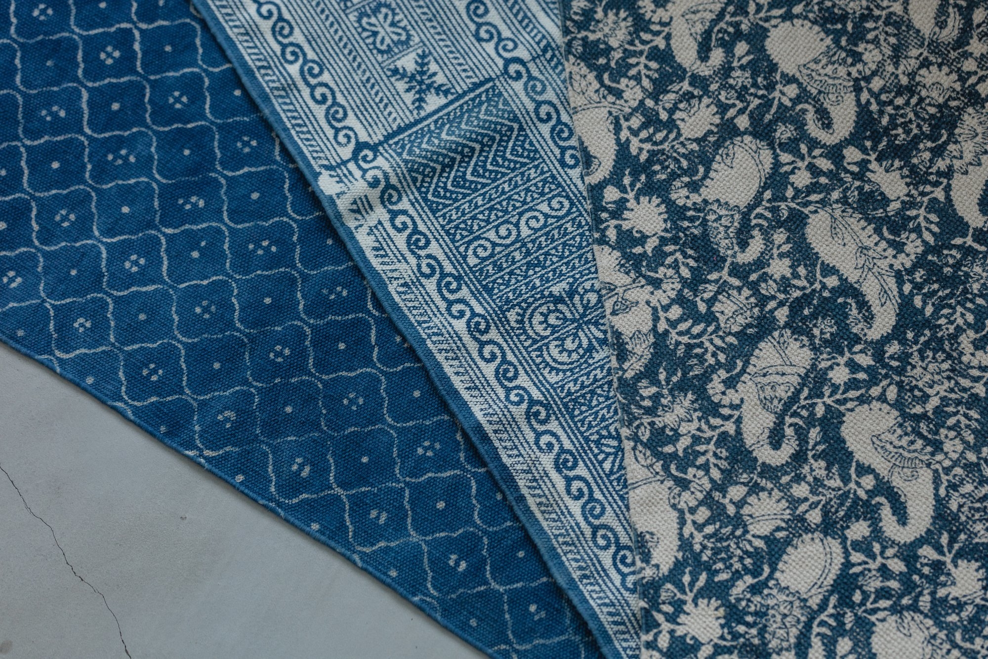 SYNDRO HOUSE 本次引進的印度藍染飾毯來自印度古城 Jaipur,當地完善保留諸項傳統工藝,至今仍以天然方式栽種有機棉,並用以編織名揚全球的棉布飾毯。