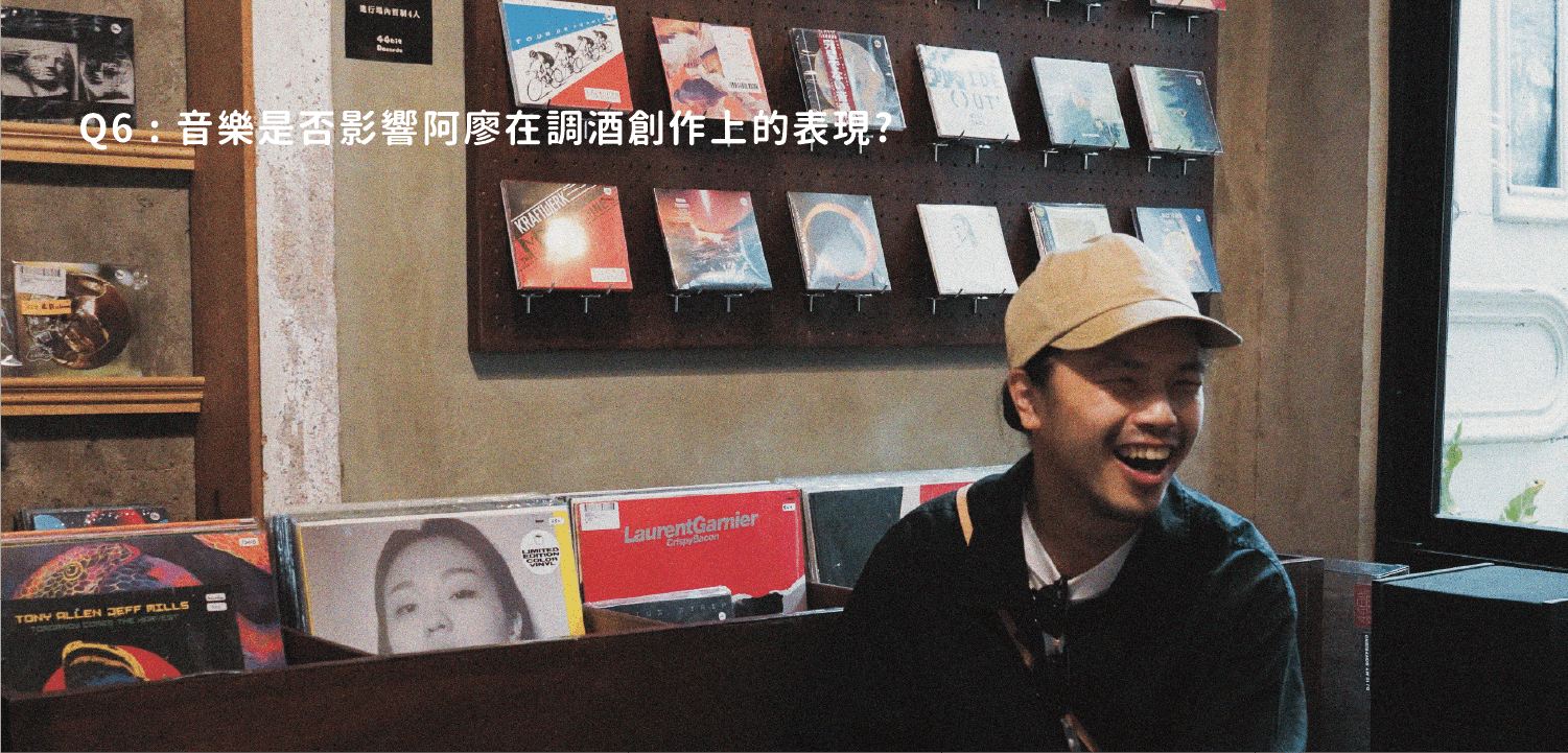 有時候會思考,聽這個音樂的時候,它帶給我什麼?那其實就會影響到調酒創作。音樂帶來什麼畫面?環境中有什麼味道?這時適合喝什麼?甚至是當下眼睛看到什。音樂或畫面,都對在做各種不同的味道,有滿深刻的影響,而這些會產生畫面的音樂,都會協助調酒的創作;因為喝酒不可能一直都很快樂很高亢,也有安靜、平靜的時候。