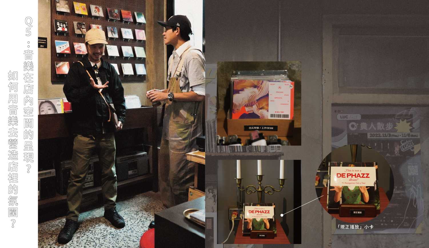 我們在不同時段,會挑選合適聆聽的音樂專輯,白天是聆聽性重一點、帶些 grooving 節奏、基本四四拍鼓底,組成帶有一些爵士、Bossa Nova 旋律,加乘在一起的電子音樂。因為唱片行關係不是用串流去設歌單,而是用專輯一片一片放,用餐區音響上會擺著該時段播放的專輯,上面放著「現正播放」小卡。