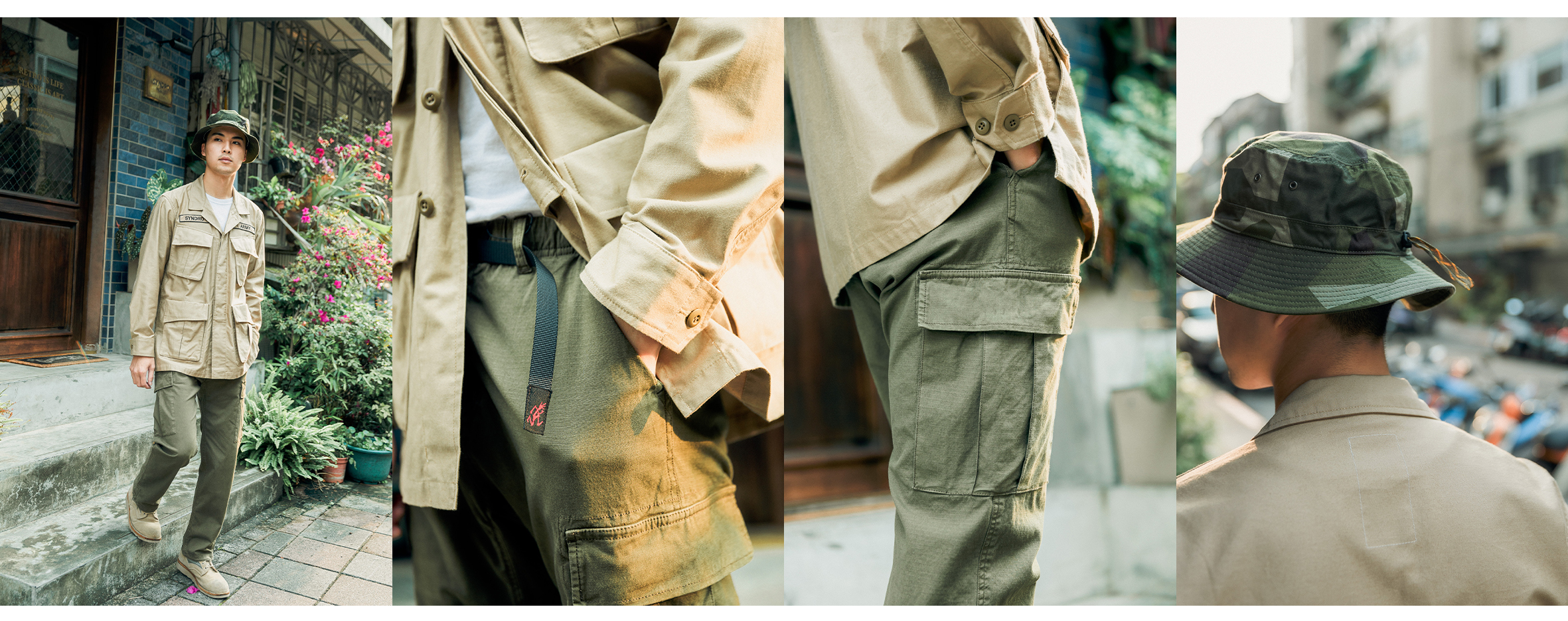 以經典軍裝長褲為基礎,將代表性的 ripstop 抗撕裂面料加入彈性,軍裝側口袋設計,並加入GRAMICCI 代表性腰帶扣、褲腳調節環,搭配修身直筒版型,讓此款 cargo pants 在軍事味中更具現代感,而且舒適。