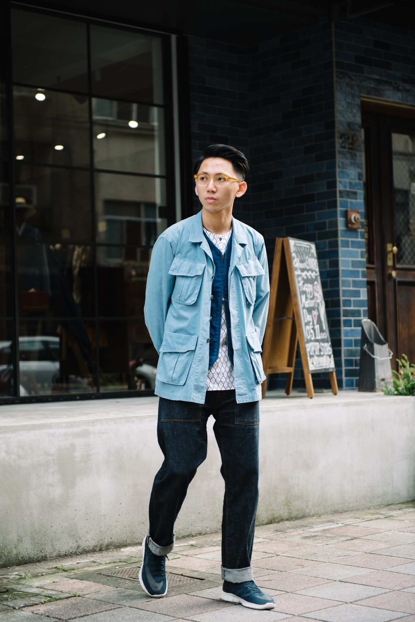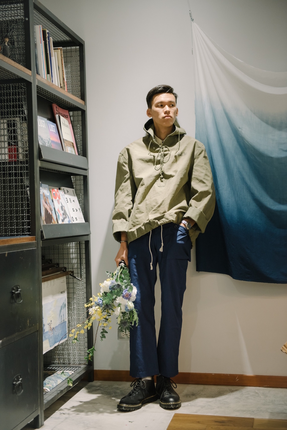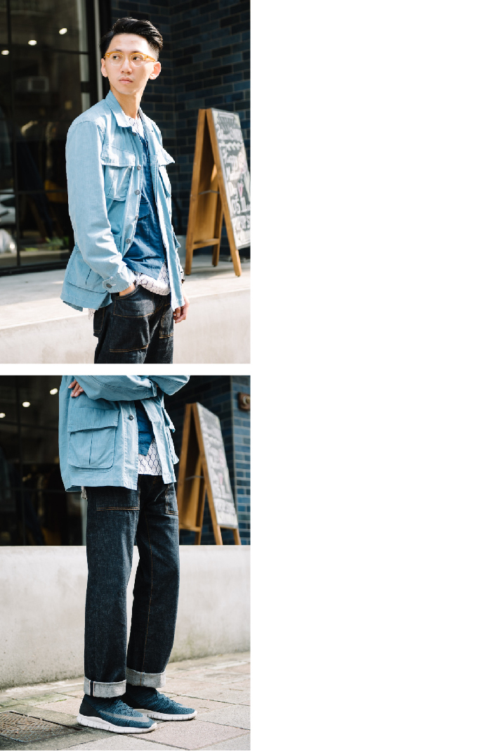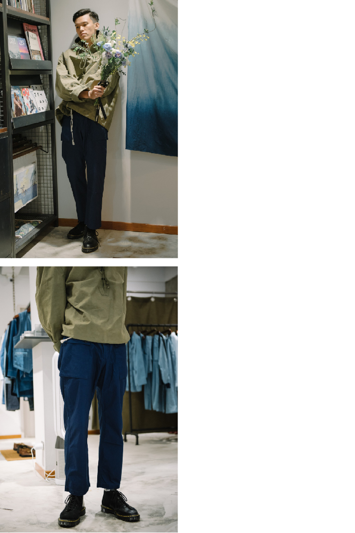 出的藍染軍褲,一身軍事風格。