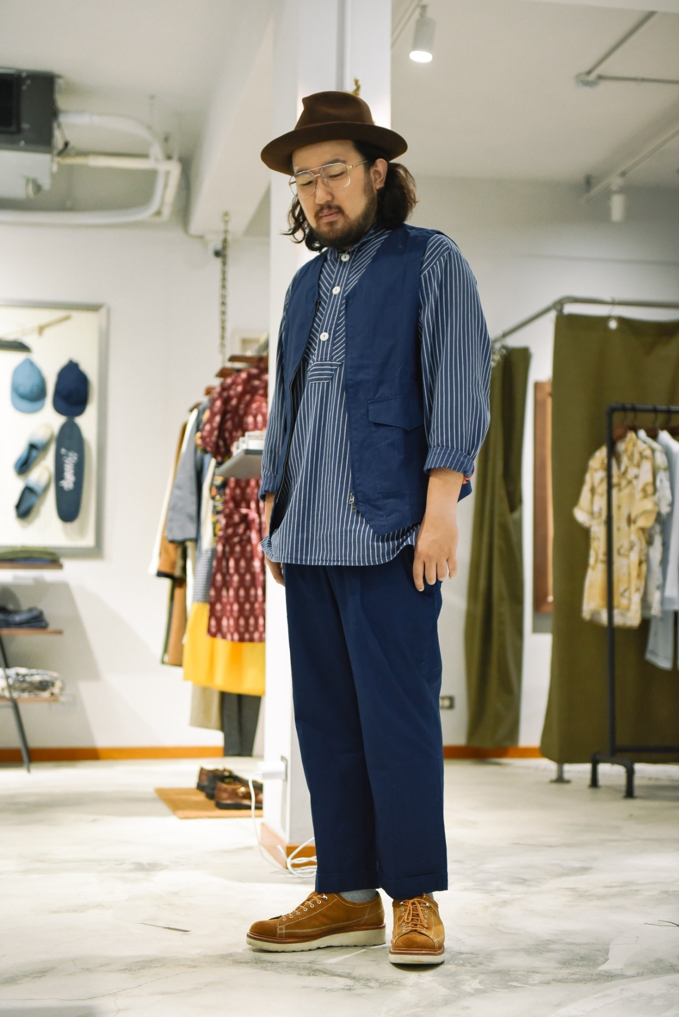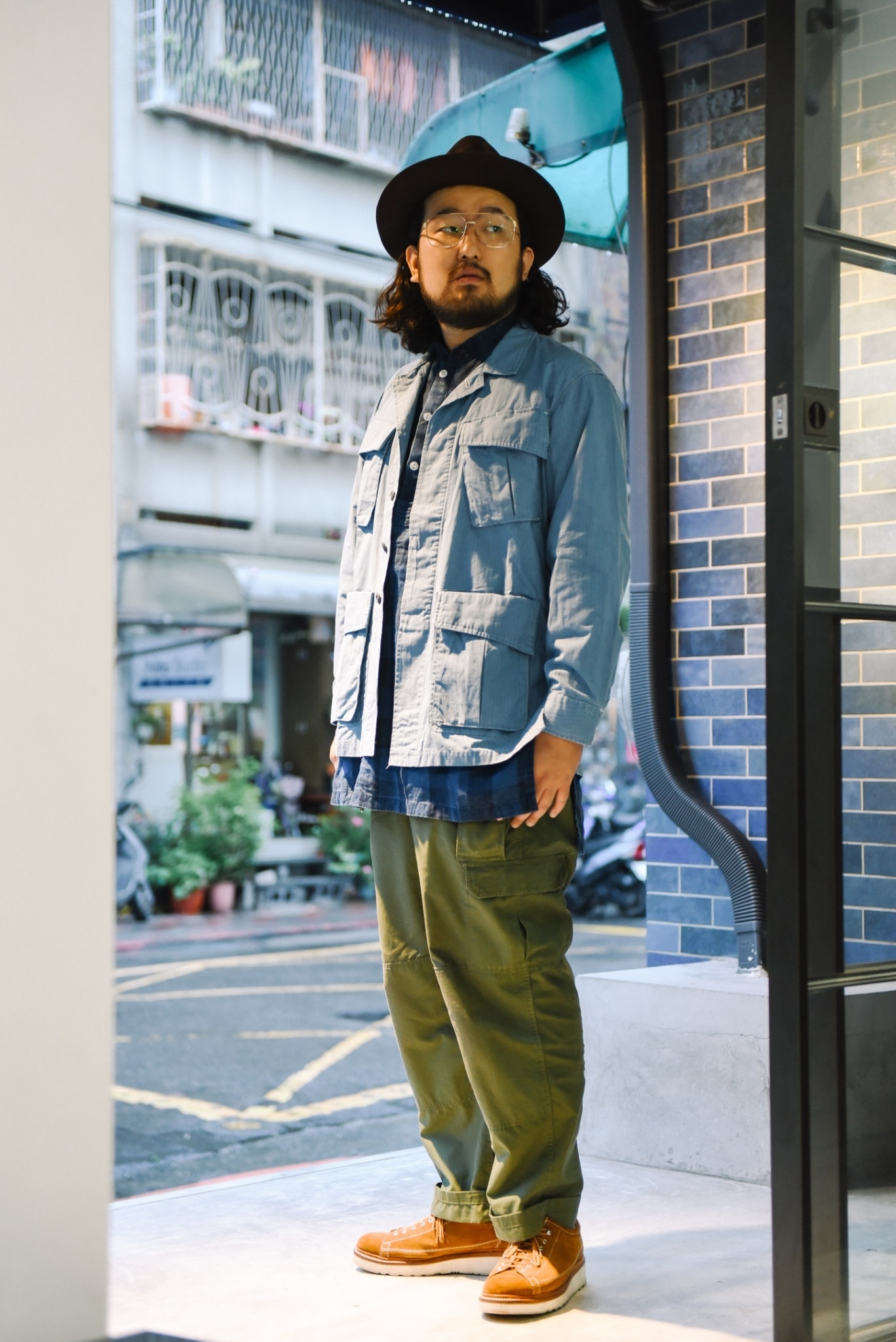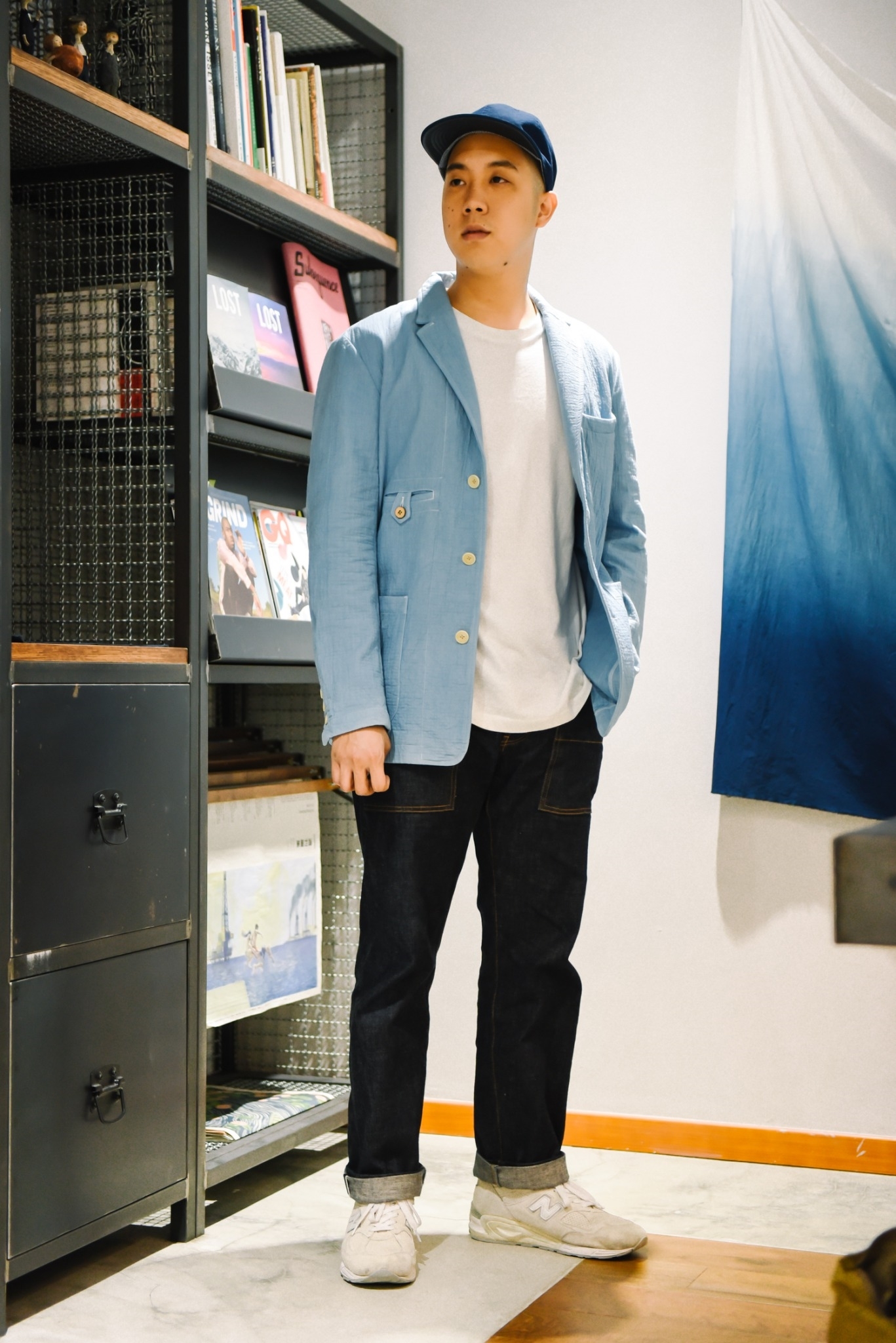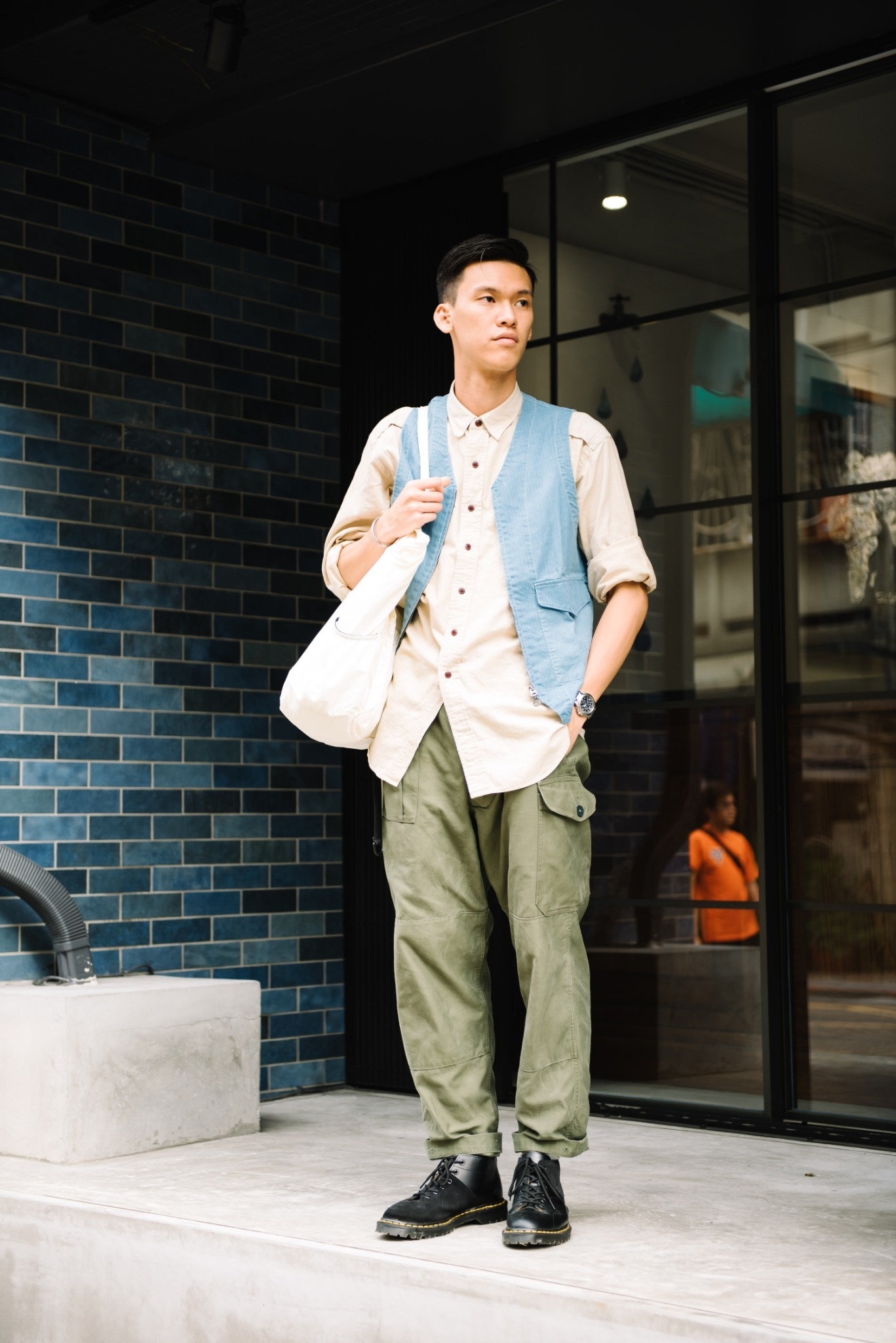 出的藍染軍褲,一身軍事風格。