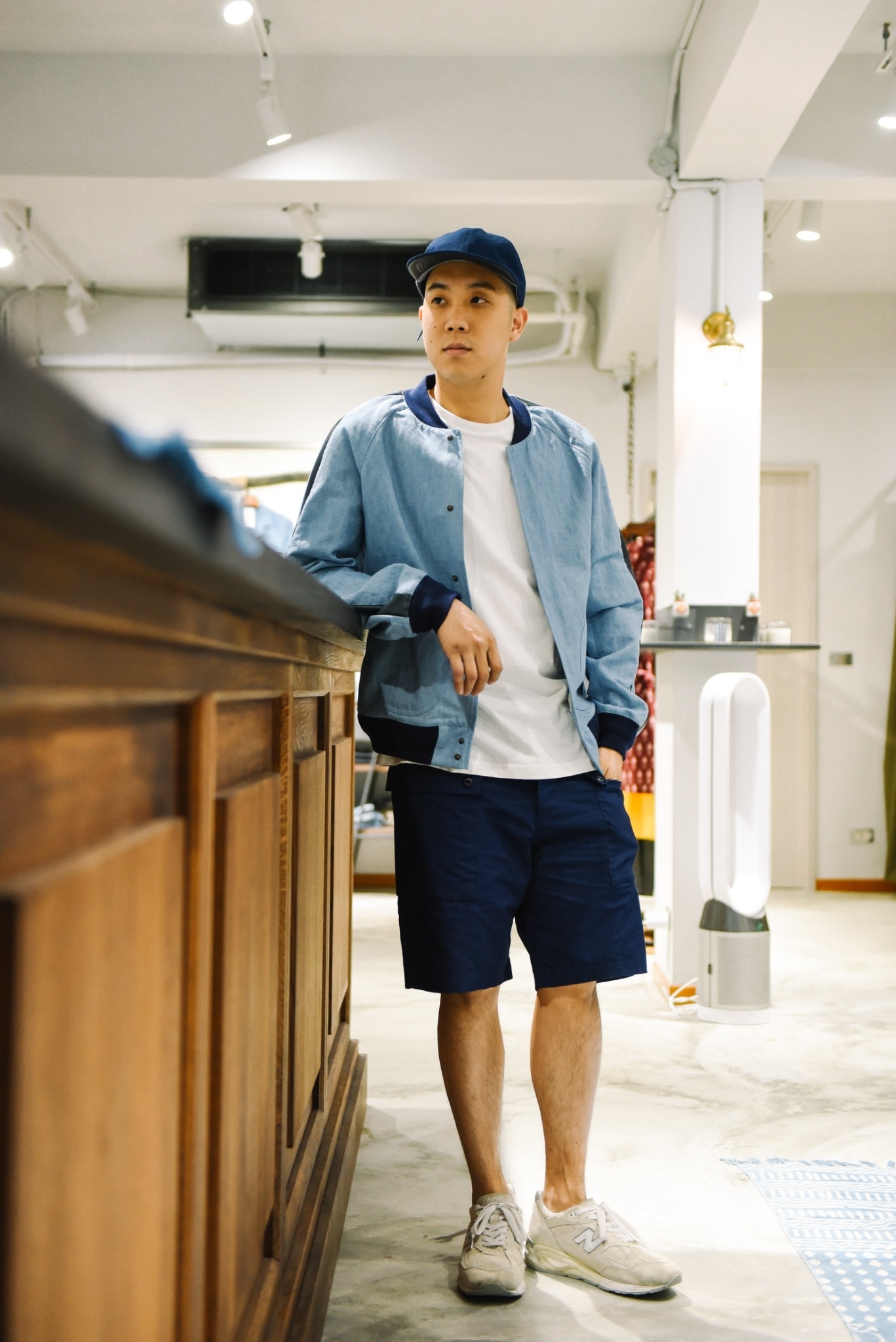 最後隨性地套上球鞋及輕便帽款,