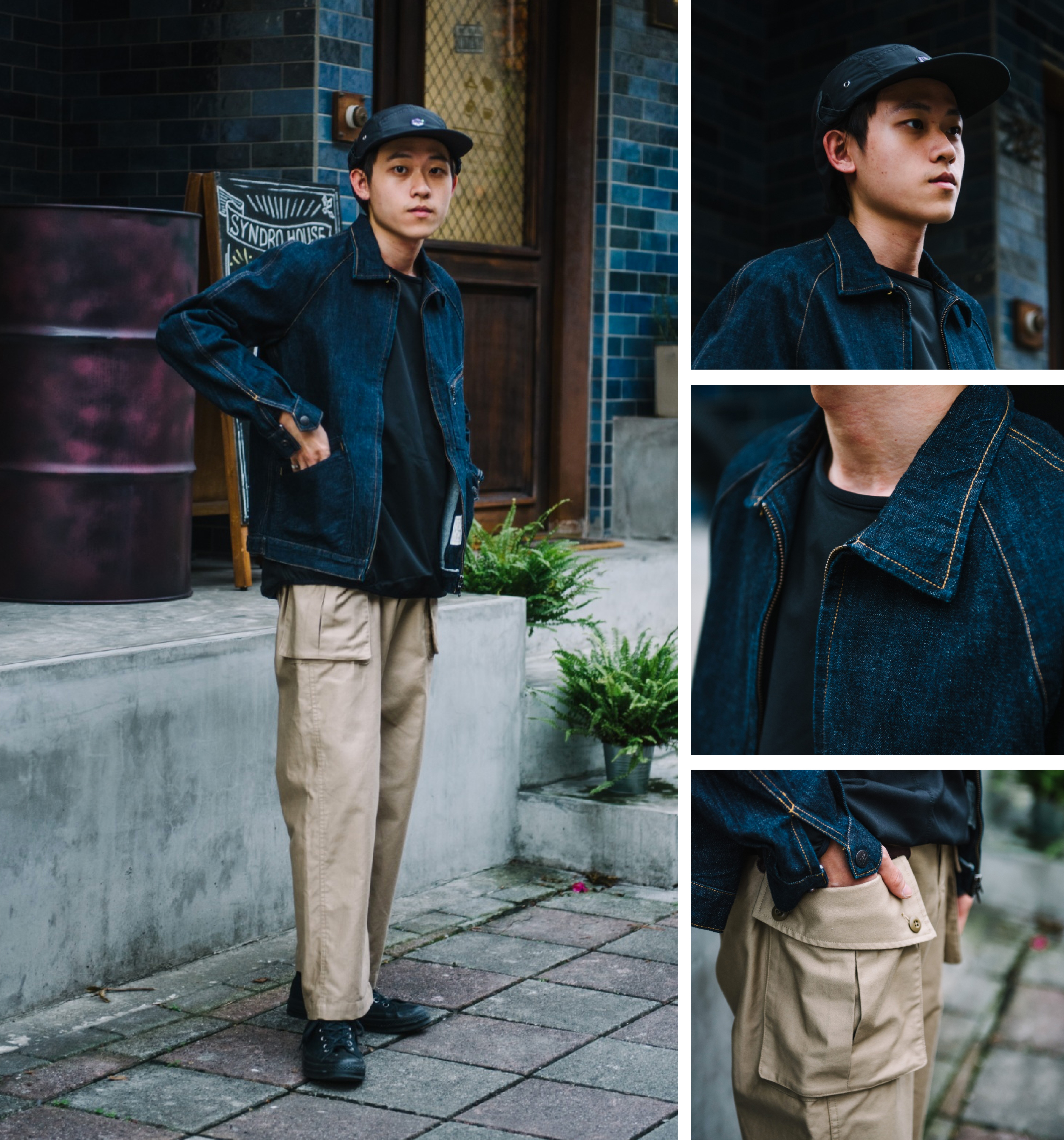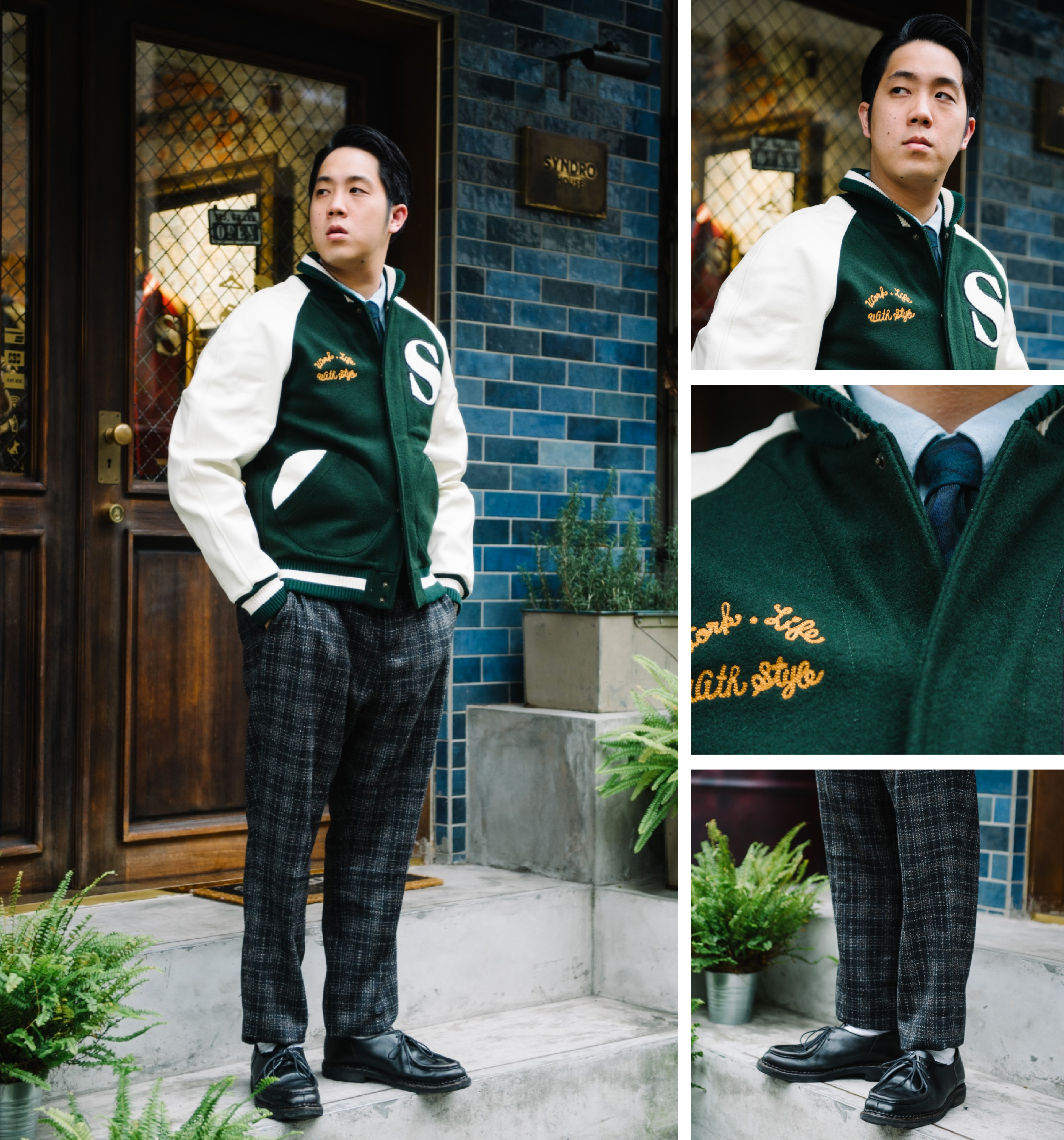 「 用格紋 “SILENT ROCK” 西裝褲與 “STRIKE” 棒球外套呈現出美式學院風格。」