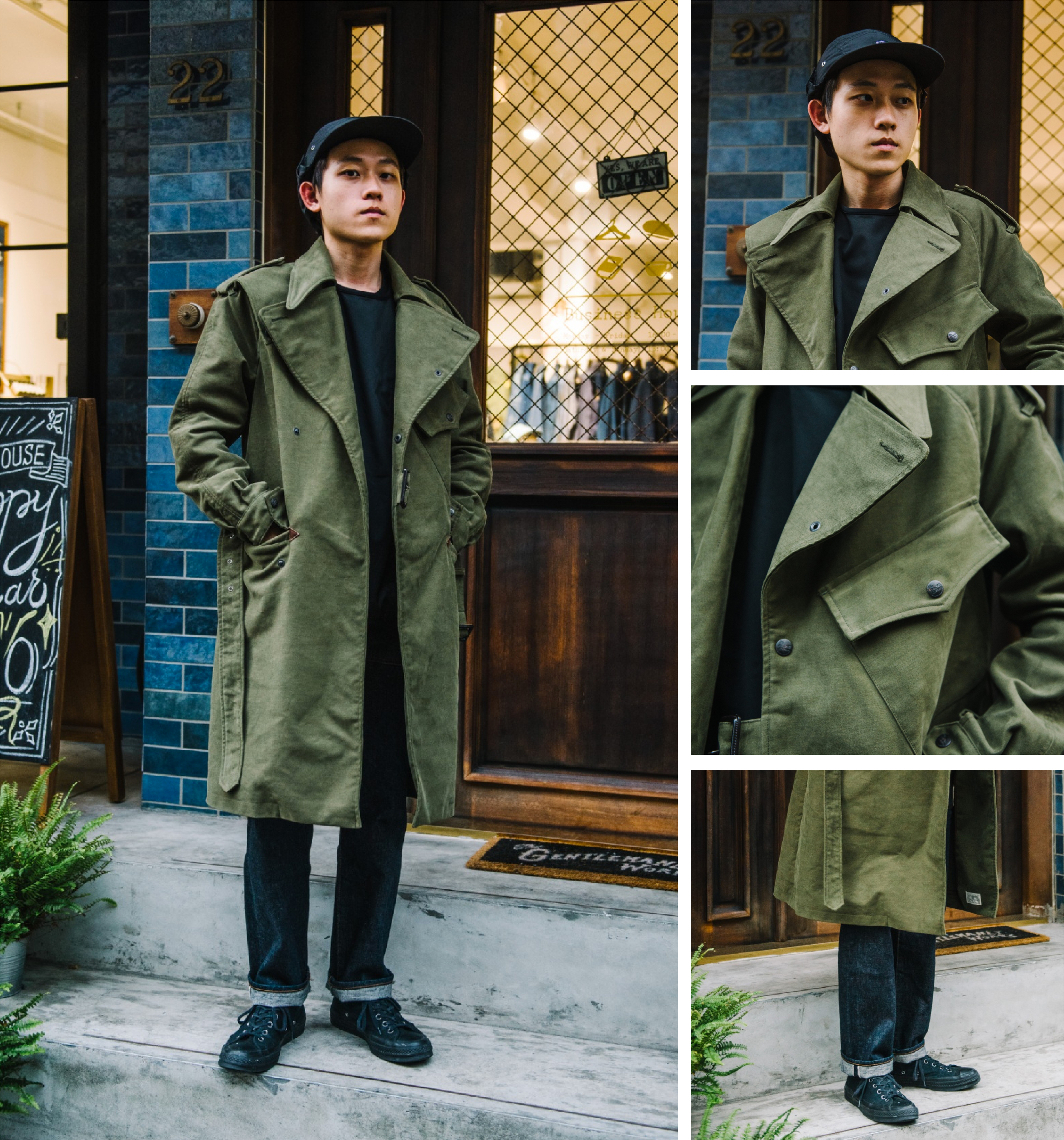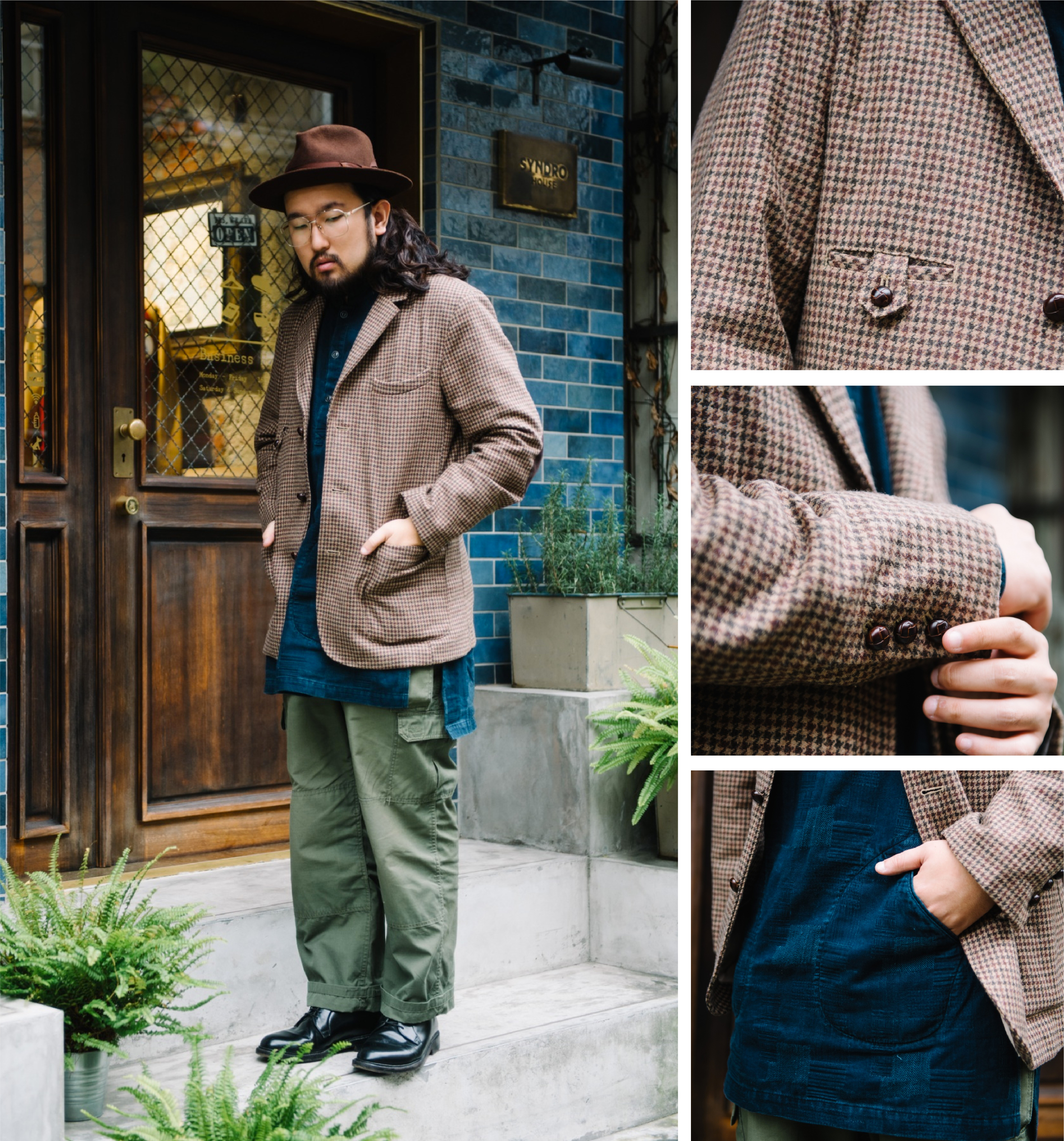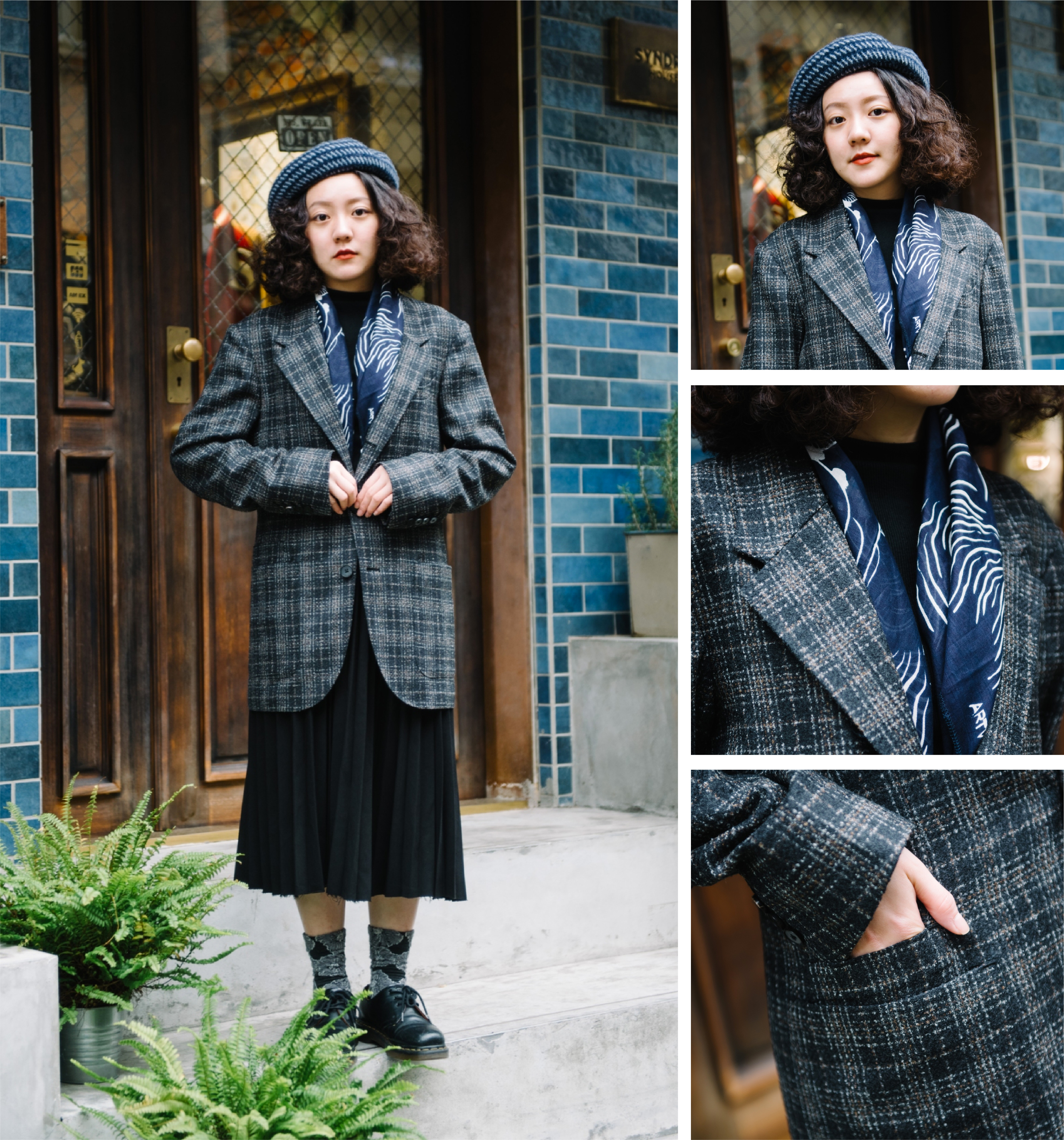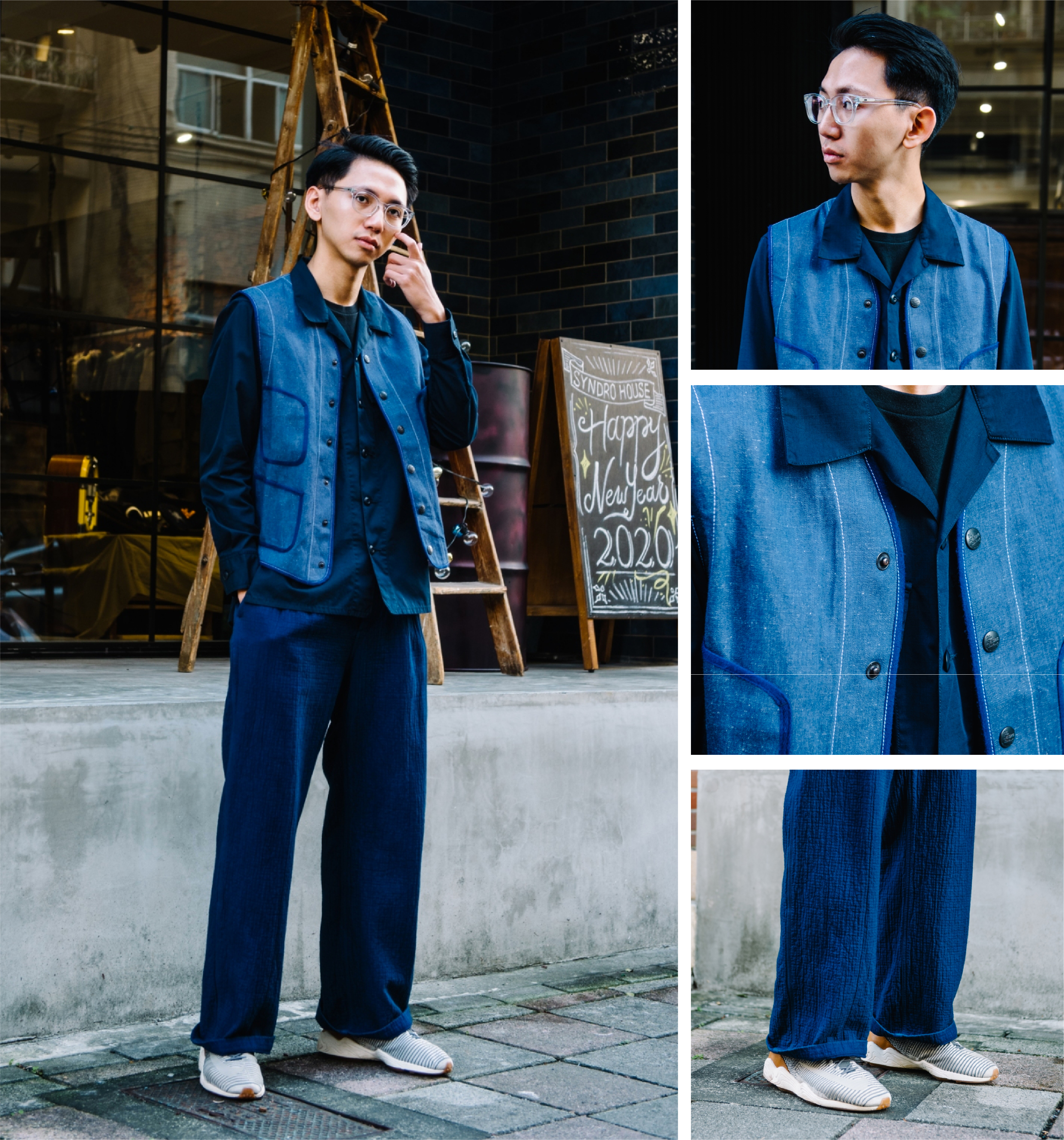 「毛呢紳裝外套混搭提花藍染長版襯衫,內長外短凸顯穿搭層次。」