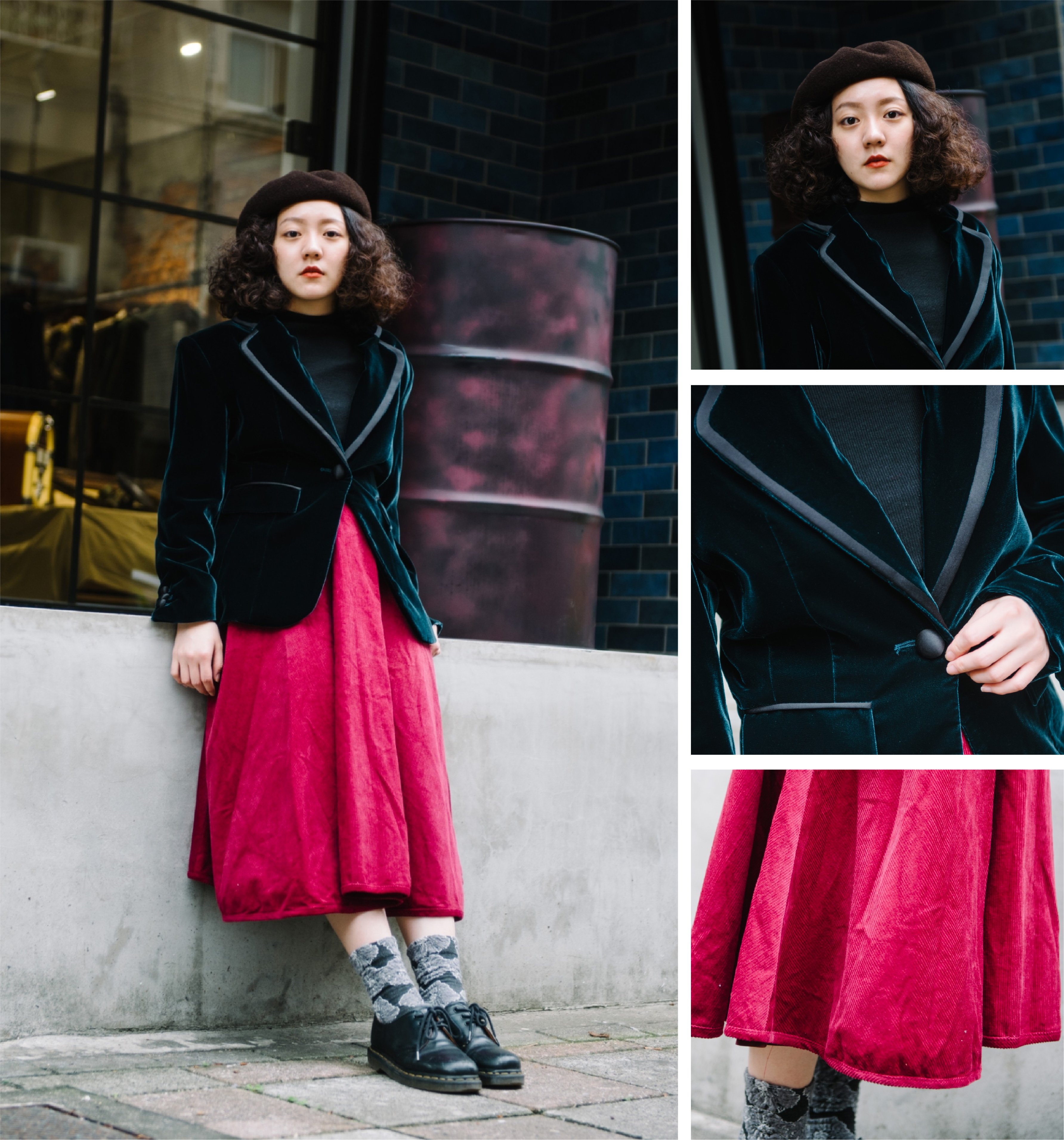 「神秘感的墨綠色西裝外套配上紅色圓裙,格外亮麗。」