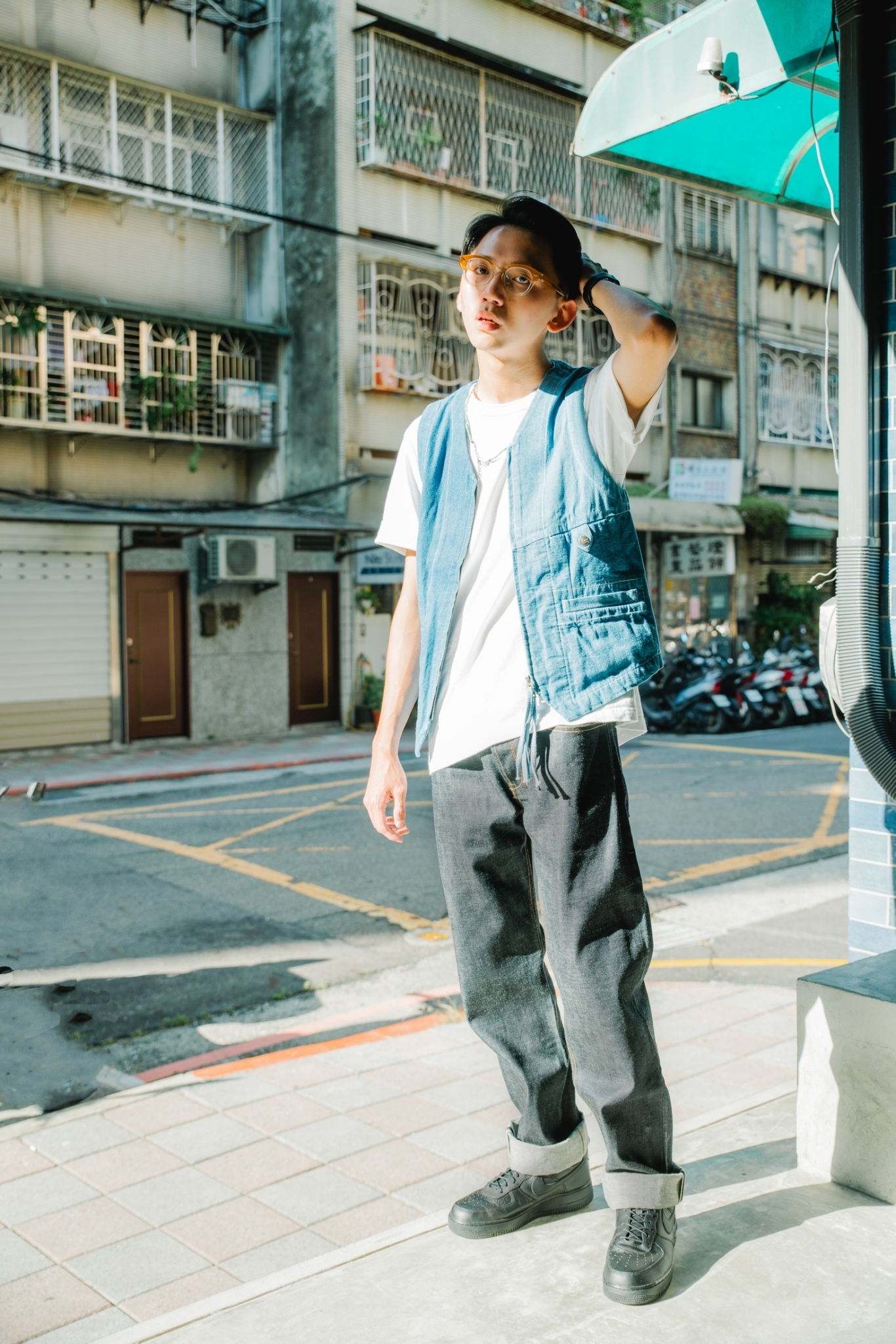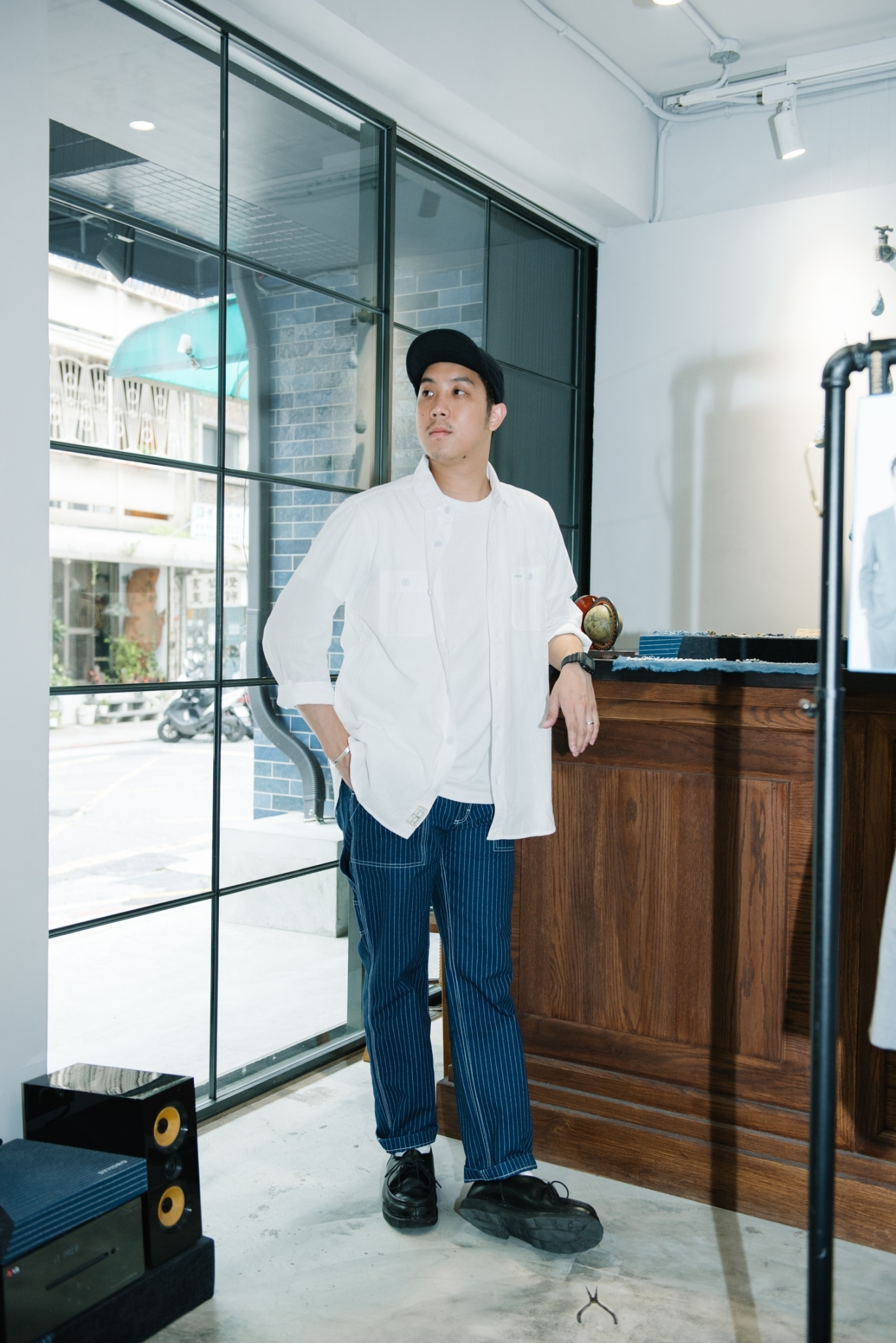 下身 “CHIC LABOUR” 單寧褲,不僅原色十分好搭之外,版型也是能夠融入各種風格的錐形褲型。