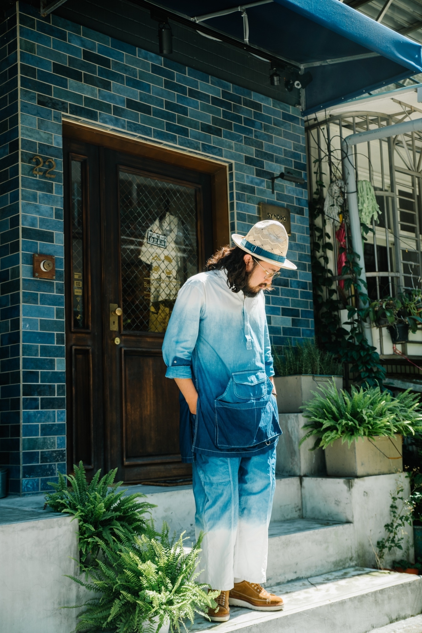 而今天就想以最熱愛的藍染去做搭配,上身 “SHAKA” 夏威夷衫配上藍染後更加沈穩,亞麻布料與之的配合創造出想像之上的高雅韻味,最後輔料以椰殼釦提出一些 vintage 氛圍。