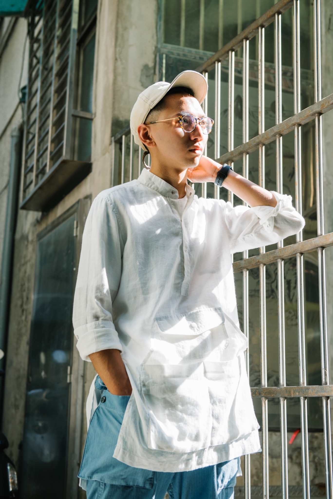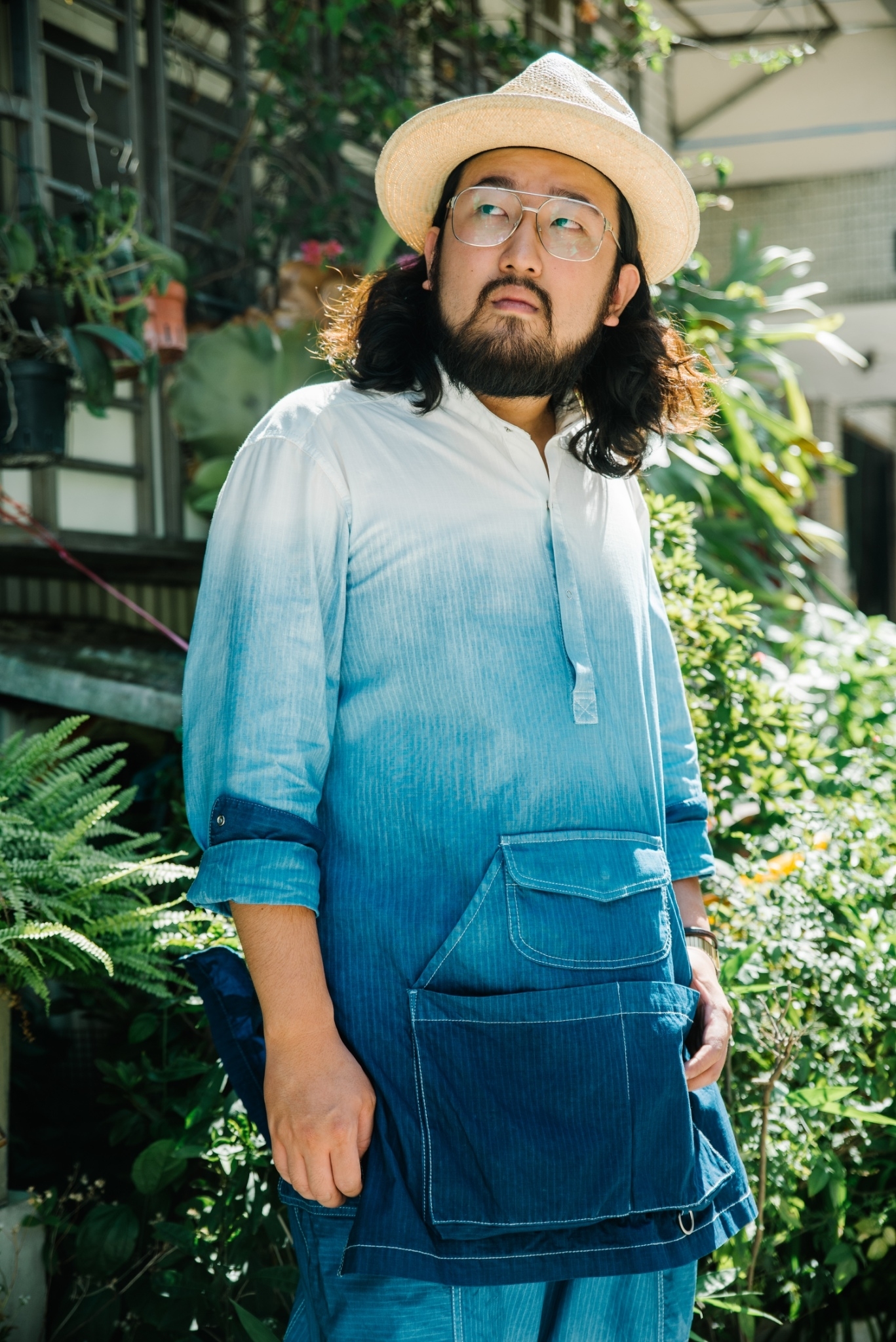 而下身的 “FOLK” 漁夫軍褲同樣的漸層藍染,配上寬鬆的版型設定,與 “WORKMAN” 圍裙襯衫相映出格外和諧、極具氣場的畫面。