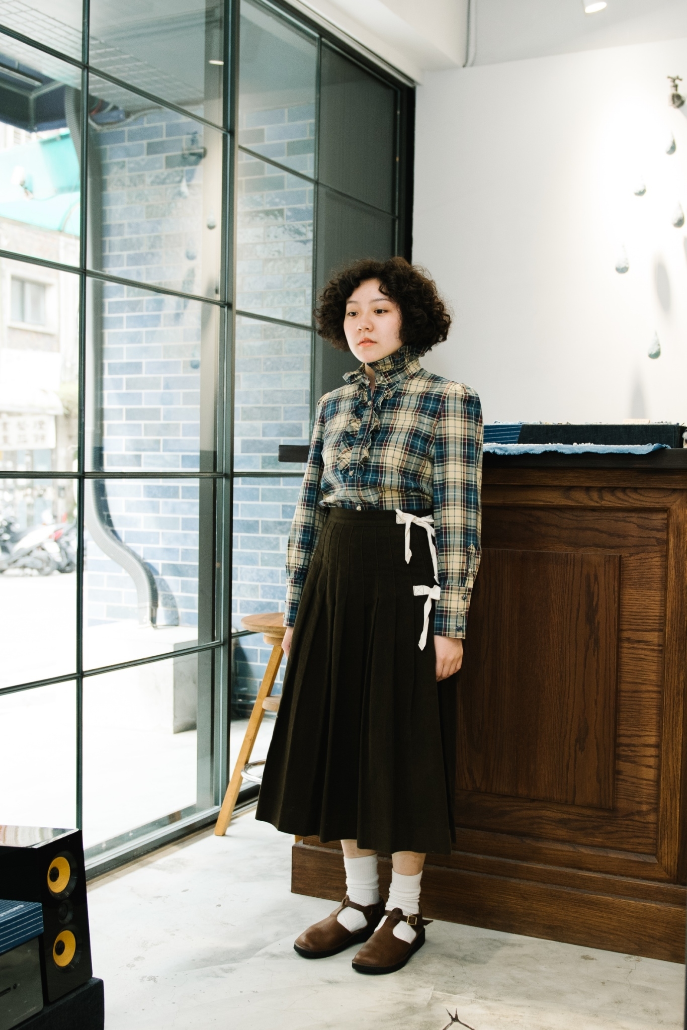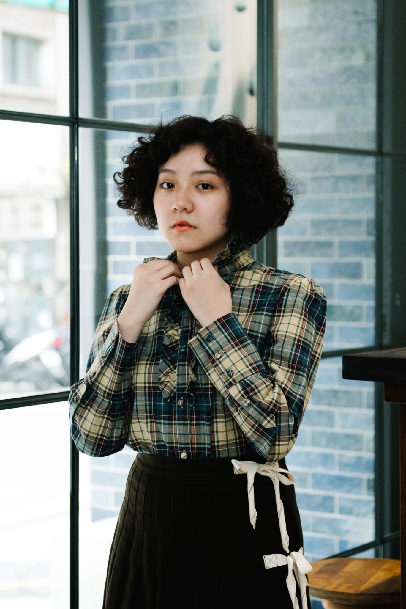 整身以優雅為基調去做搭配,上身 “The Gloriana” 立領襯衫參考 20 世紀中葉女性風行的 ruffle collar,融入現代女裝線條,尤其使用的格紋布料經水洗更添復古風味。