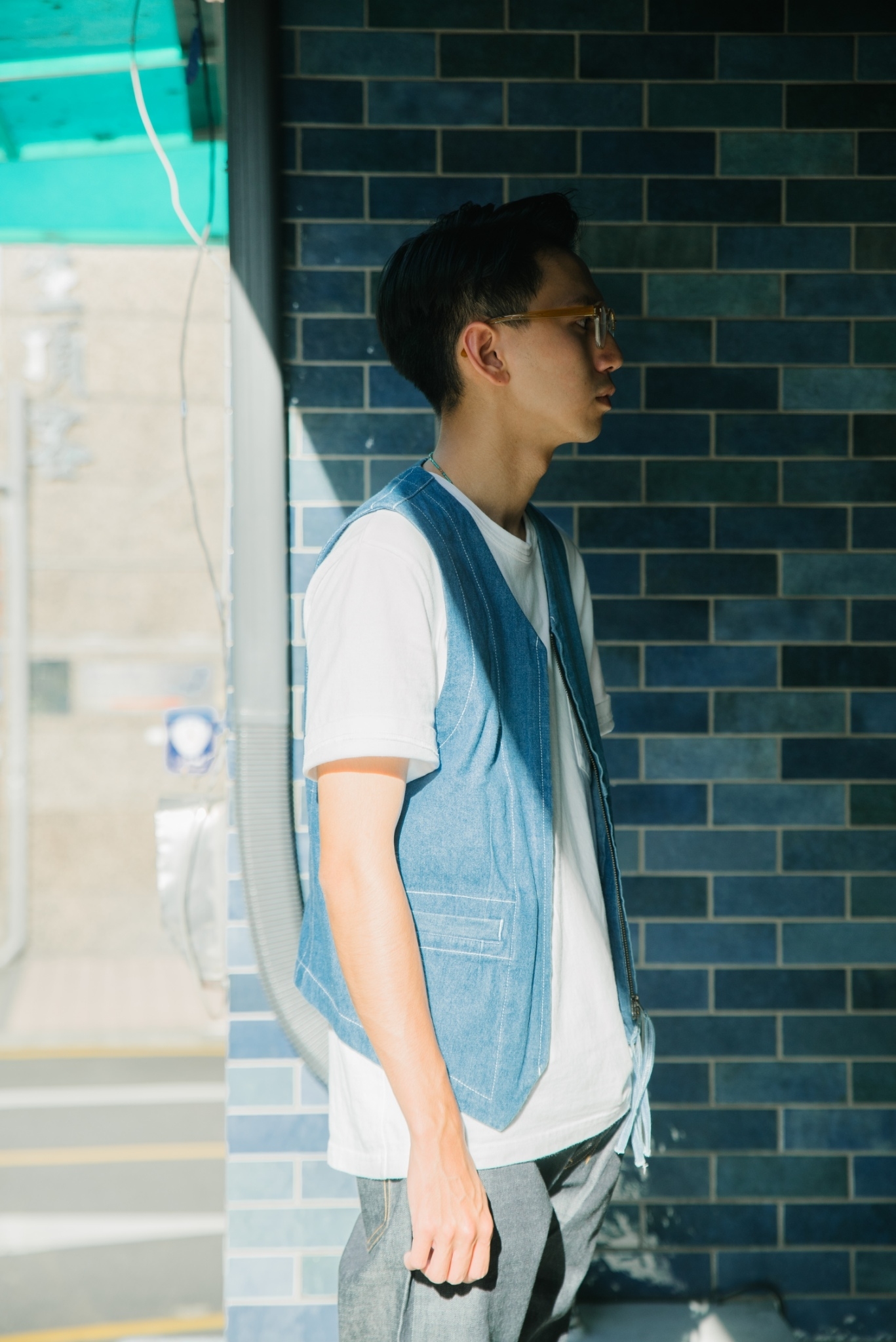 “BREATH HOLDER” 單寧背心以經典西裝背心外型發想,並加入了工裝元素進行調製,布料上更是選用日製丹寧與亞麻混紡 chambray ,以四種不同深淺的藍進行拼接,形塑成風格強烈,卻又平易近人的單品,上身以簡單白 T 打底,配上背心後視覺上便十分豐富。