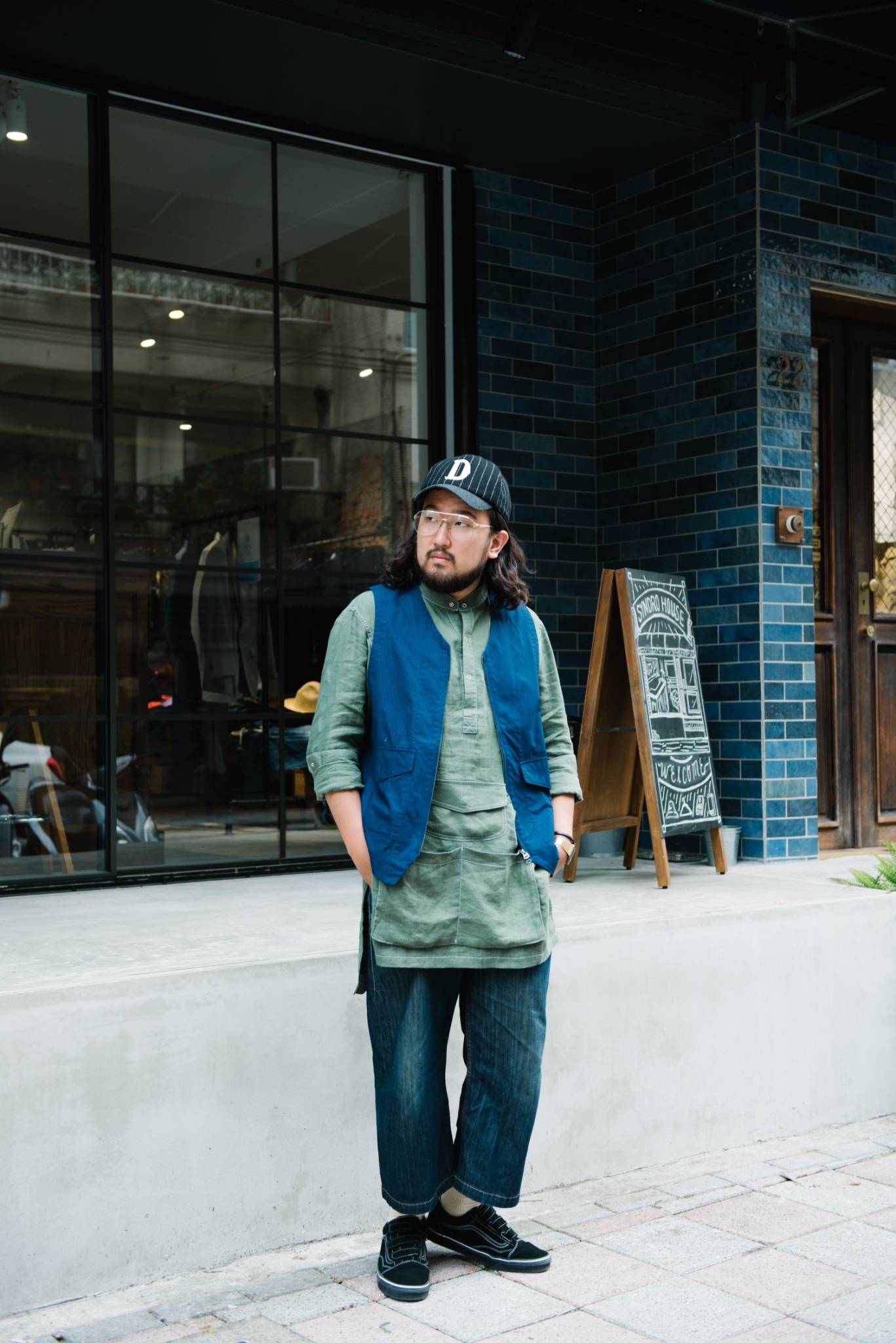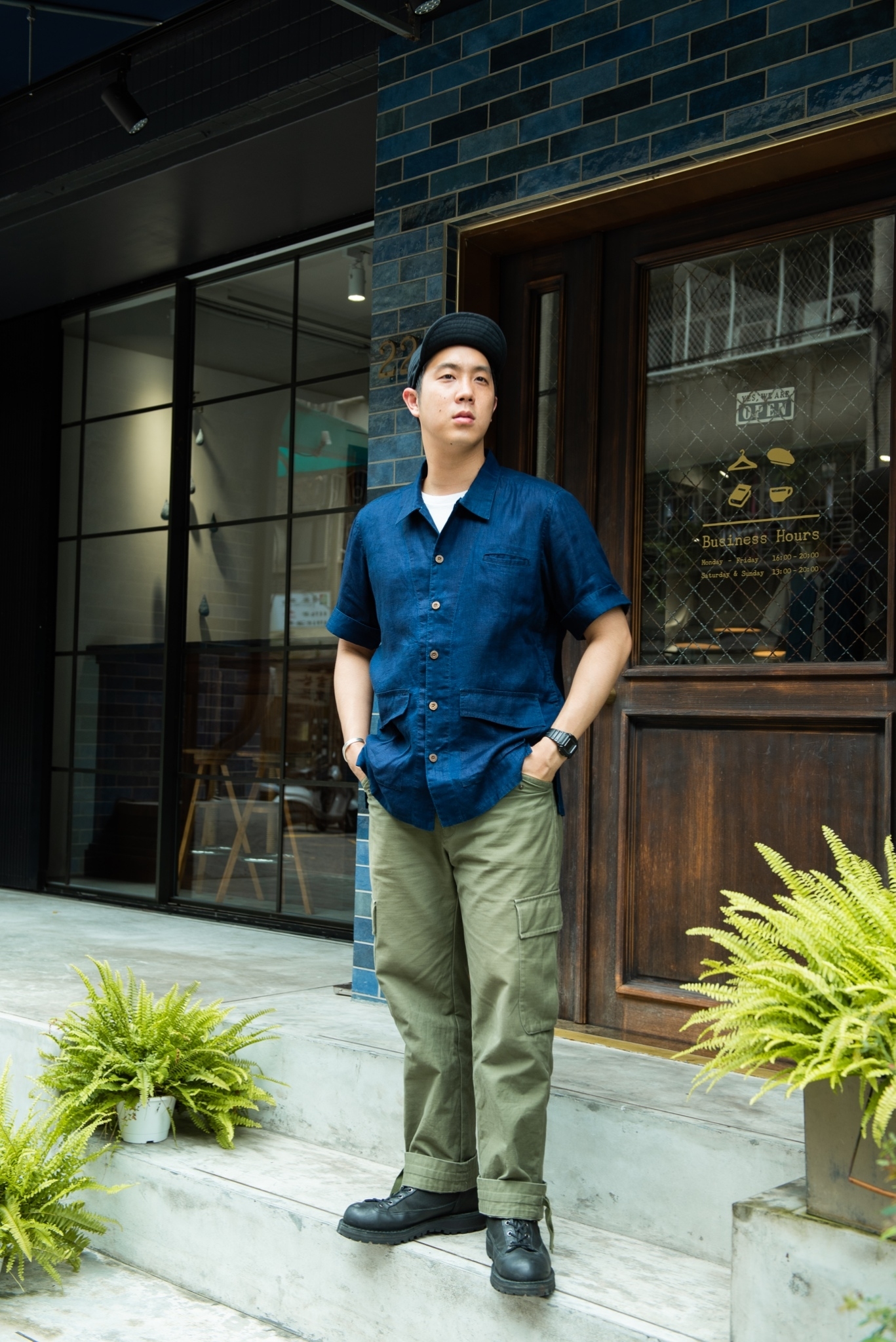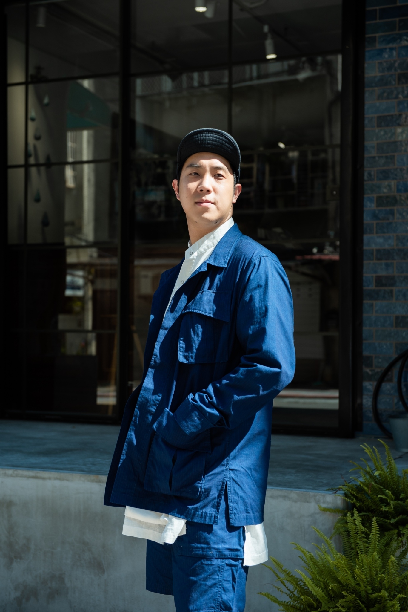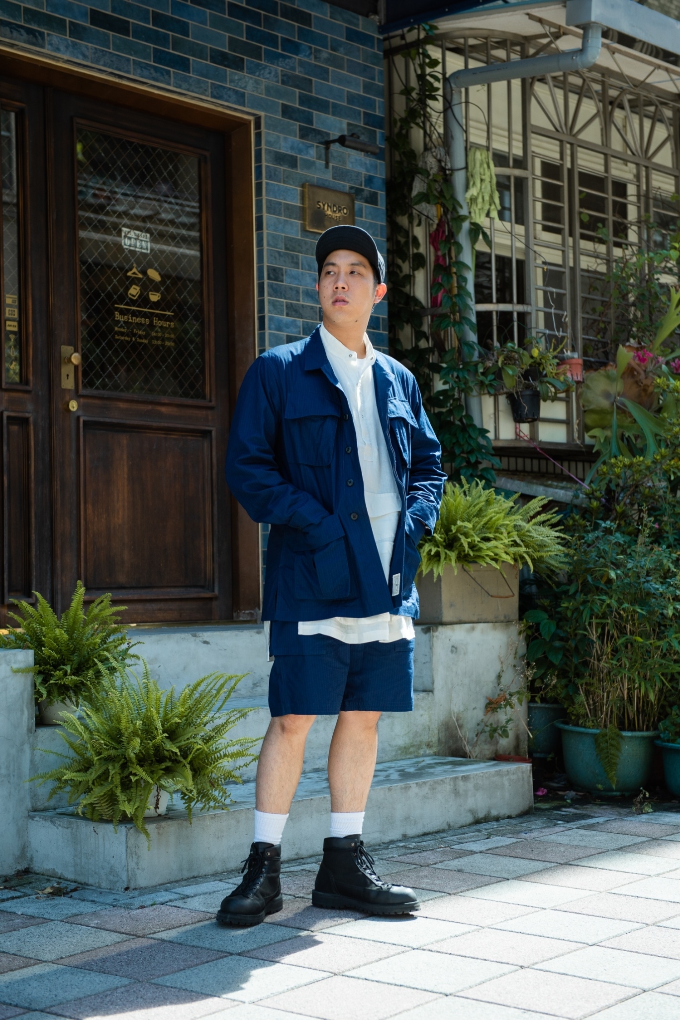 這次小小地在顏色上下了些苦心,外罩的 “JUNGLE” 六口袋夾克與下身 “HYPERFUNCTION” 軍短褲皆使用純棉藍染抗撕裂布,內搭 “WORKMAN” 圍裙襯衫,純白色系與腳上的襪款上下呼應。
