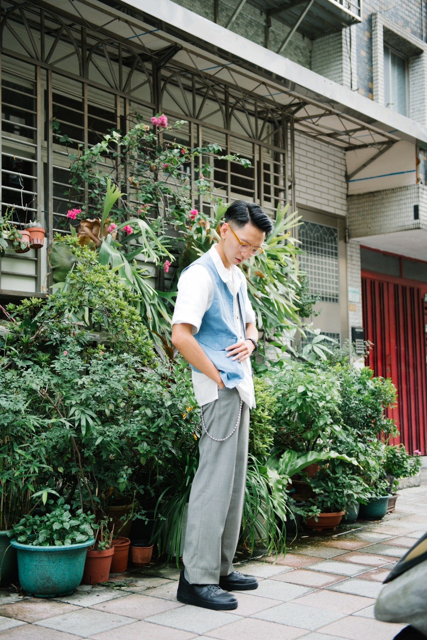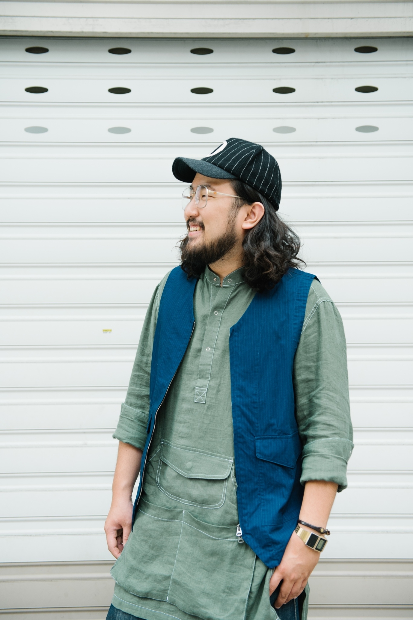 今天身著十分適合夏天的日製亞麻布料單品 “WORKMAN” 圍裙襯衫作為最靠近肌膚的首層,柔軟蓬鬆的布料結構、天然的材質纖維不貼身也舒適透氣,外罩 “COMMANDO” 軍裝背心,雖說是軍裝背心,但同時又帶著西裝的輪廓,配合抗撕裂布面料,營造出機能感及濃厚的復古風味。