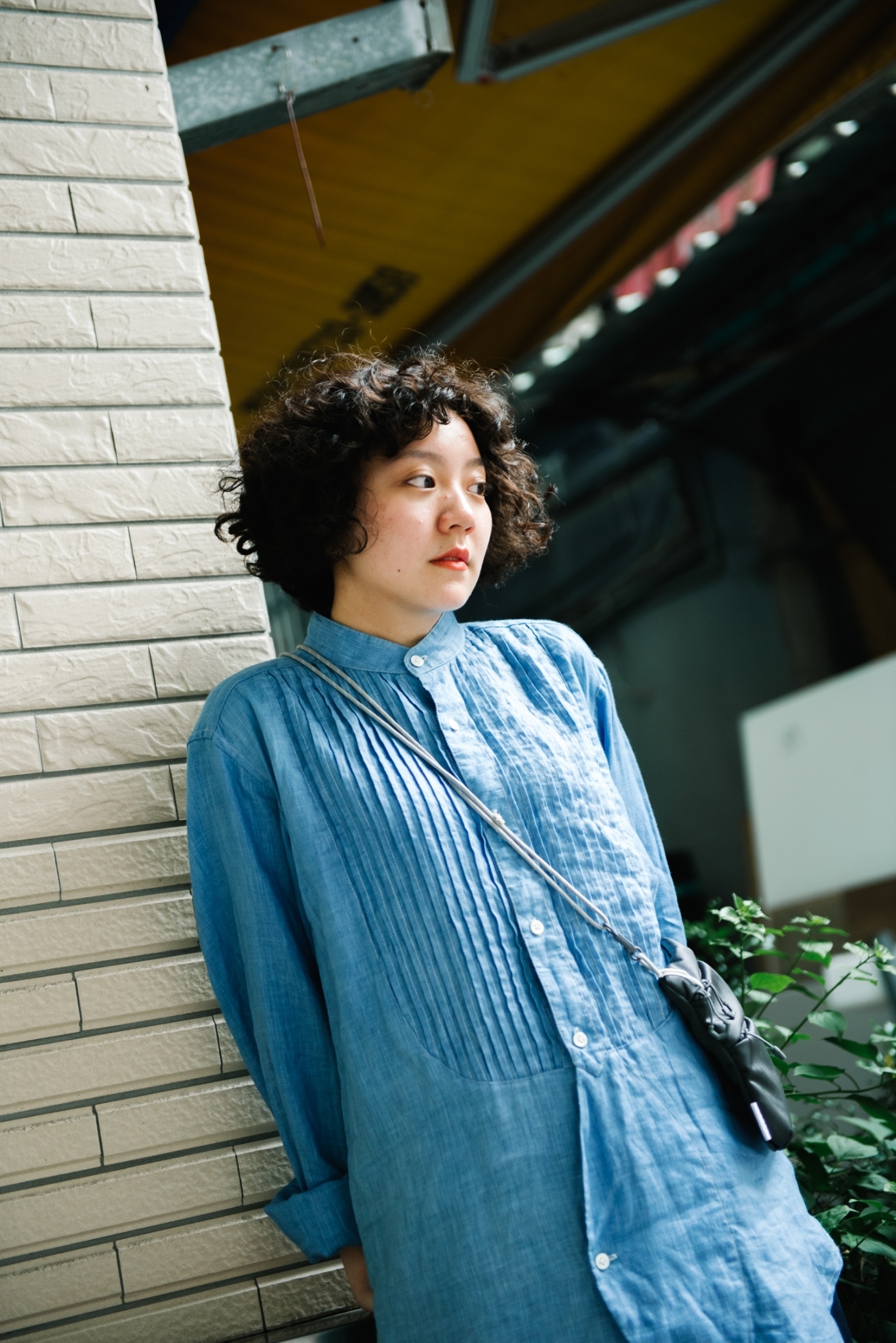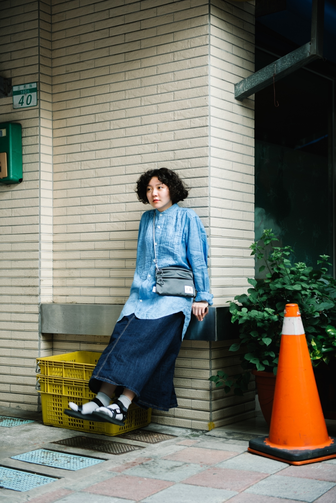 對於較小隻的女生來說略長的衣長,剛好能輕鬆地與下身的丹寧裙、涼鞋進行較休閒的搭配,再斜背較為機能感的涼鞋,讓整體完整度更高一些。