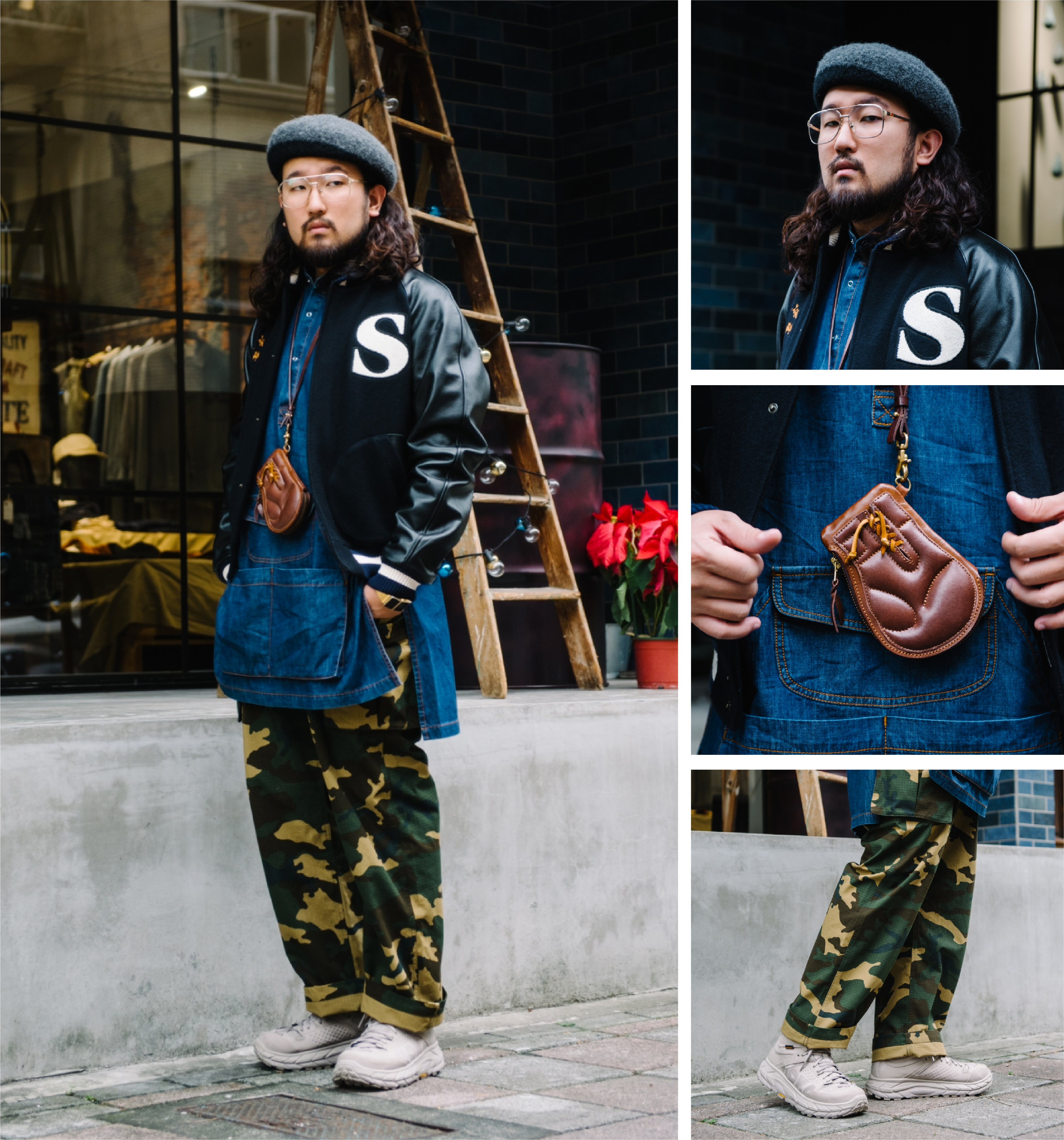 「率性的皮革棒球外套配上醒目的迷彩軍褲,跳脫平時的穿搭法則。」