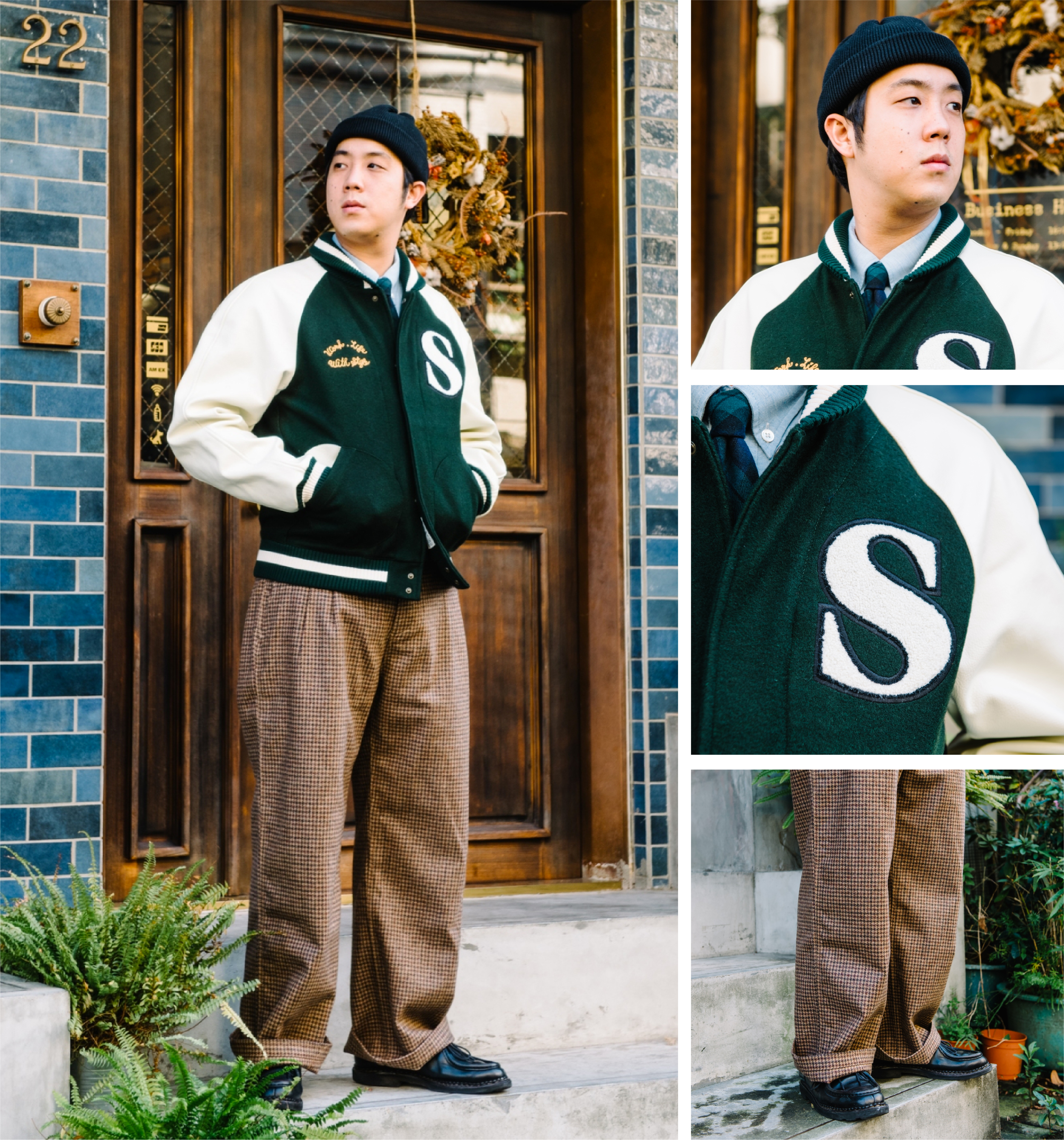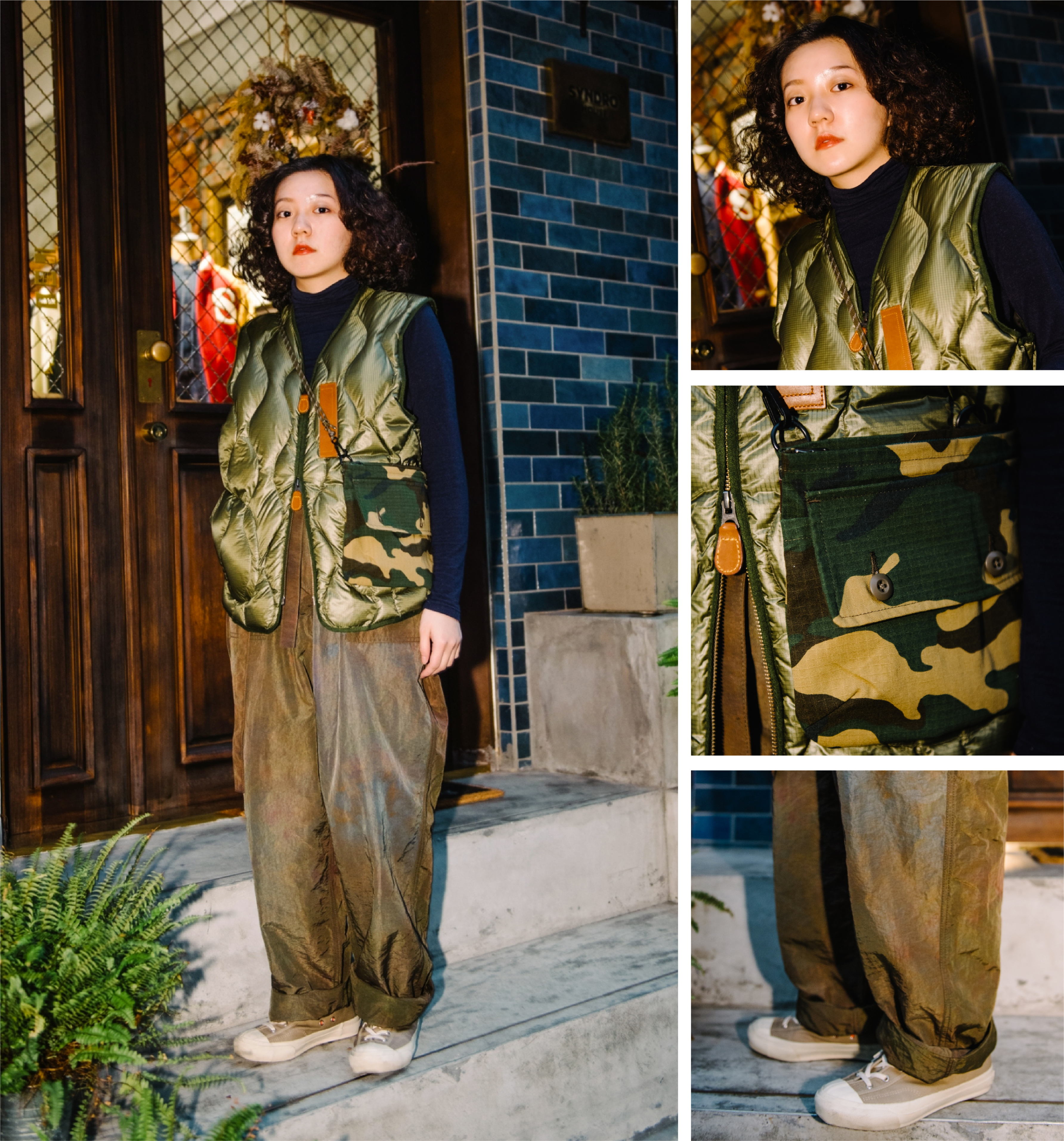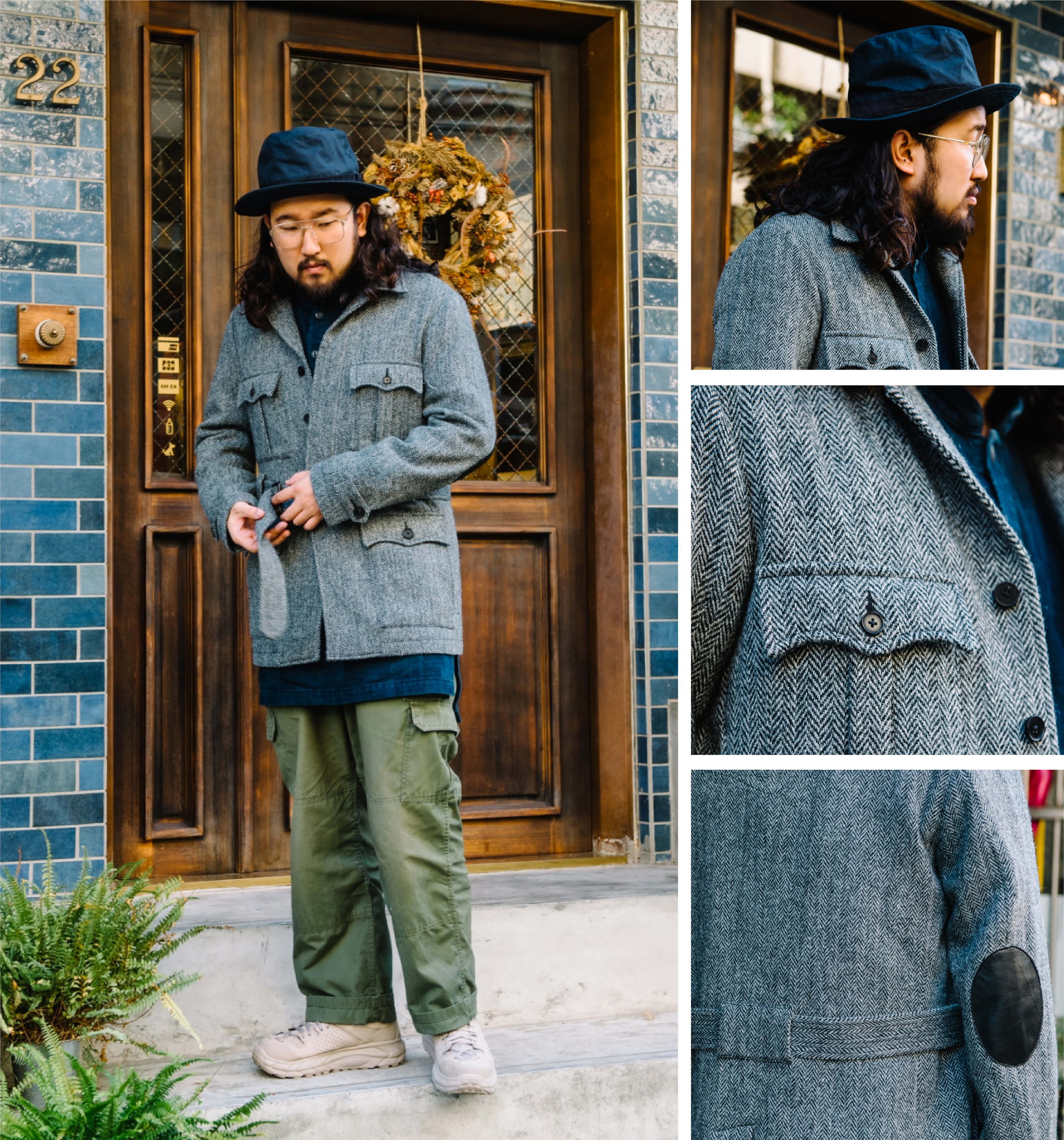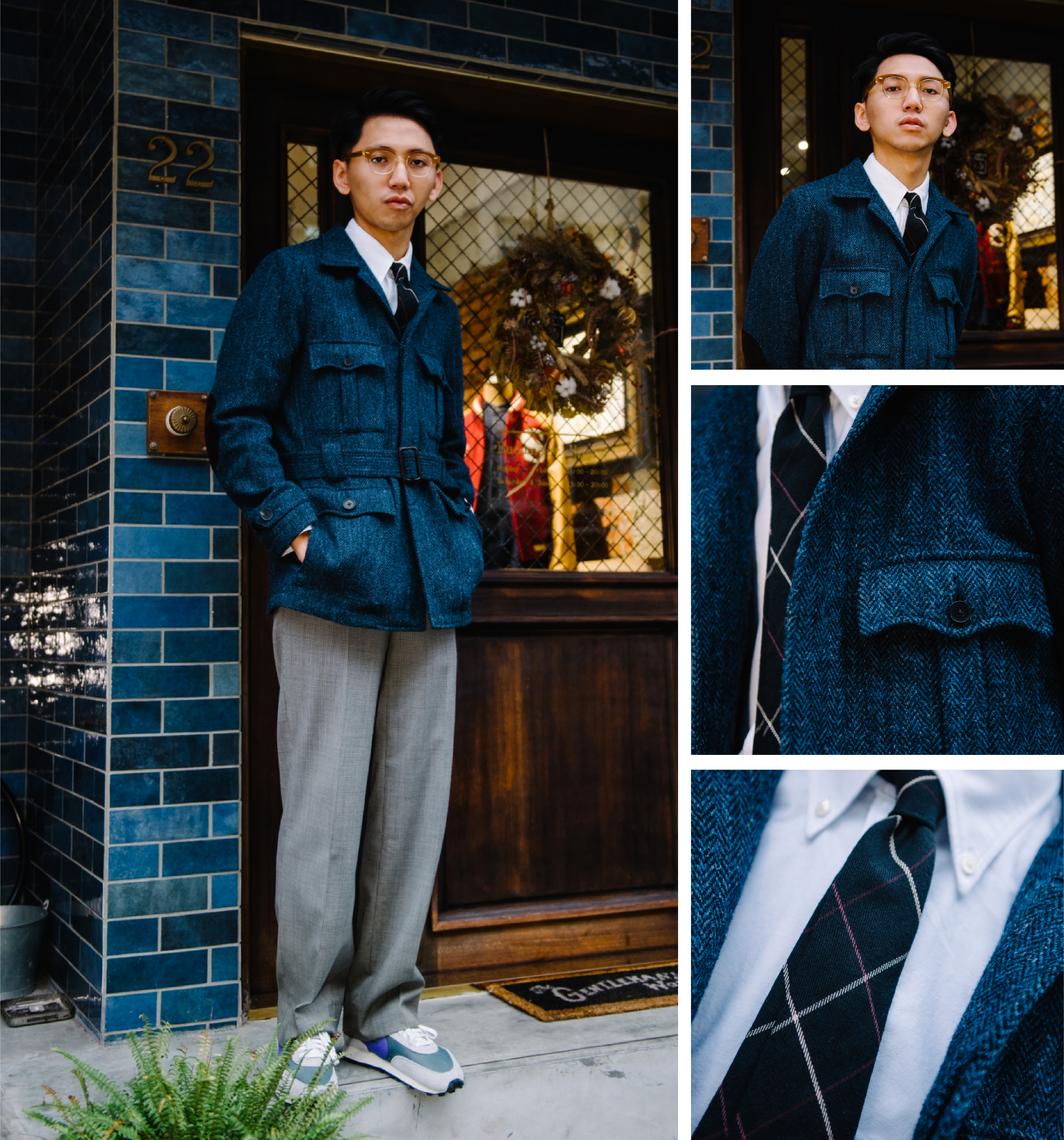 「獵裝夾克配上寬版軍褲營造出別種粗獷氛圍。」