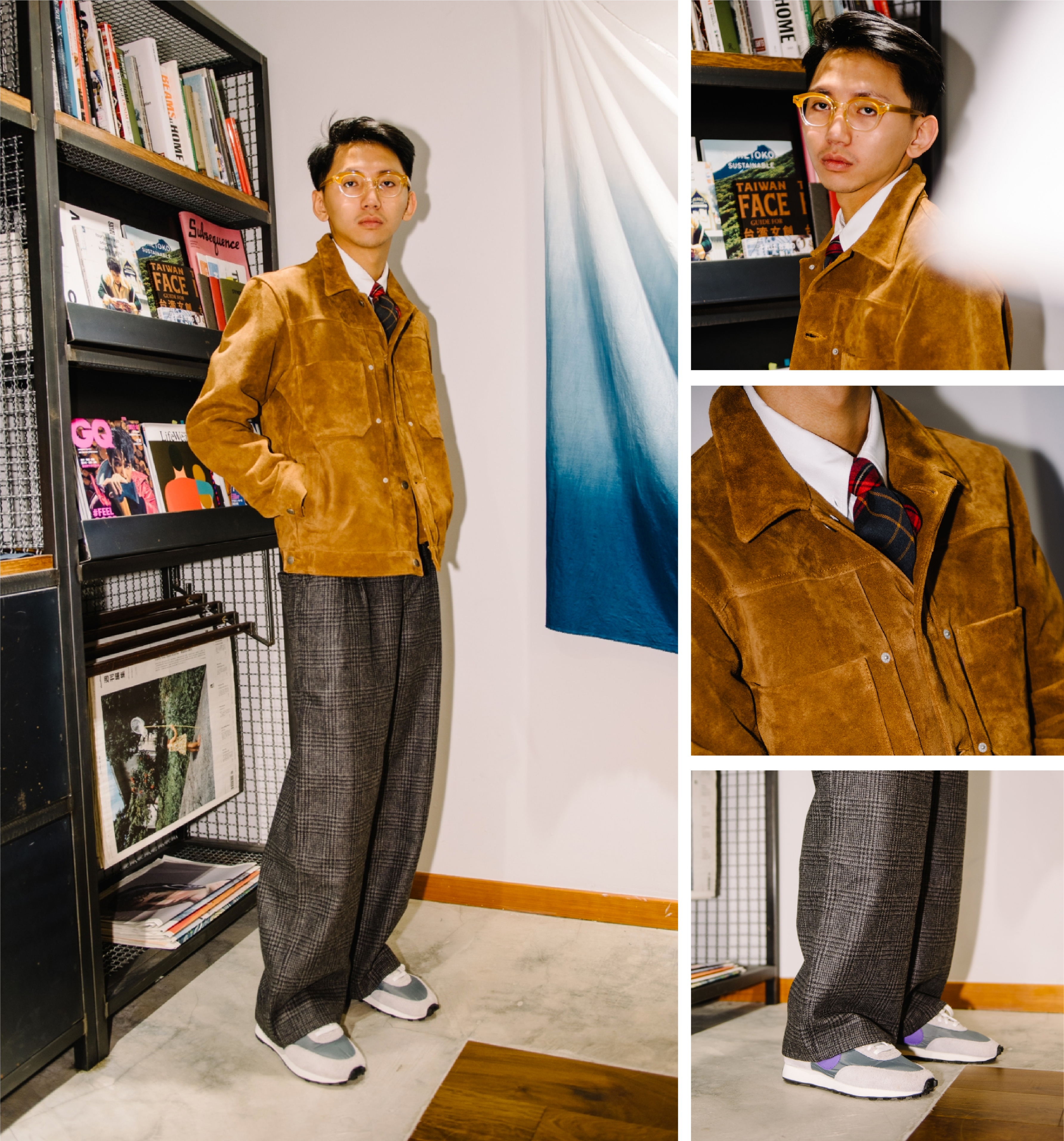 「麂皮夾克、毛料格紋寬褲,最後踩雙厚底球鞋帶出反差感。」