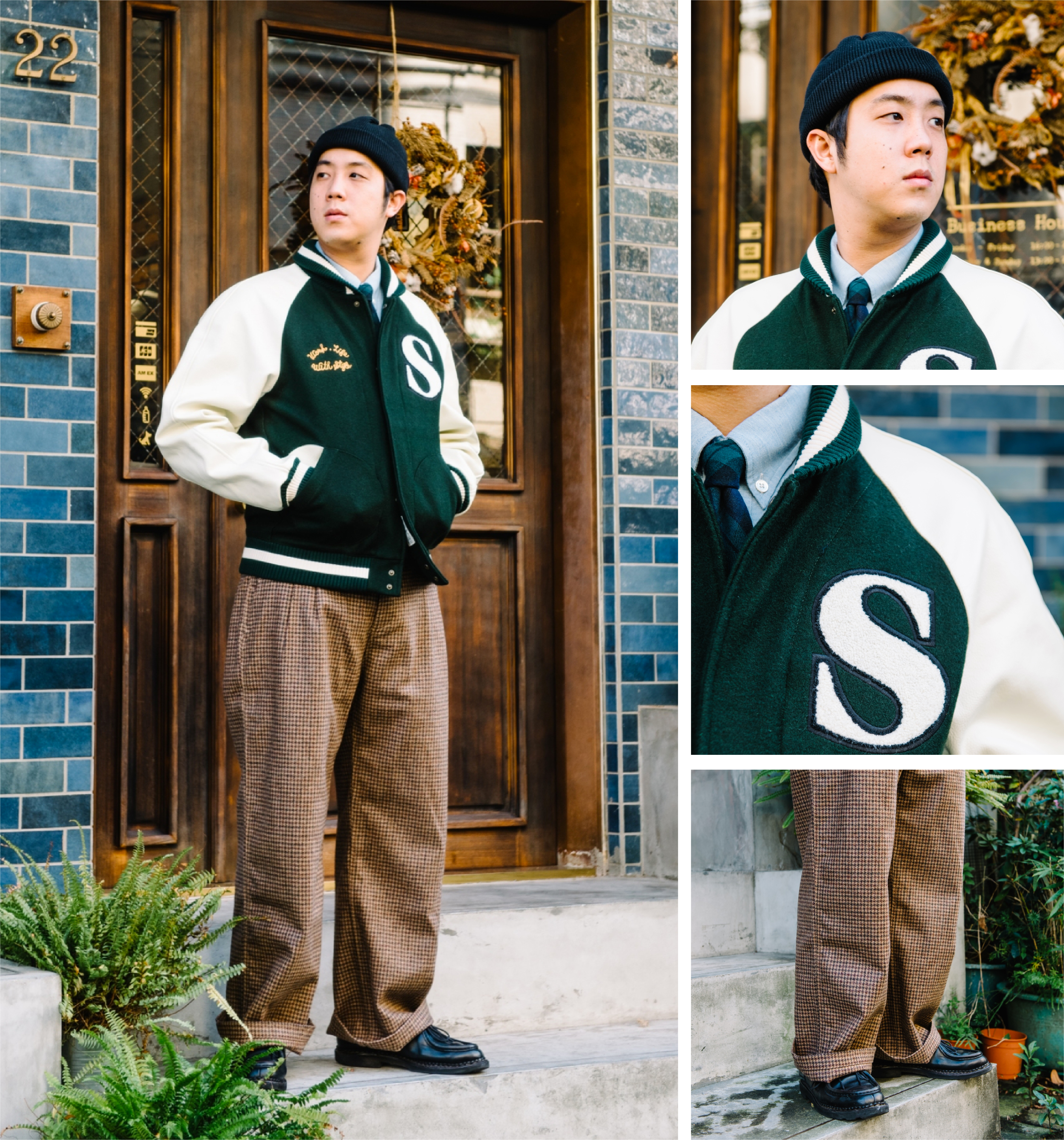 「在美式的學院風格當中加入歐式輪廓的毛呢寬褲的混搭造型。」