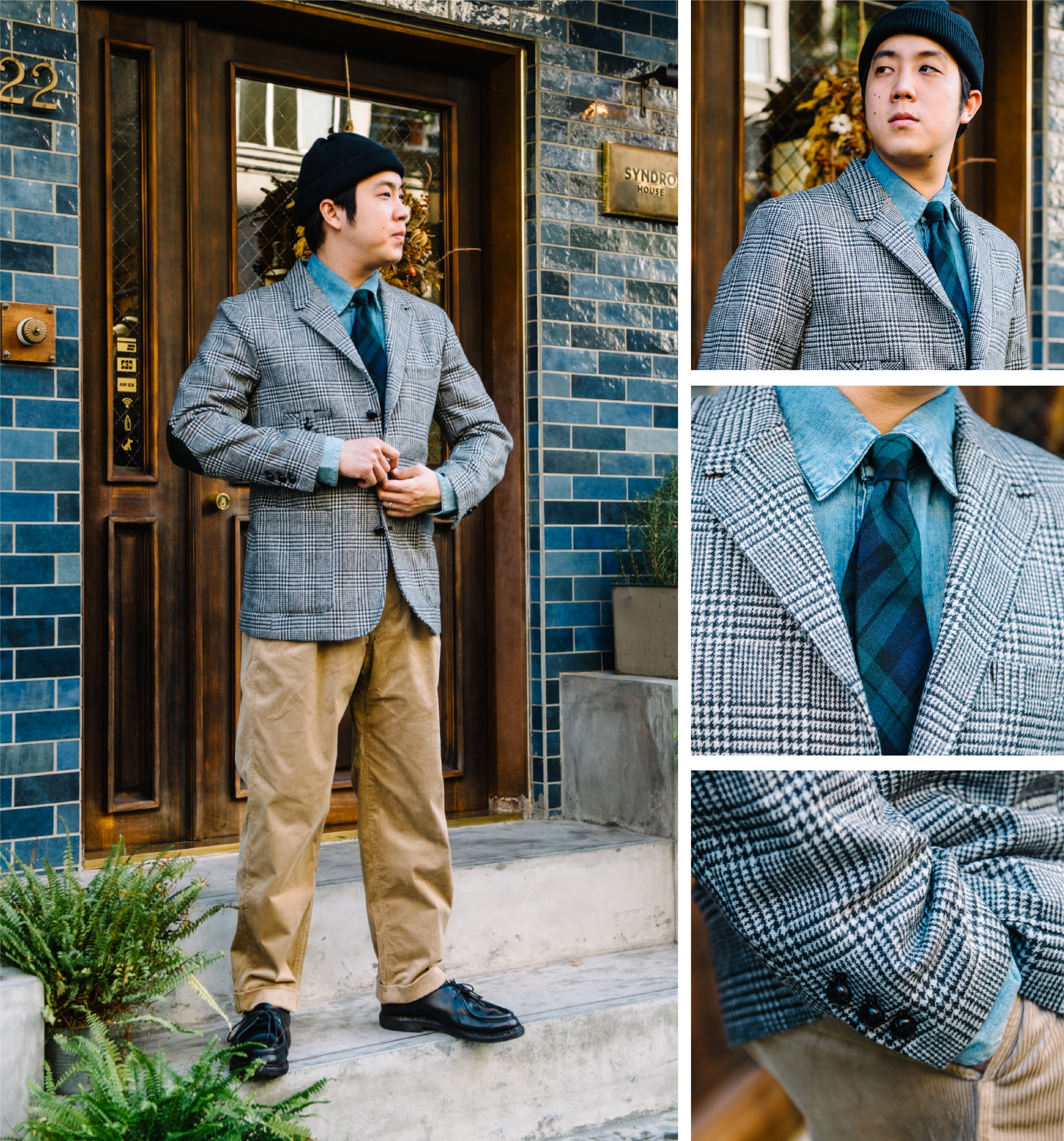 「用獵裝外套在打褶燈芯絨攀岩褲與牛仔襯衫的休閒穿搭加了一些正式感。」
