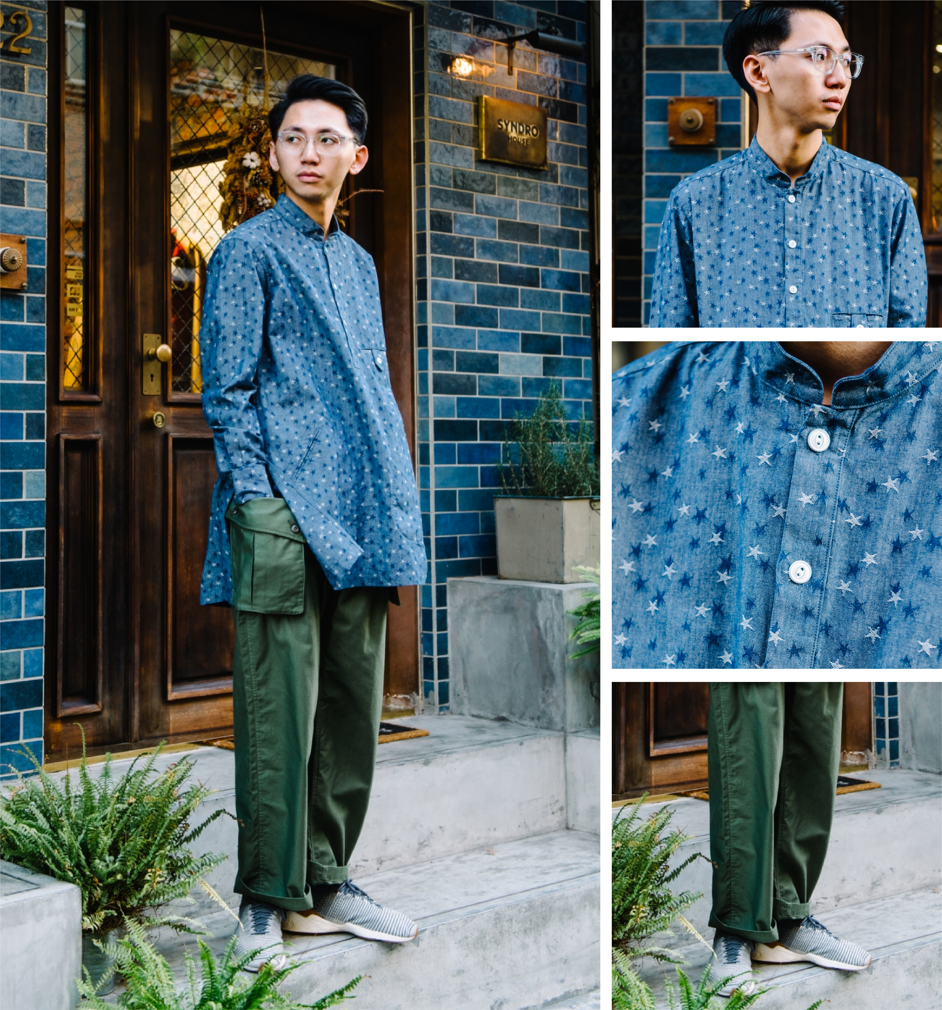 「上身滿版的長版提花襯衫,搭配上 syndro 本季最新的軍褲,讓原本的 casual 風格更硬派一些。」