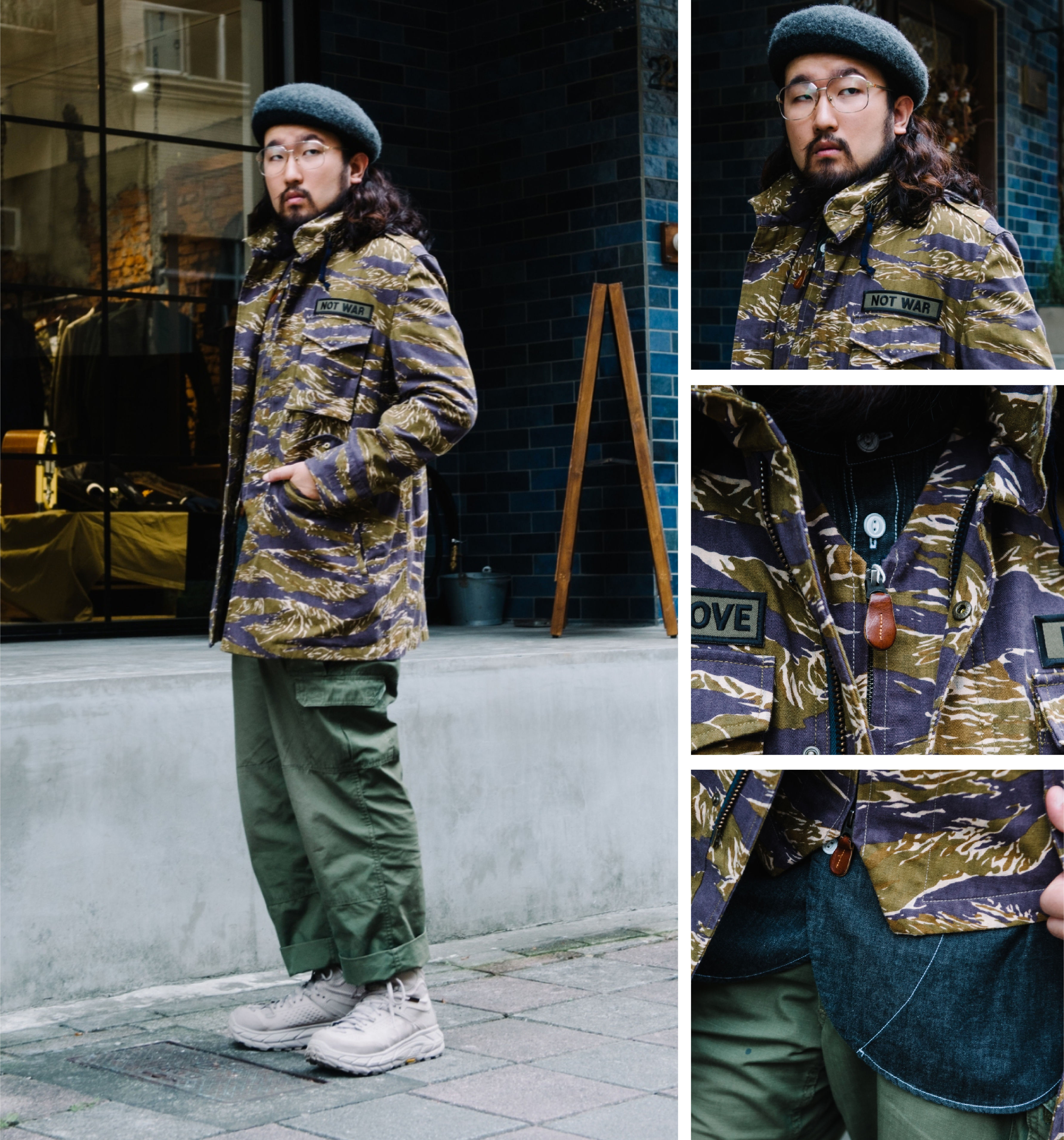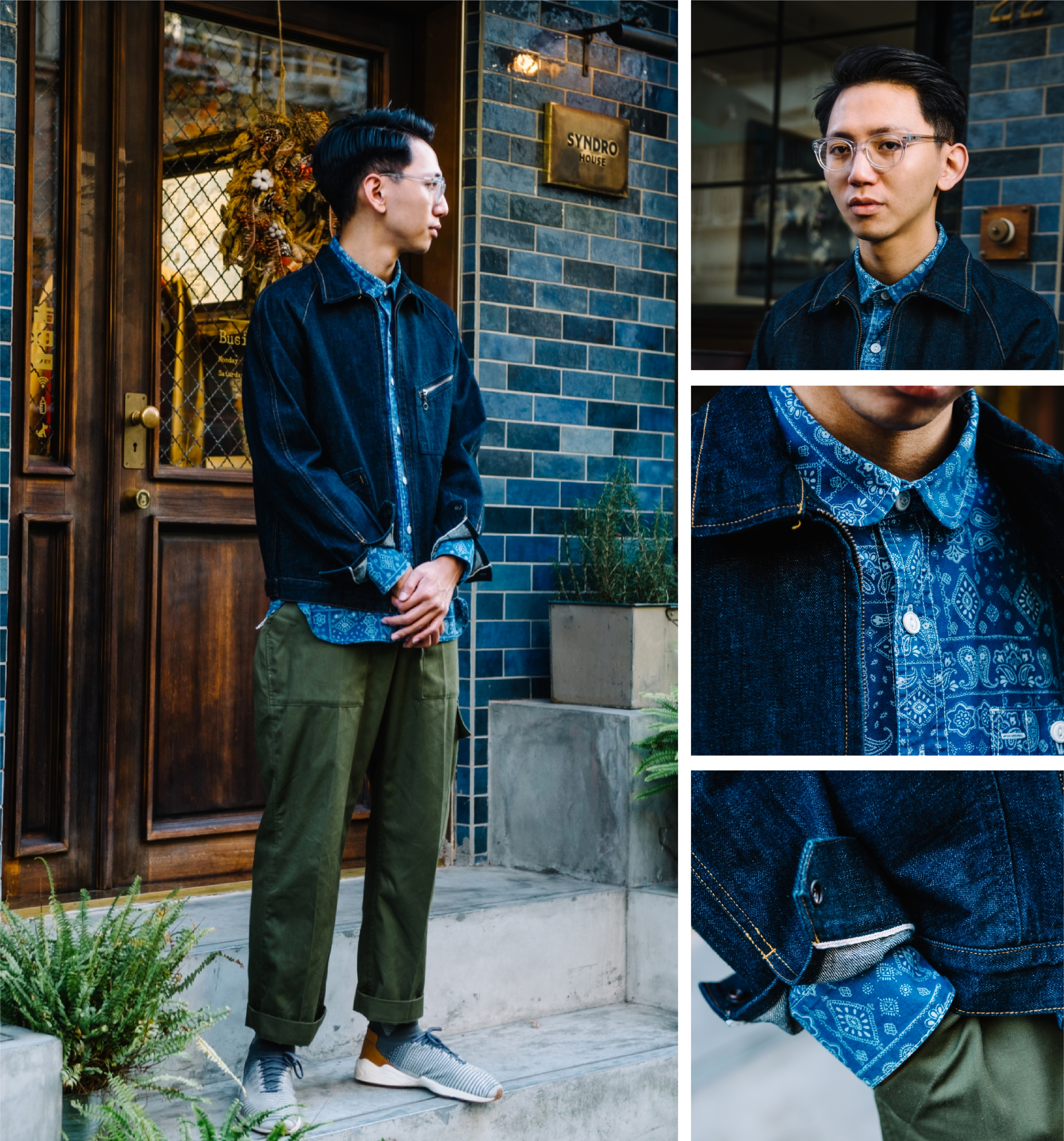 「沈穩的丹寧與軍綠之間,夾雜了視覺強烈的變形蟲襯衫,輕鬆塑造硬派風格。」
