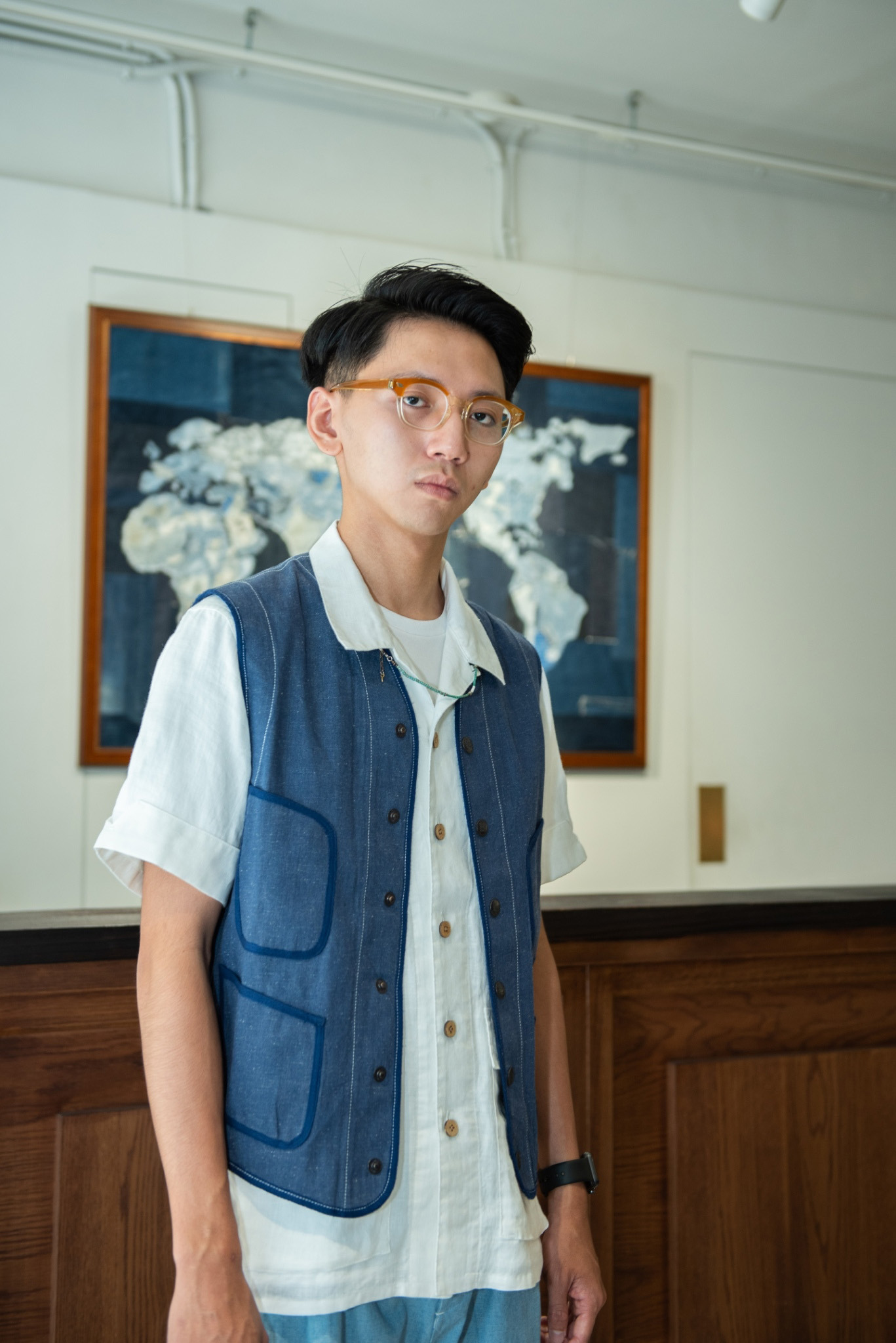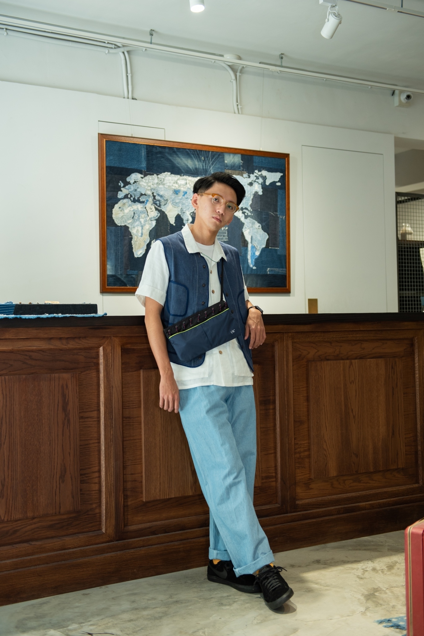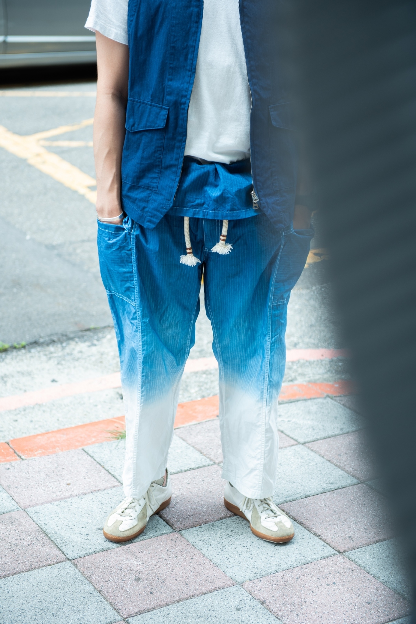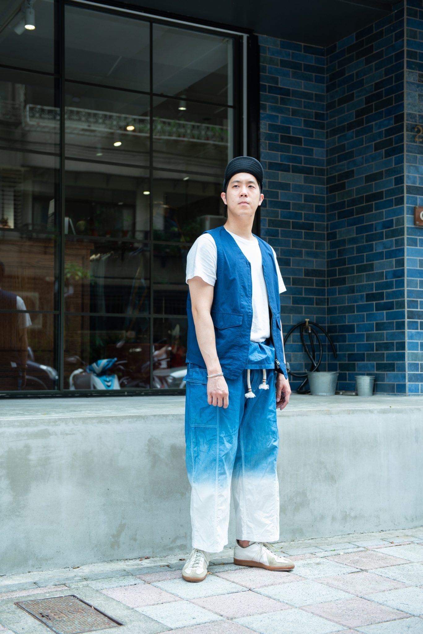 藍色與素淨的白已列入自己最愛的配色選擇之一,上身利用深色 midnight 配色 “COMMANDO” 軍裝背心、與內搭短 T 顏色形成較強對比,下身 “FOLK” 漁夫褲的漸層藍染由上延伸而下,剛好落在褲腳處的白色與上身內搭呼應,順著視線,最後以德軍訓練鞋的優雅氣質來收尾。