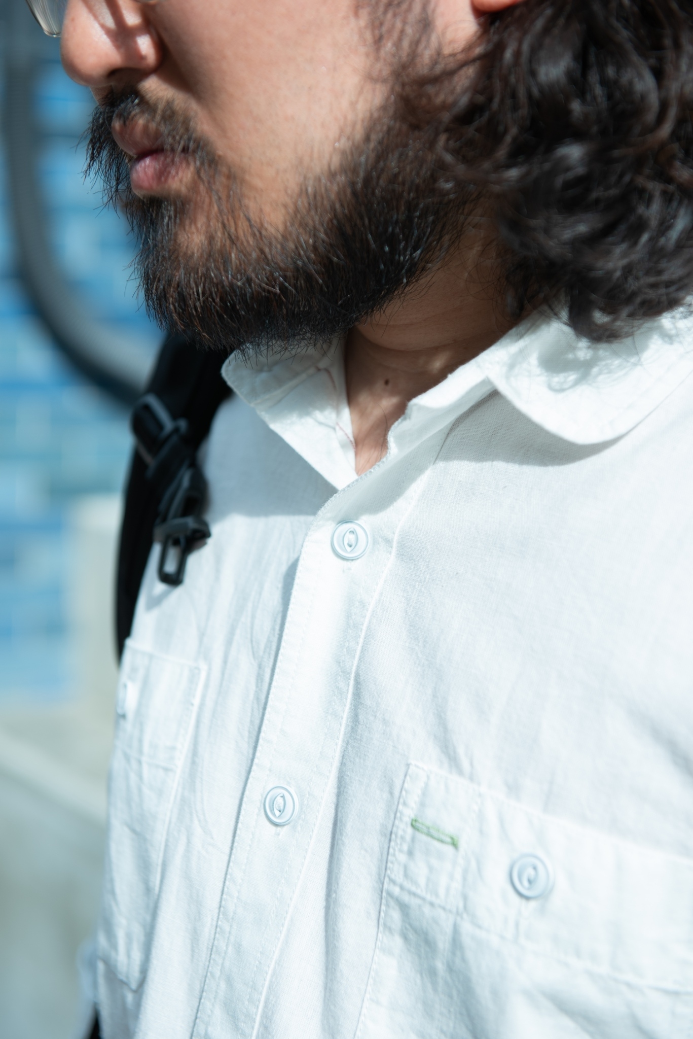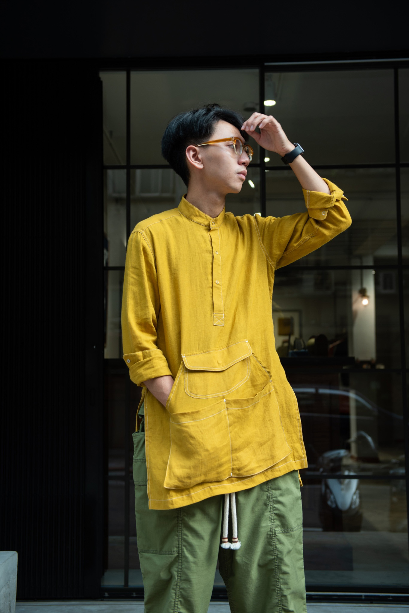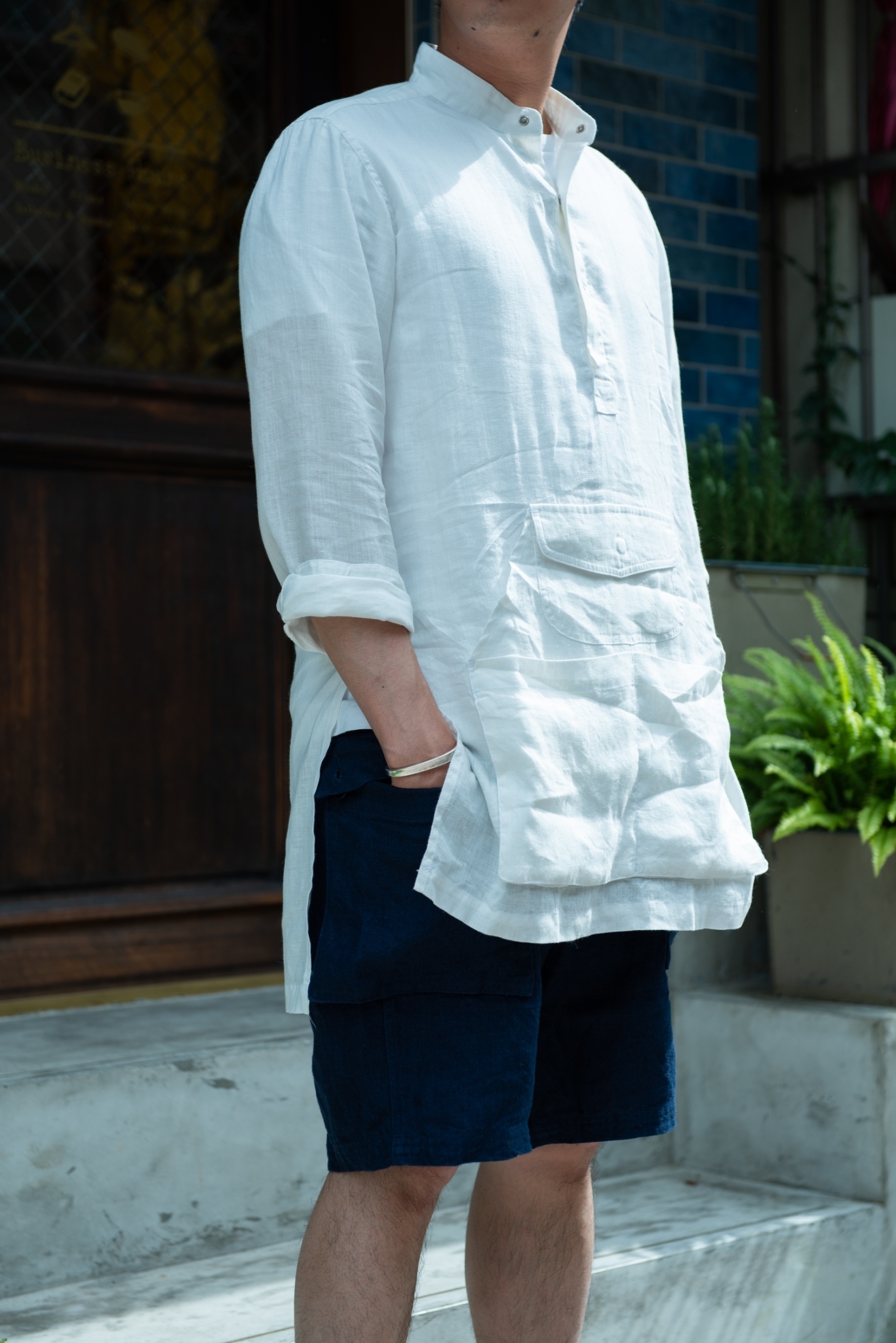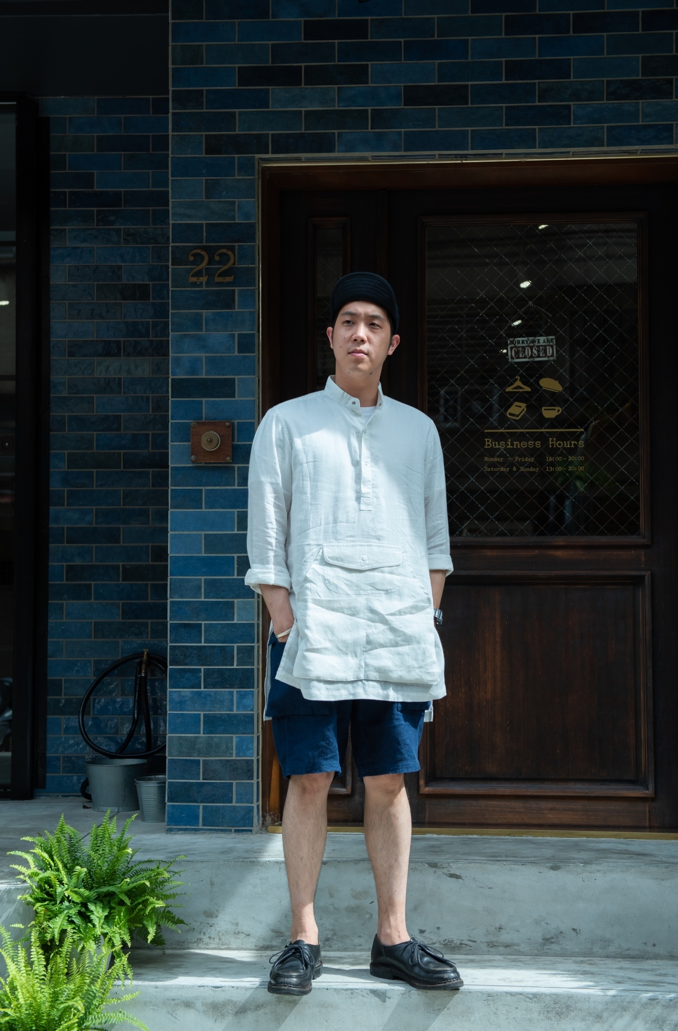 服裝作為最貼近肌膚的物品,最能第一時間感受的便是布料,亞麻是自己私心相當喜愛的面料,舒適之餘外觀也給人種素雅的感覺。輕鬆套上 “WORKMAN” 圍裙襯衫、“HYPERFUNCTION” 軍短褲與皮靴,看起來大器也帶份寧靜的質感,在感受上更是舒心愜意。
