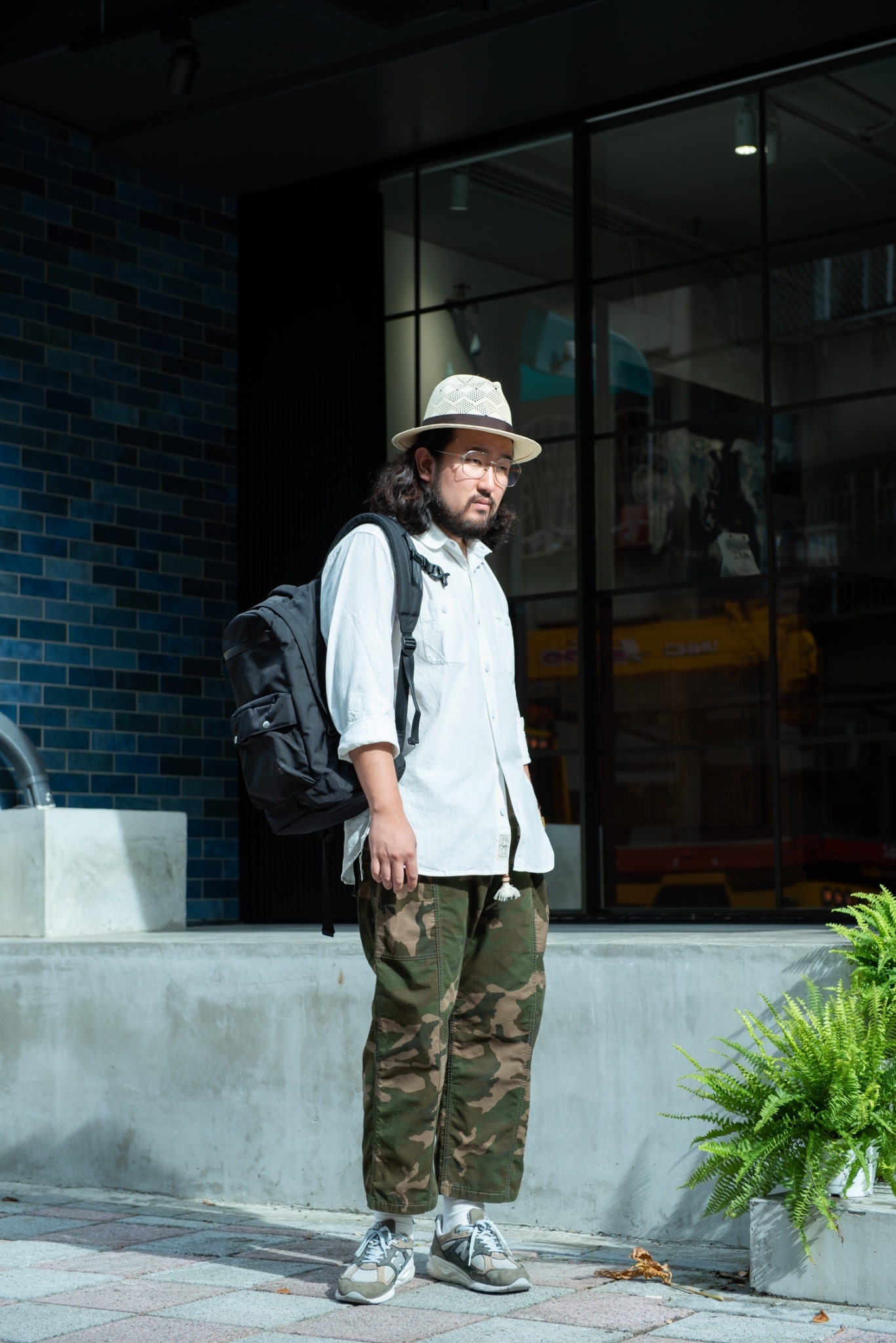 首先是草編巴拿馬帽就定調些微度假、率性的氛圍,再來清爽的 “OLD MINER” 工作襯衫和 “FOLK” 漁夫軍褲,樸實耐用的 chambray 與日製迷彩 ripstop 布料兩者皆呈現著濃厚的老味,最後再踩雙球鞋和大容量後背包,機能性十足,與這時的夏日格外合拍!