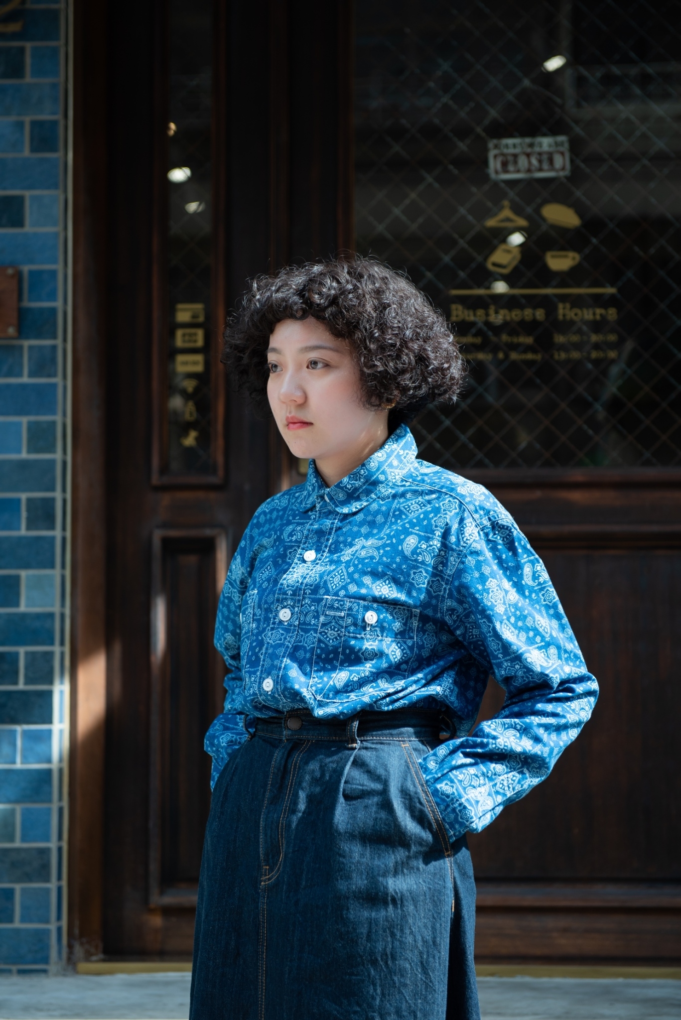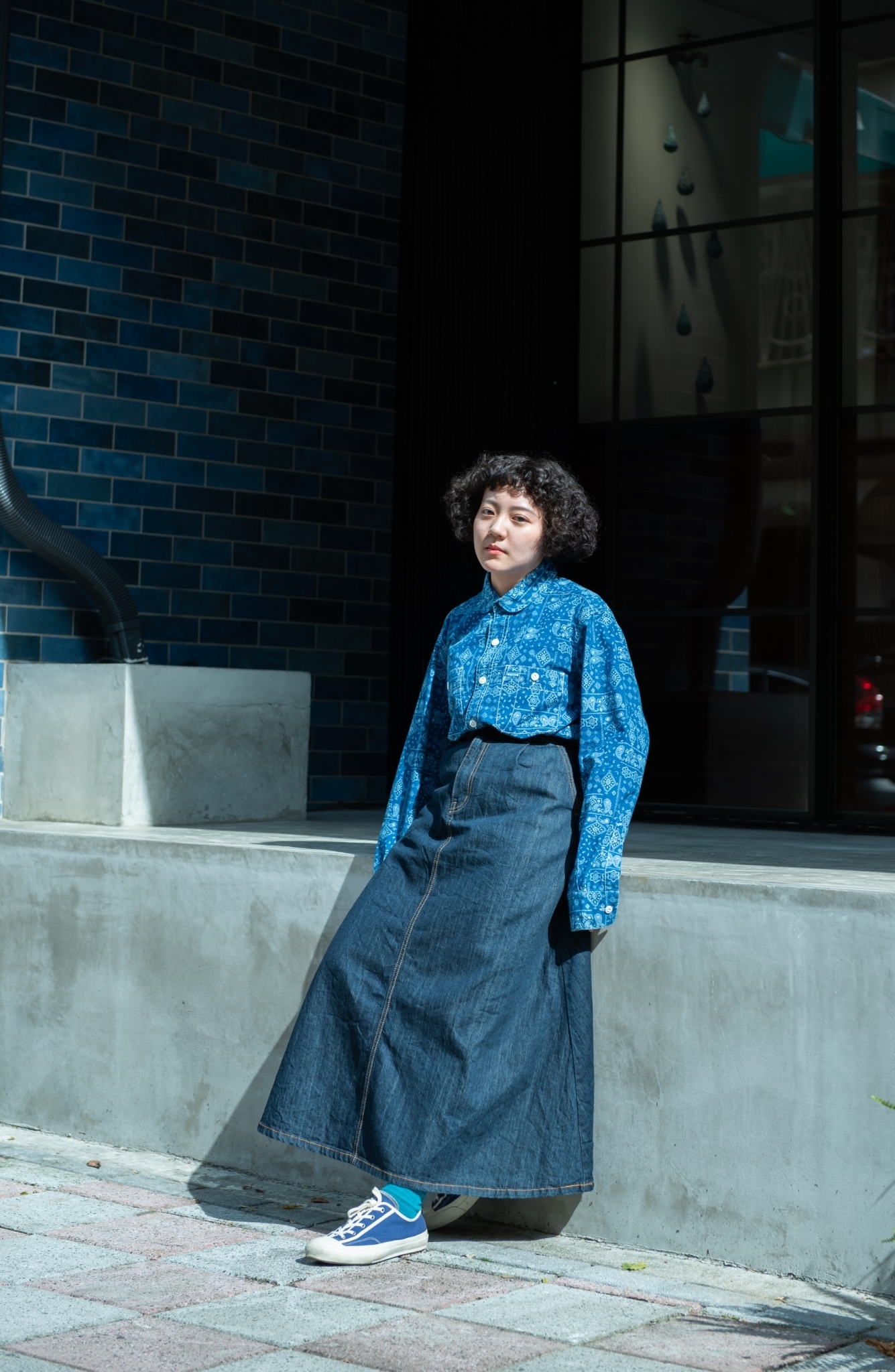 整身以不同質感的藍色調來搭配,“OLD MINER” 工作襯衫拔染工法製成的滿版變形蟲花紋視覺張力較強,不過下身配上單寧面料裙子,並把襯衫紮進去,氛圍一下子變得柔和起來,就算是濃厚工裝味的單品,女生穿起來也好上手。