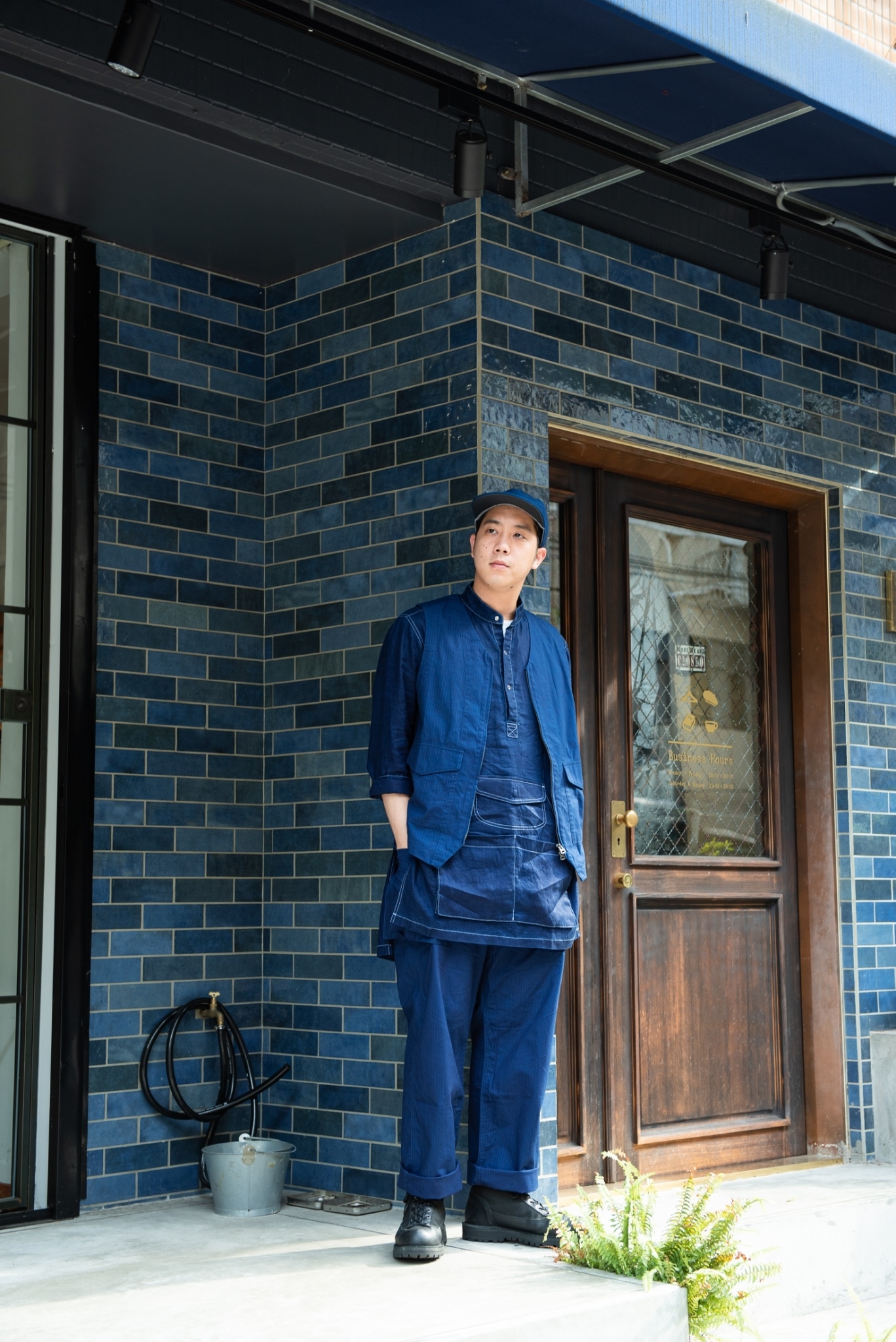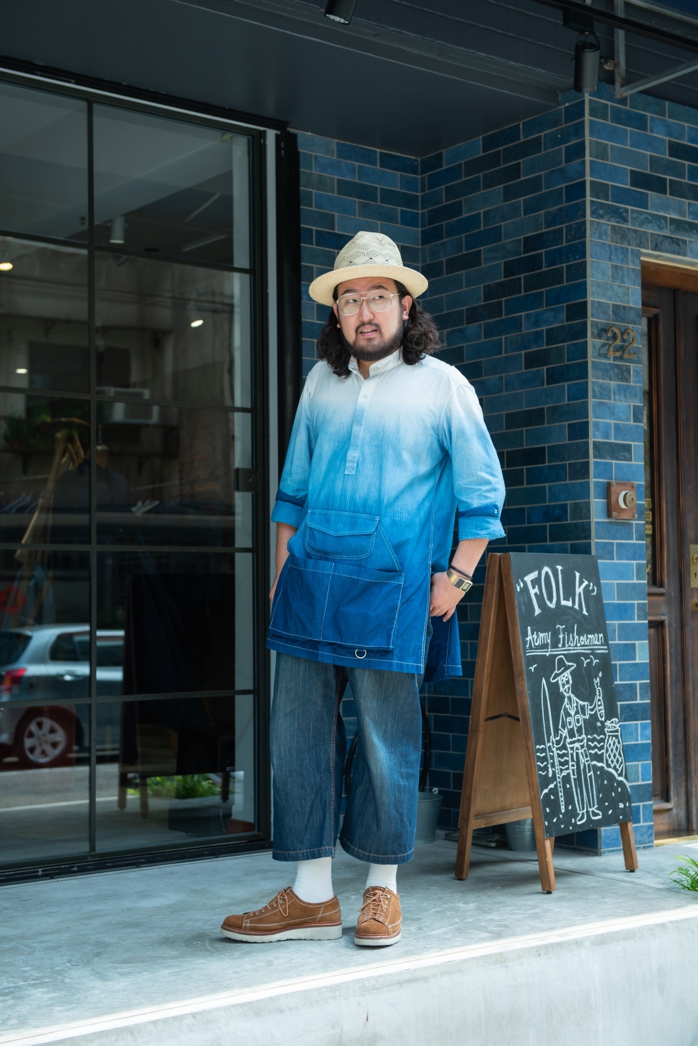 “WORKMAN” 圍裙襯衫套上漸層的藍染濾鏡,由上至下飽滿的藍逐漸濃郁,在袖子上折後也在一片藍海中製造出層次感。