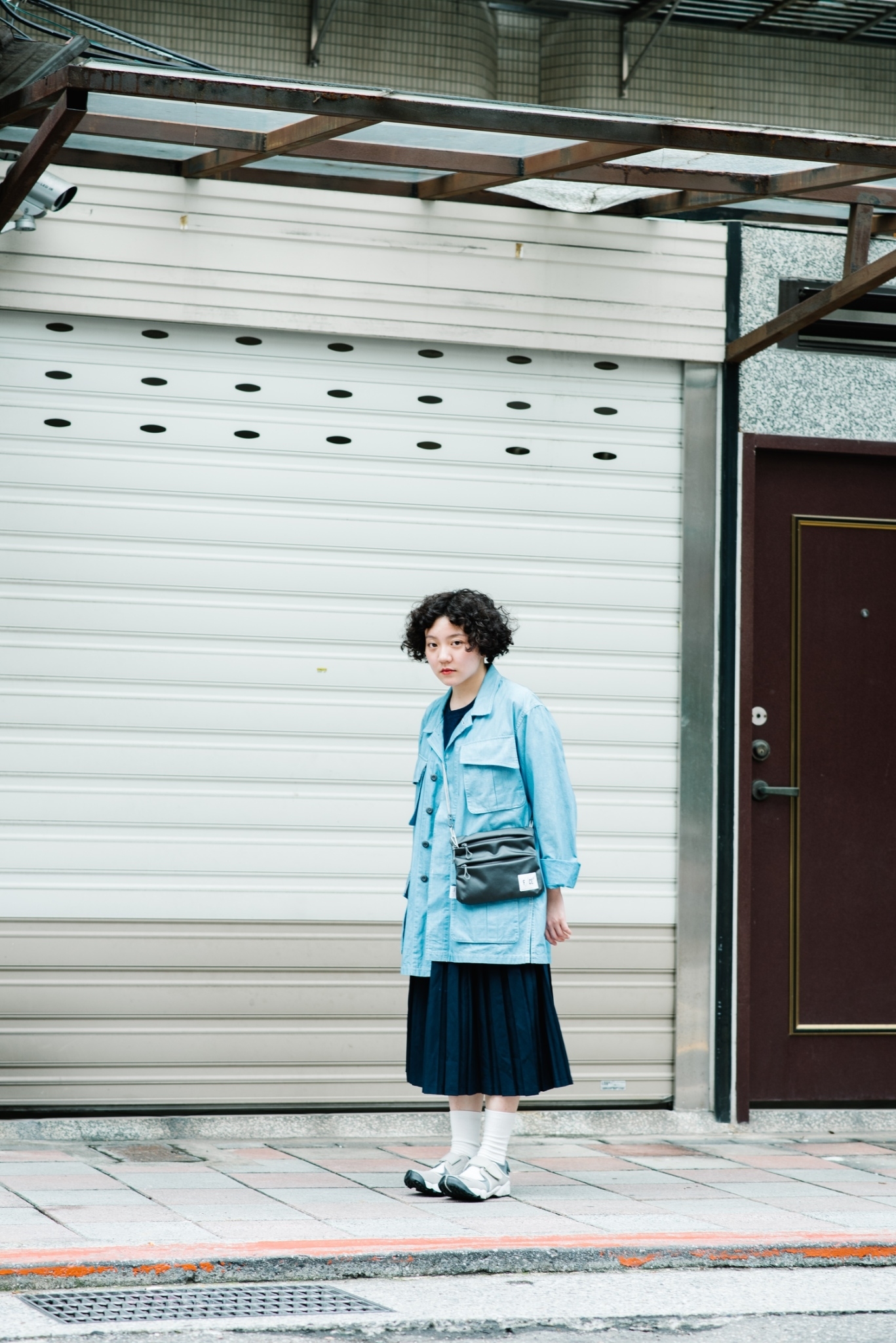 清爽的淡藍色在深色的內搭及裙款的映襯下,色澤更為顯著,稍微寬大的視覺感在球鞋及寬鬆的下身也修飾比例,營造出較輕鬆活潑的氛圍。