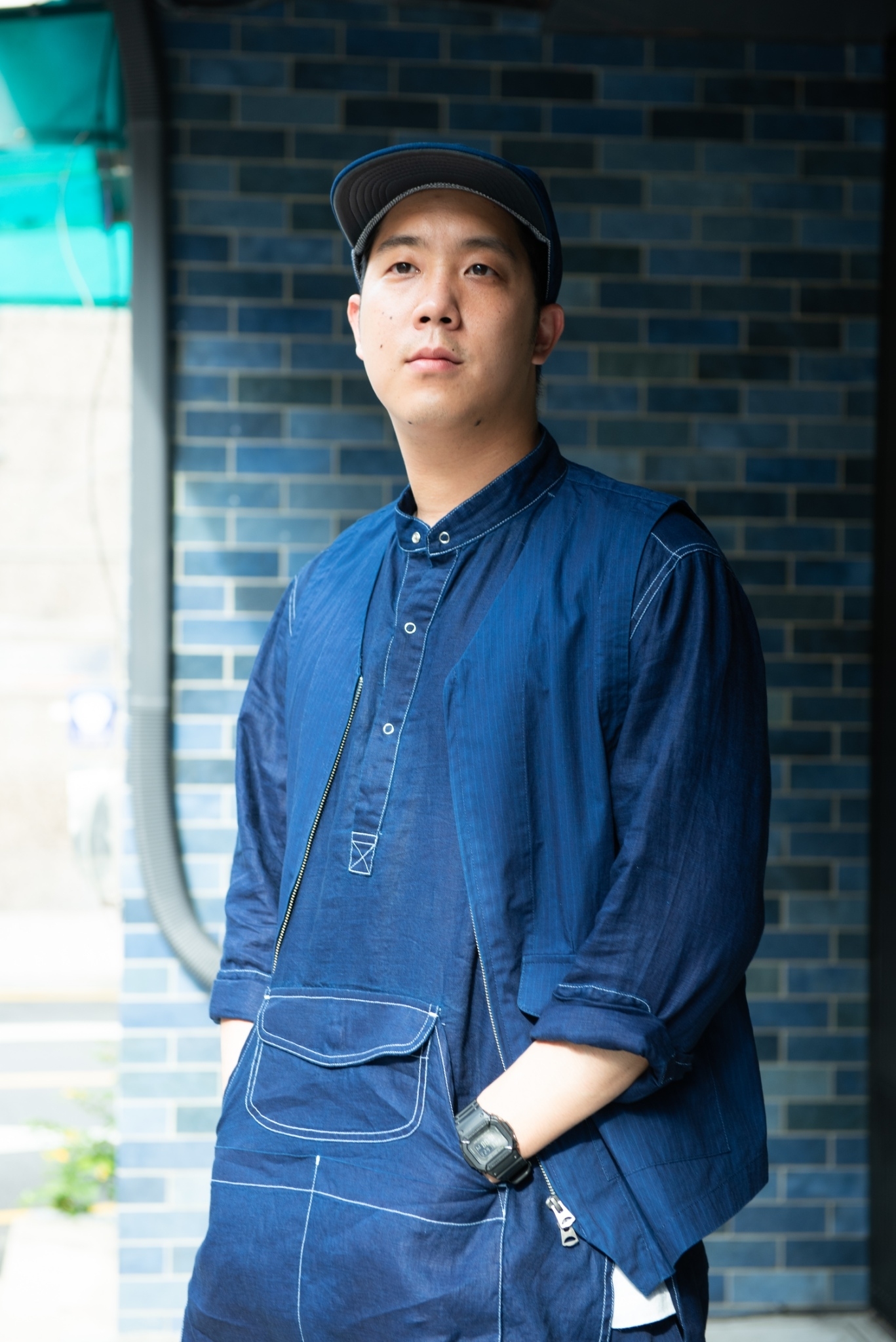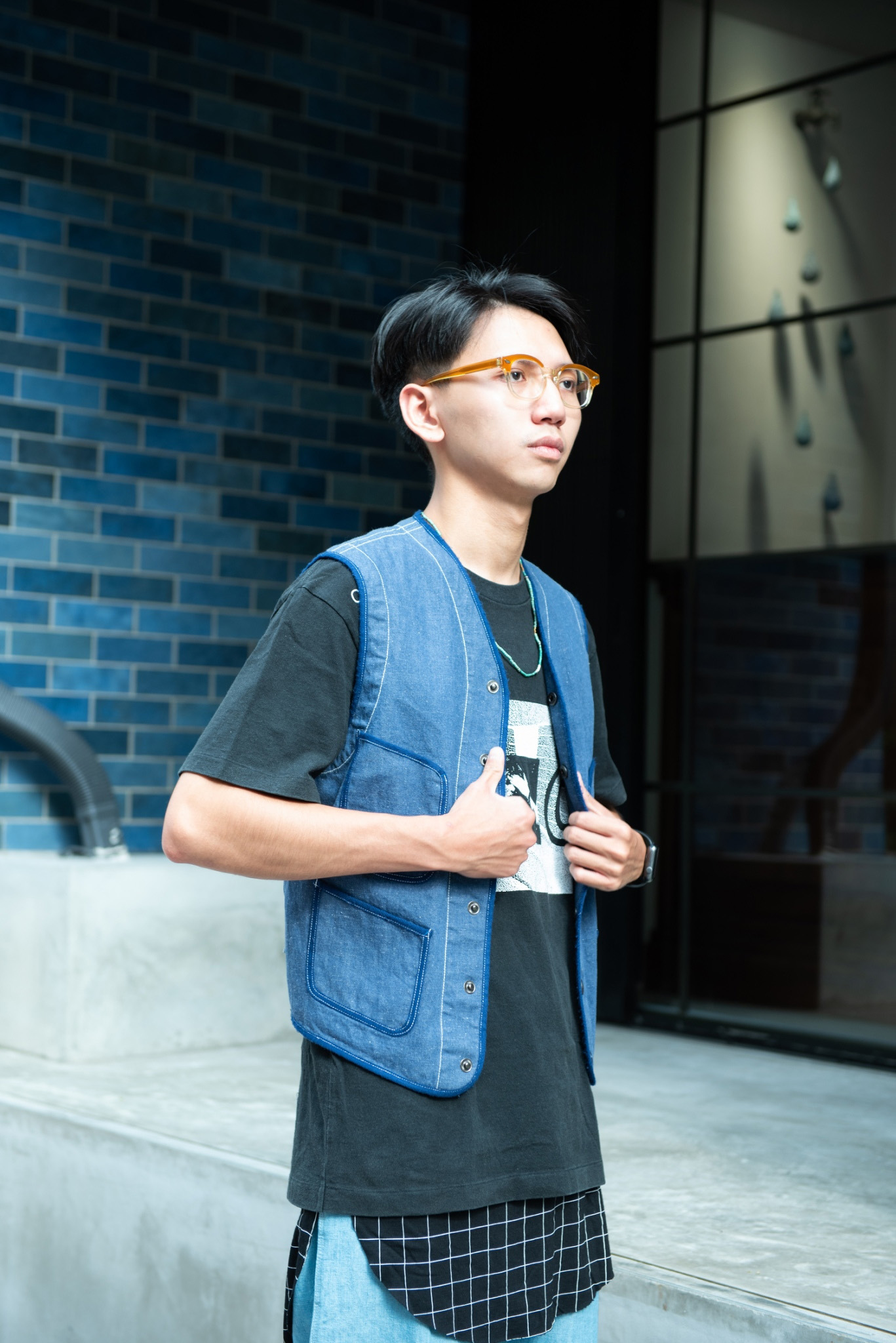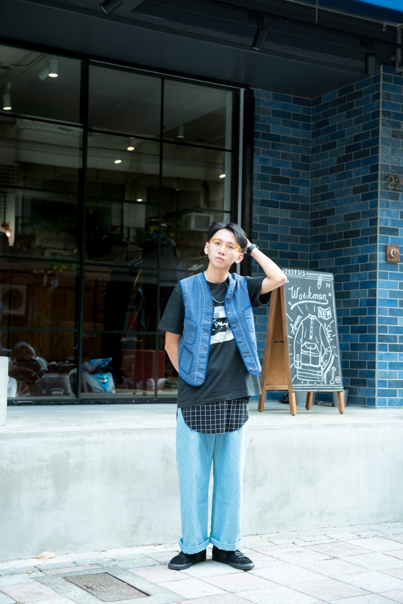 以較為街頭感的單品打底,外罩上 “FRAMEWORK” 工作背心,單寧布料在毛絮加工後更顯復古風味,與內搭形成風格上的對比。