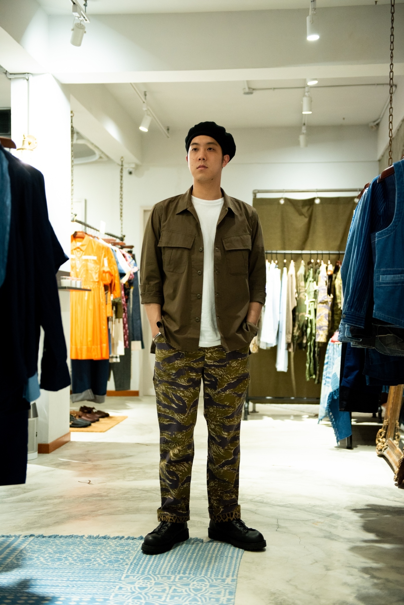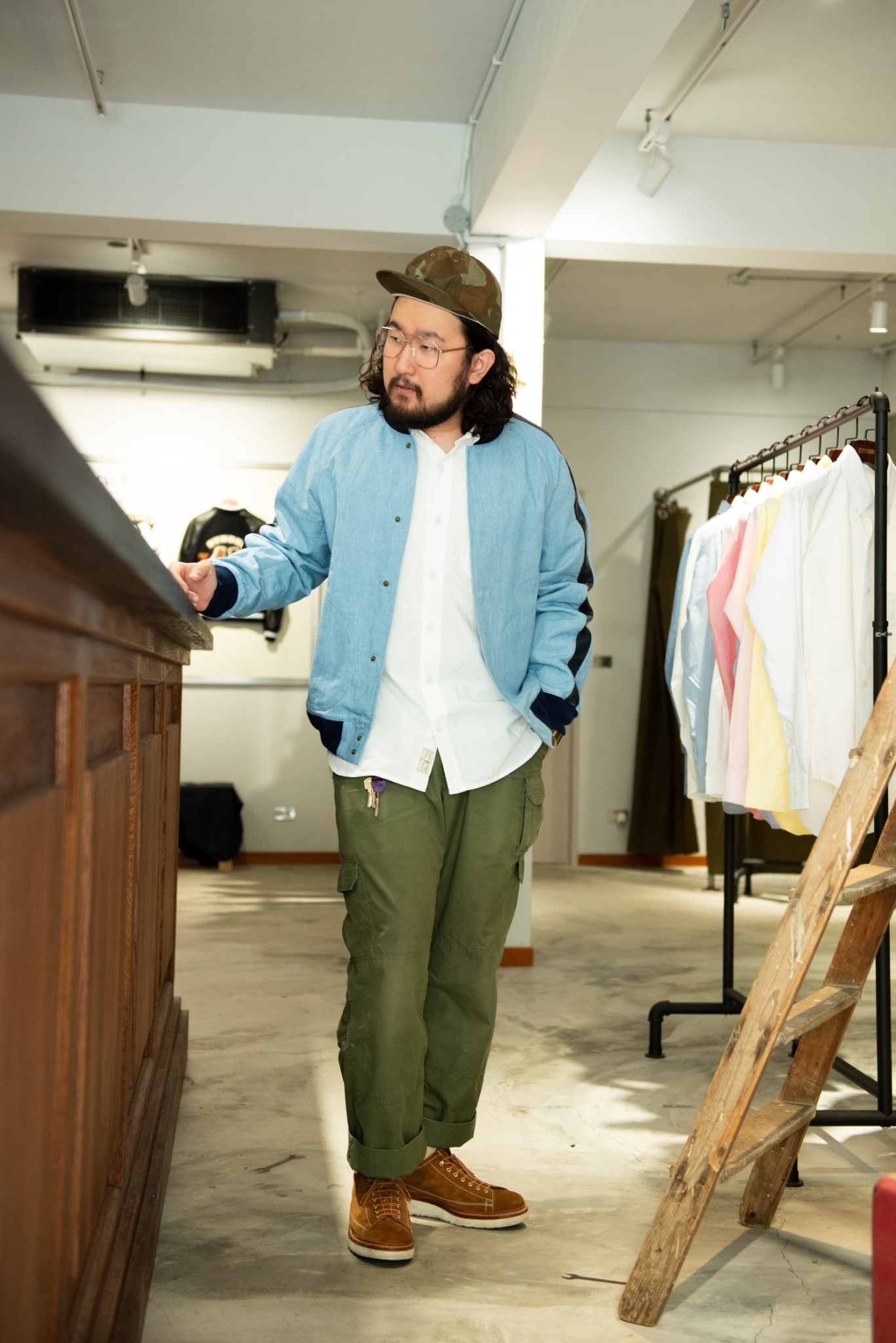 輕薄的 chambray 面料製成的 “STRIKE” 棒球外套在穿著上與襯衫差不多厚度的體感,在夏天穿也不會過度悶熱,內搭 “OLD MINER” 工作襯衫,以清爽的純白做為內搭,下身的軍褲與其他配件組合起來使整體帶著些粗獷氛圍,但各單品都素雅簡潔,整體取得平衡。