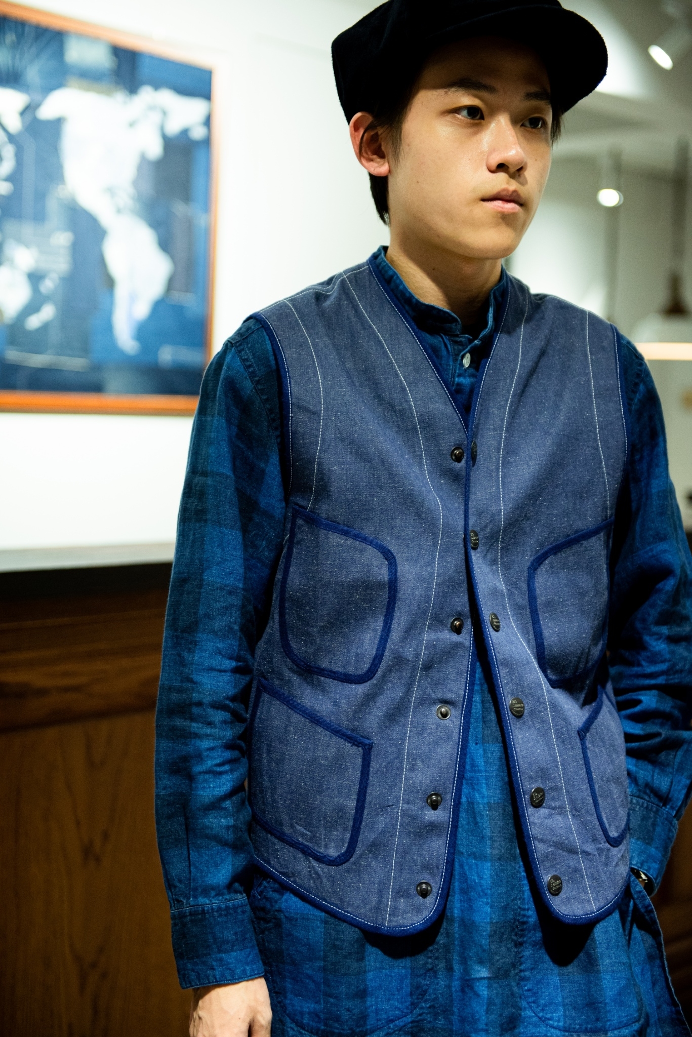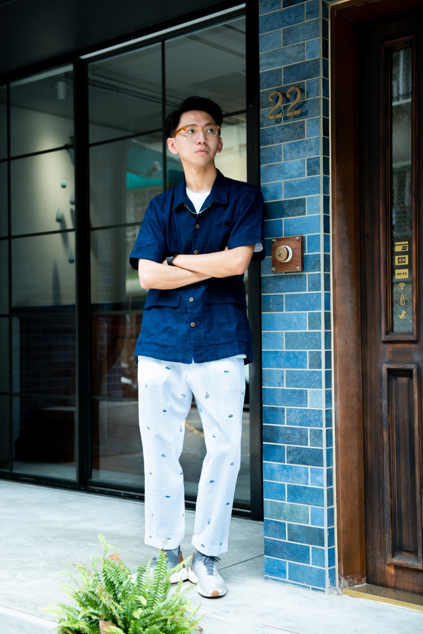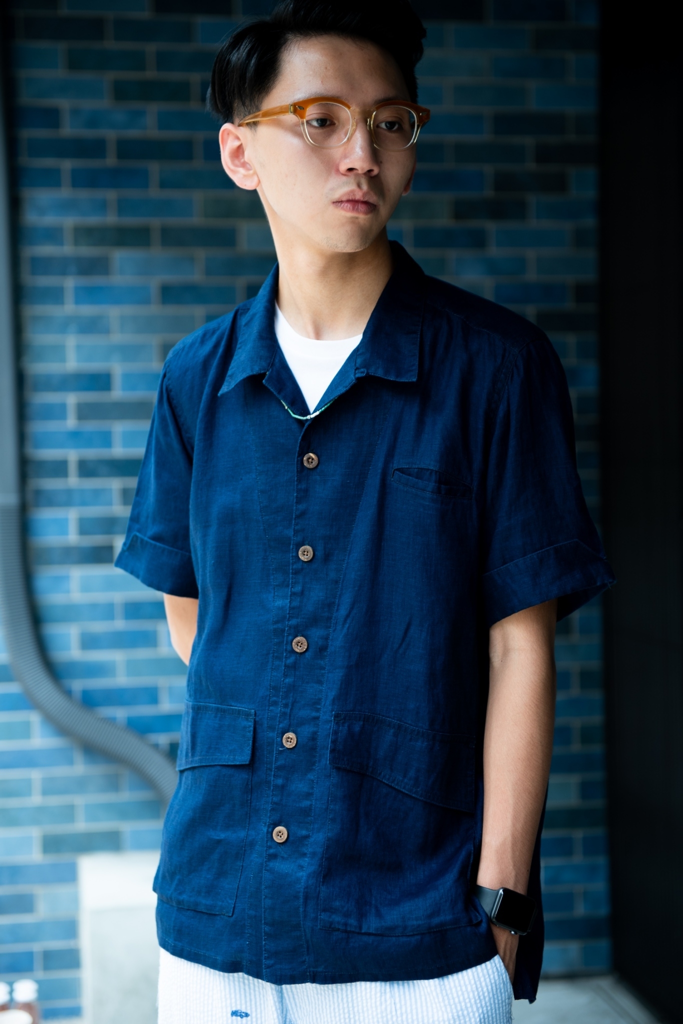 夏威夷衫藍染於亞麻的布料上,本身特性透著些許光澤,配上植物染的飽滿藍色氛圍洗鍊優雅;下身的 “NAUGHTY GENT” 褲款以夏日定番的泡泡紗製作,輕薄透氣穿著上相當舒適。