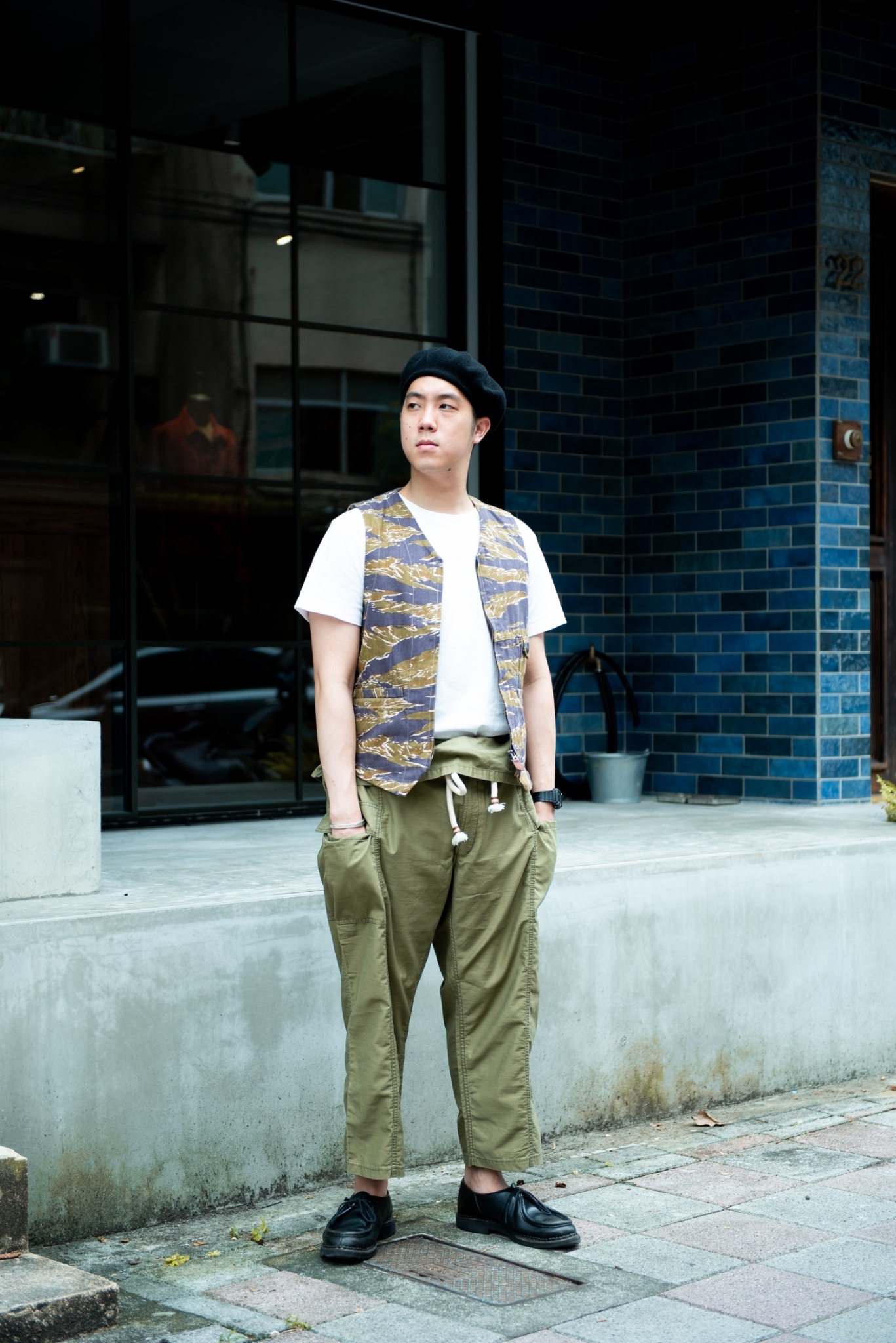 天氣較熱時上衣紮進去便能露出 “FOLK” 漁夫褲的綁帶設計,同時因為此設計,所以視覺上的比例也不會因為紮進上衣就造成影響;上身 “BREATH HOLDER” 迷彩背心與褲款皆帶軍裝氣息,最後穿雙皮革靴款,全身的搭配調性一致。