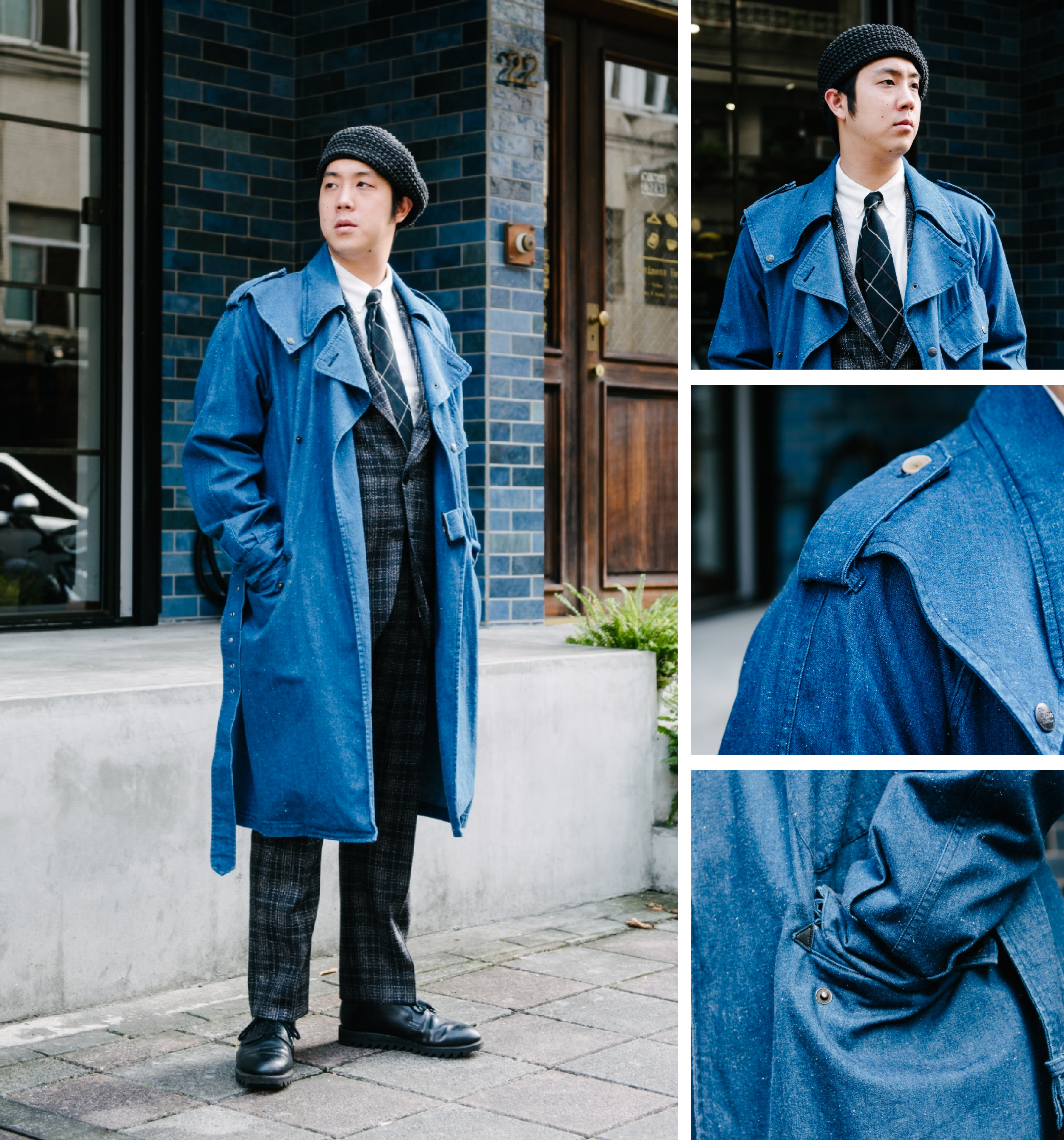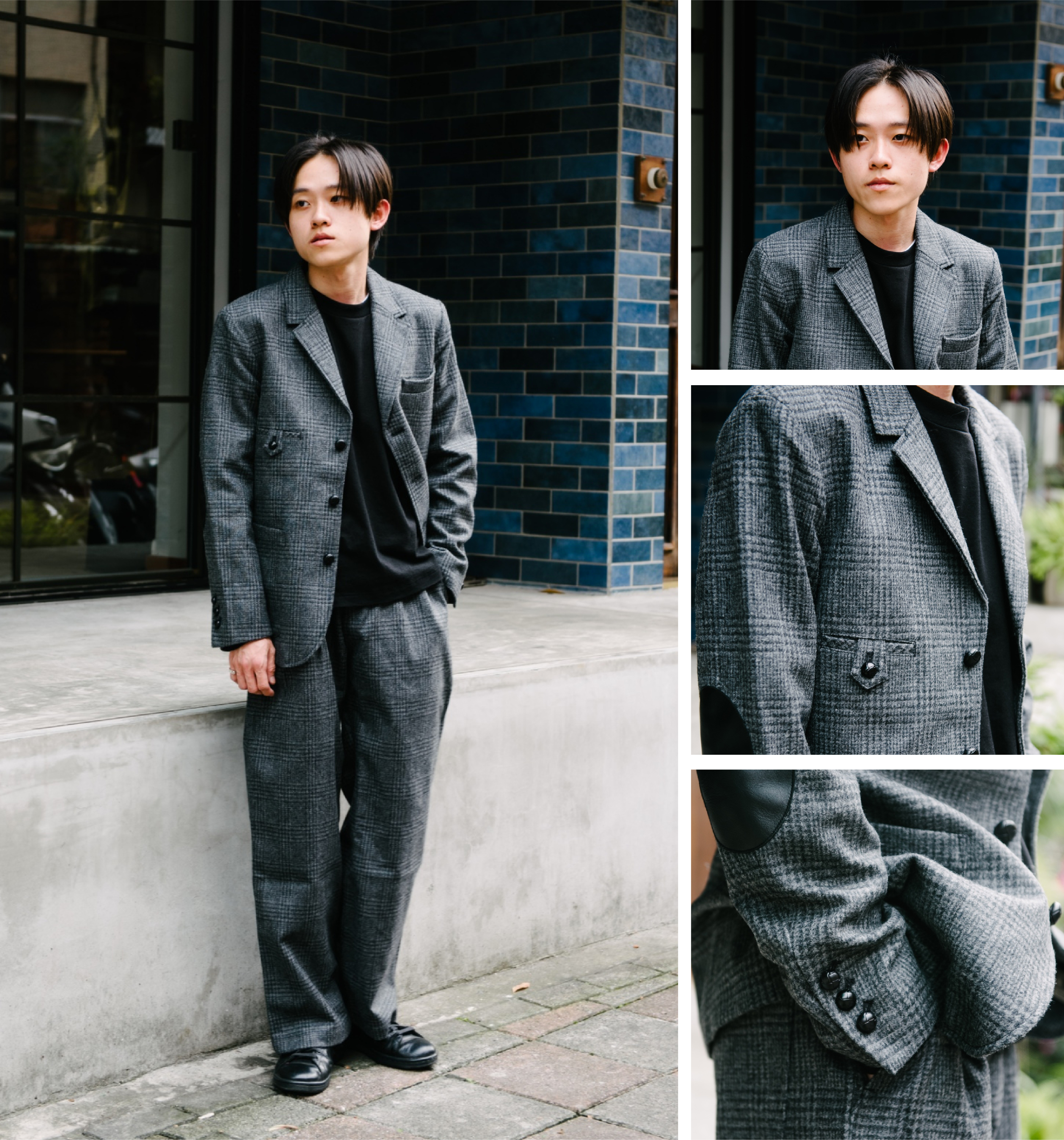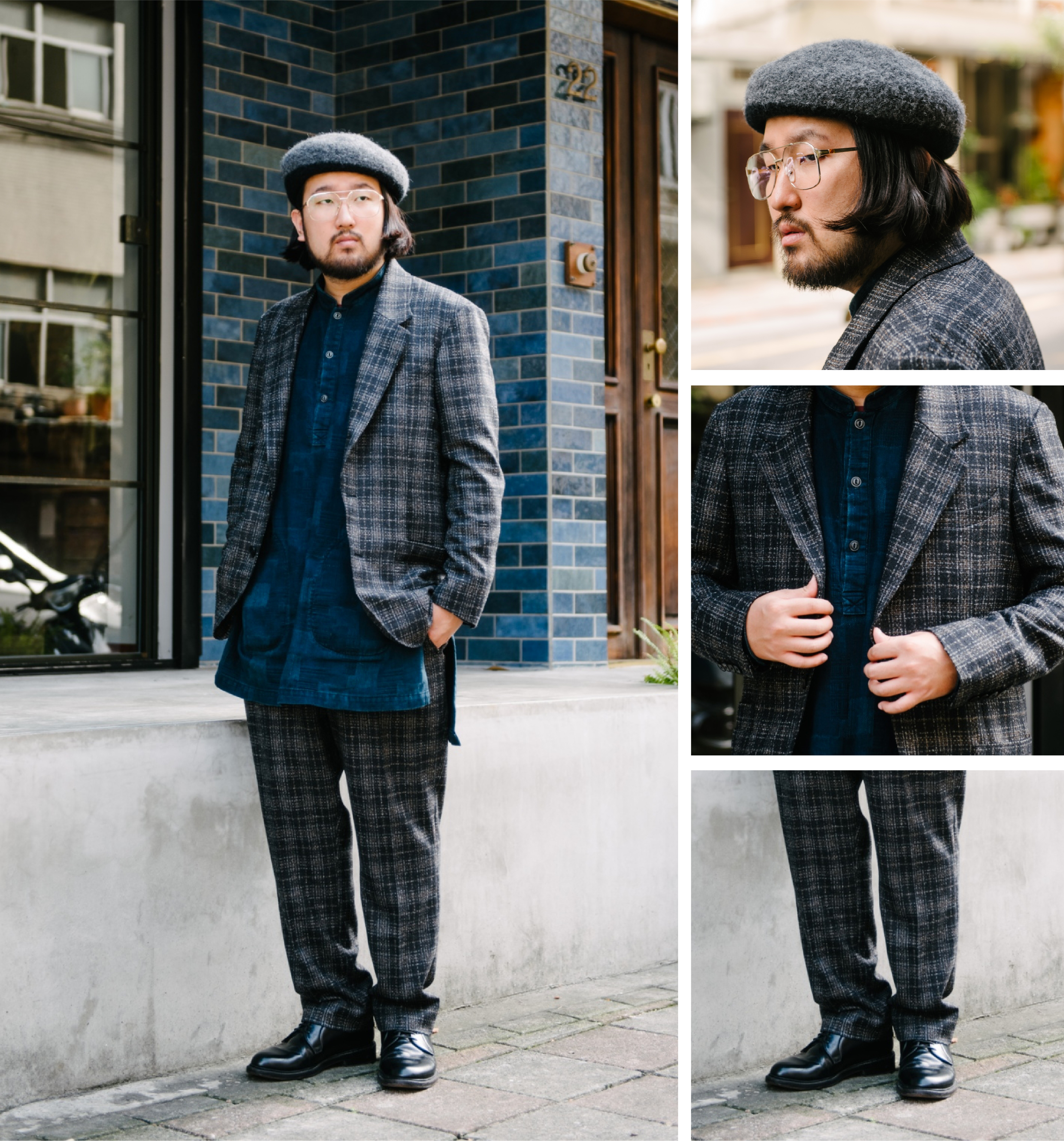 「內搭選擇藍染提花長版襯衫,搭配冷灰色調的 virgin wool 成套紳裝,即便是穿著皮鞋,內長外短的層次卻也多了些玩味性。」
