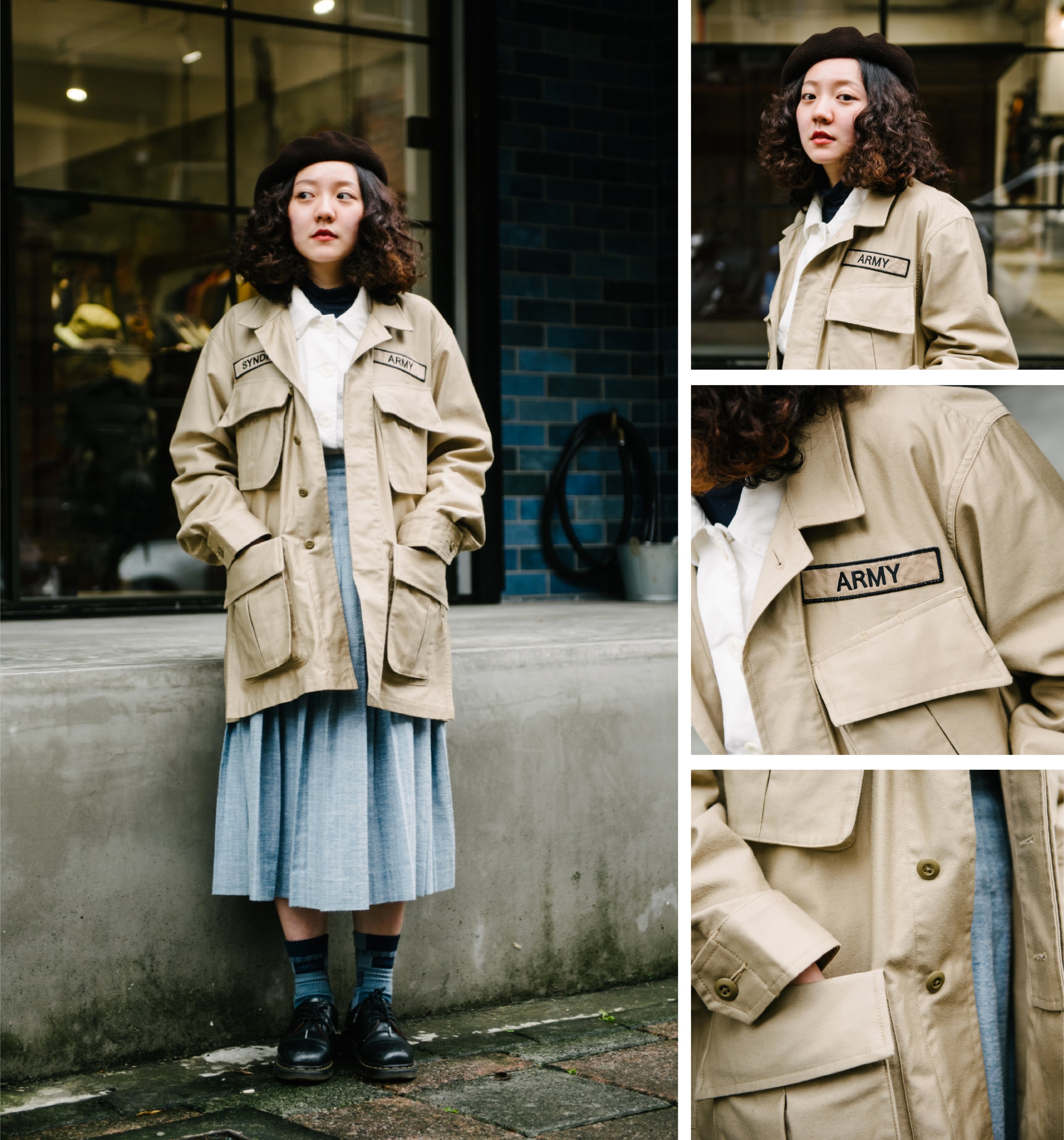 「 卡其色的 JUNGLE ,配上 W'MENSWEAR 英倫風的魚骨紋蘇格蘭裙,帥氣感又不失個性的搭配。」