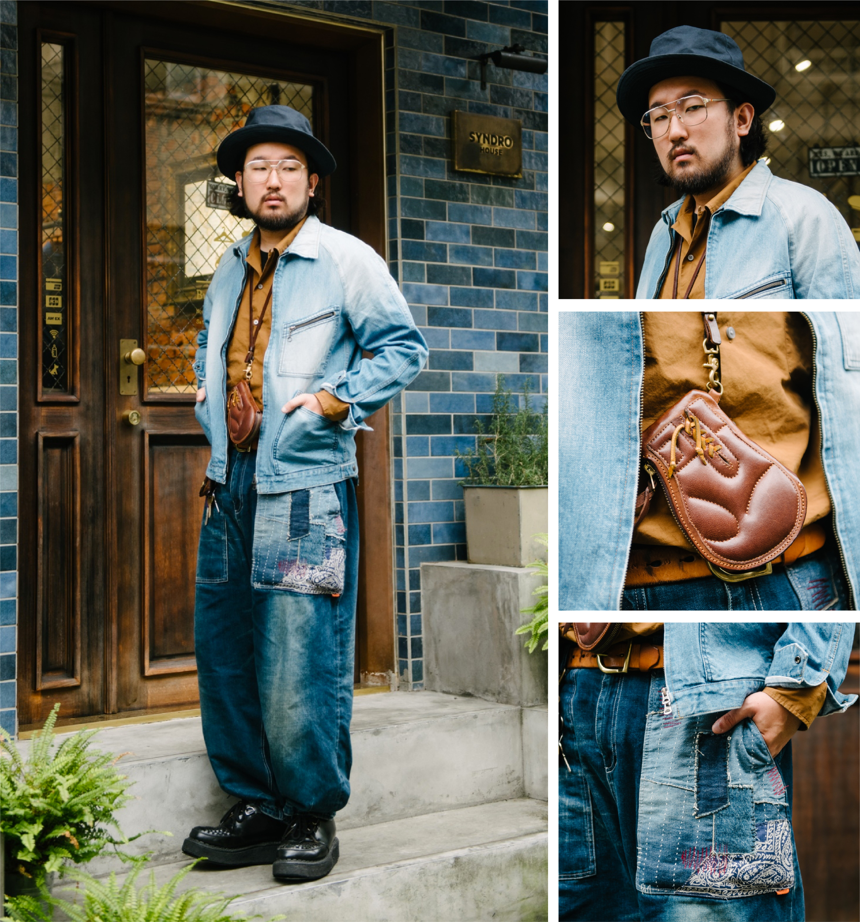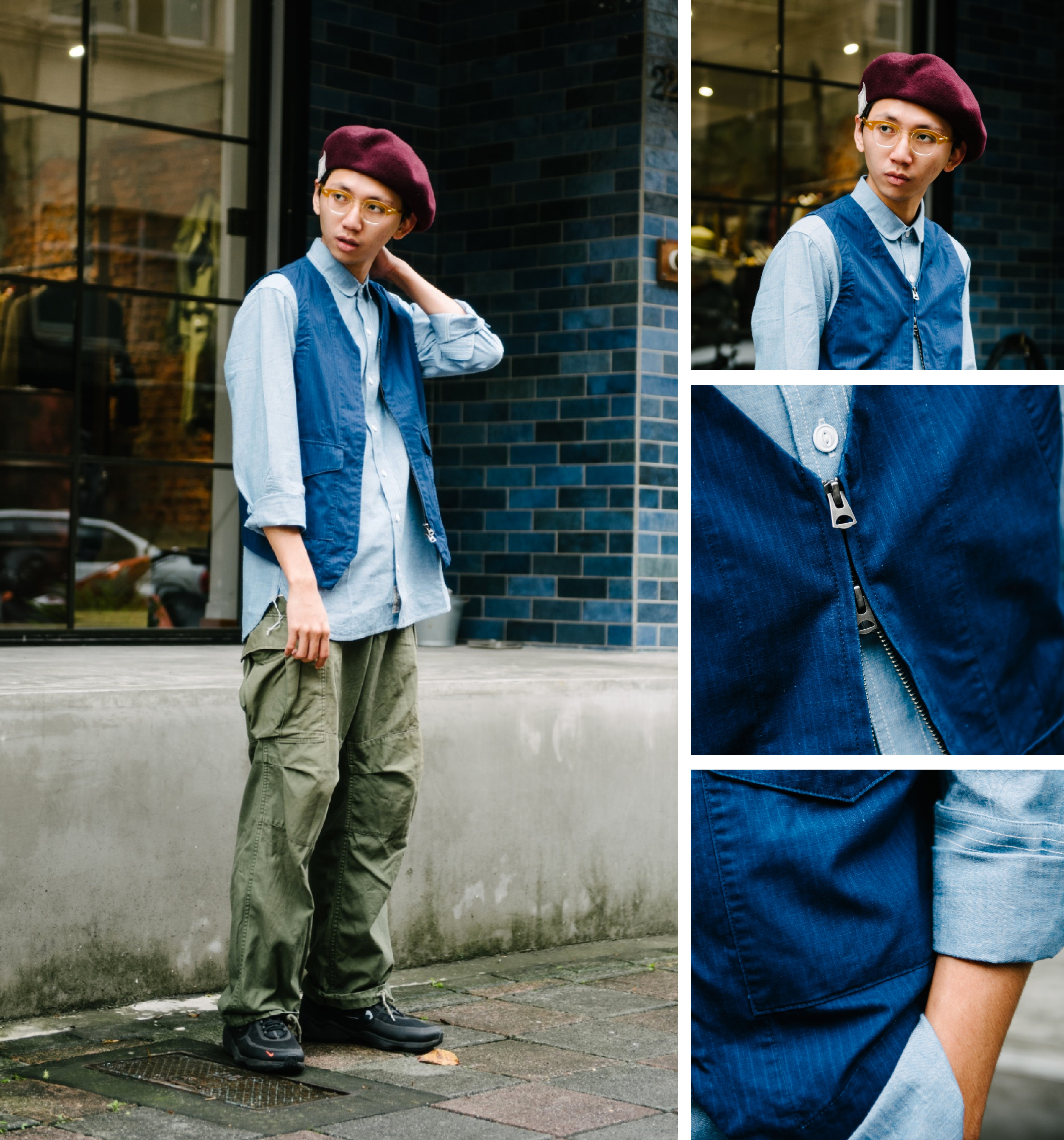 「使用各種不同藍色澤的丹寧面料,貫串全身整體視覺感,再隨性配上不飽和對比色調的內搭襯衫,運用小小的跳色增加豐富度。」