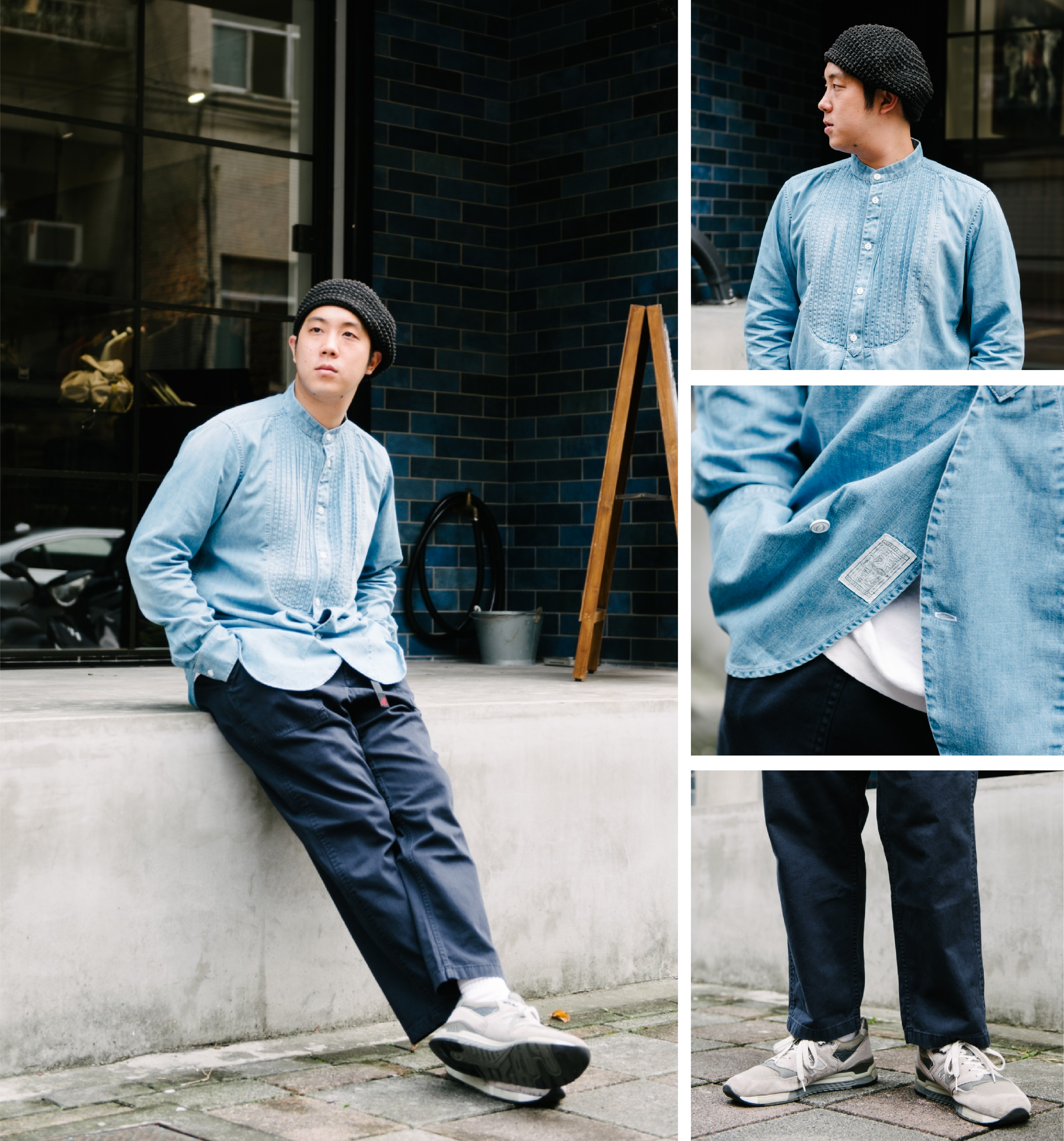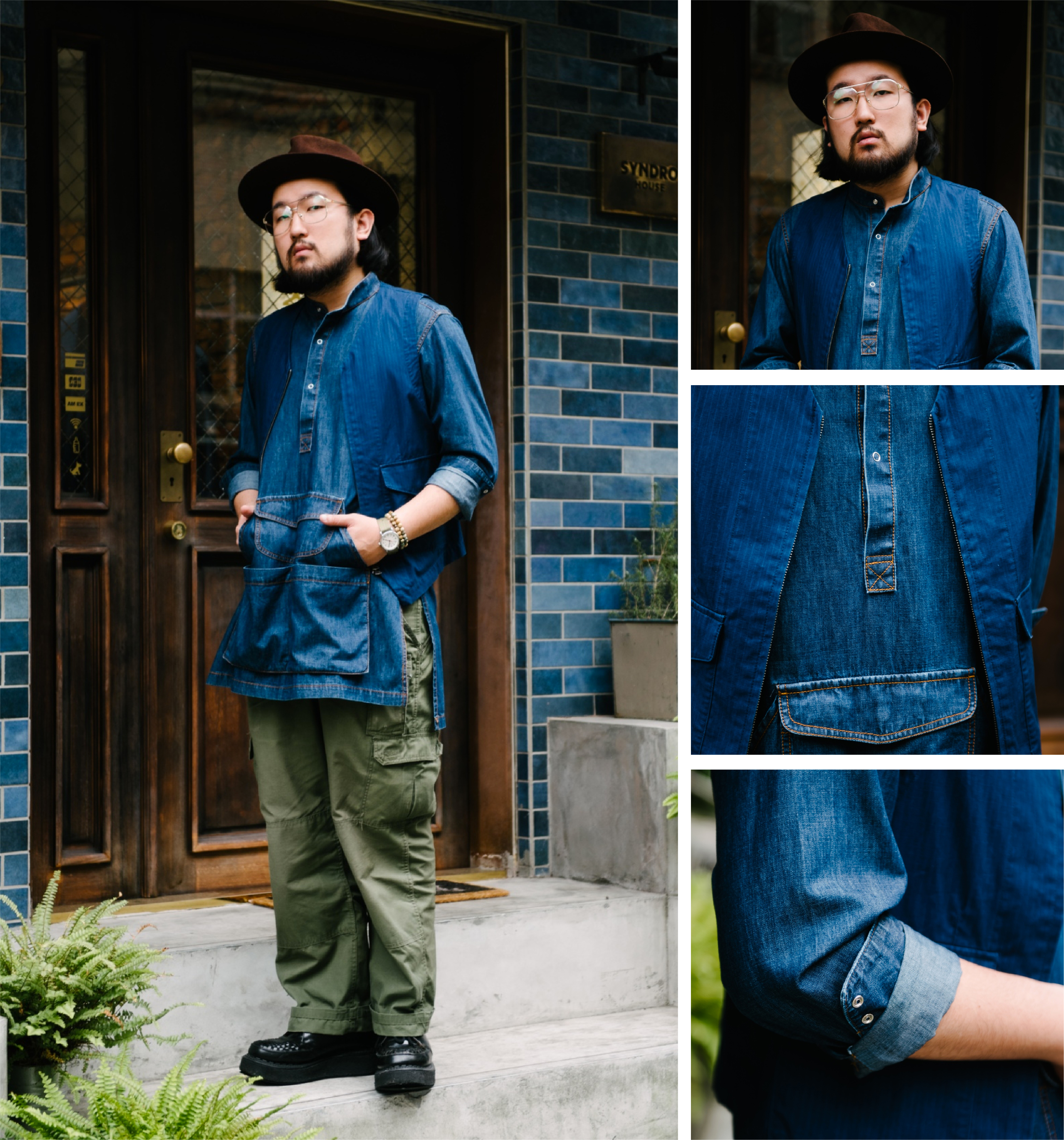 「丹寧長版工作圍裙襯衫外搭藍染 ripstop 背心,內長外短的層次感真的看不膩!襯衫側邊的高開衩更是讓褲子細節一覽無遺。」