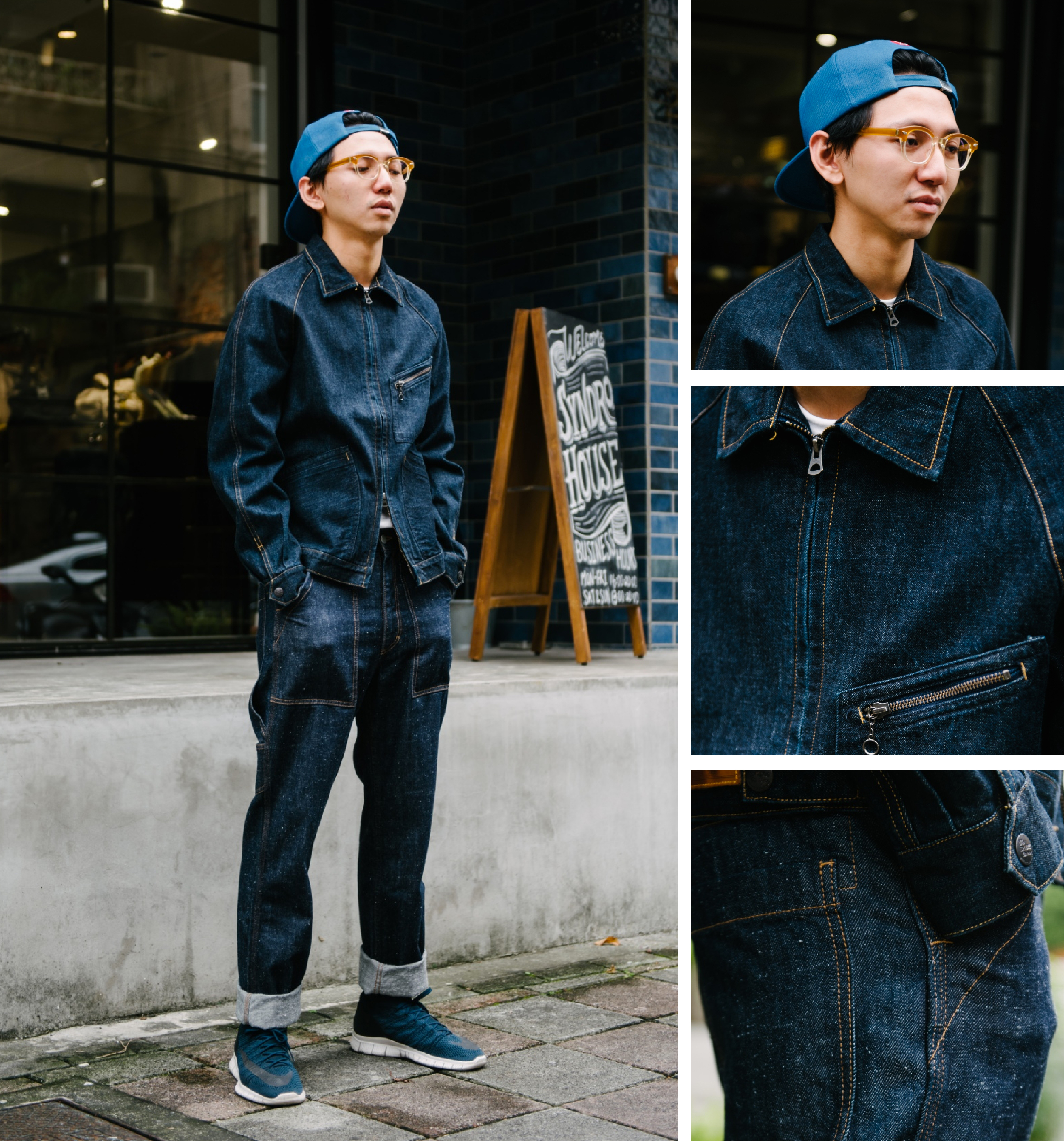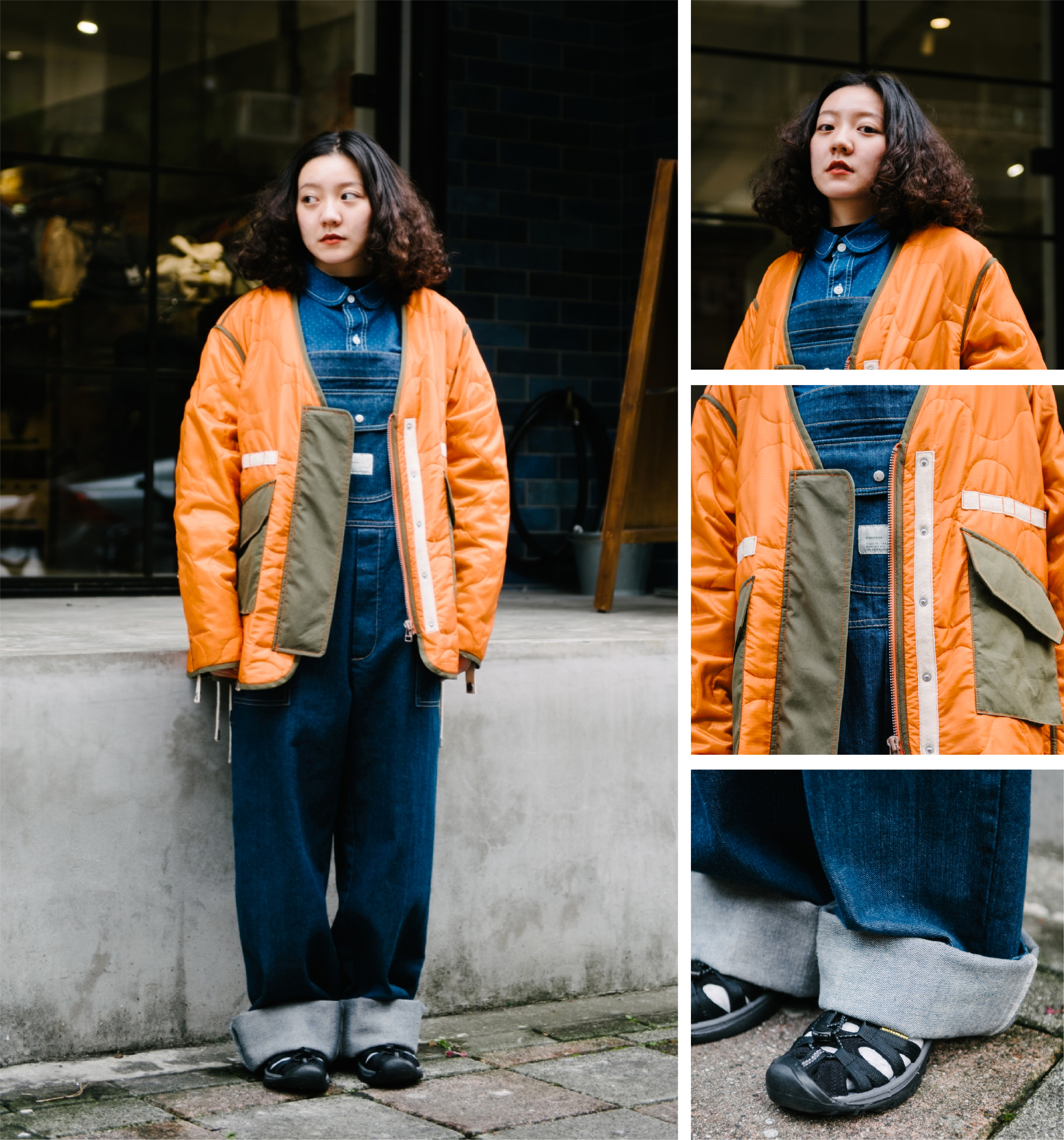「 OLD MINER 水玉點點襯衫配上赤耳邊丹寧連身牛仔褲,外搭橘色尼龍防撕裂軍用外套做為整身的穿搭亮點。」