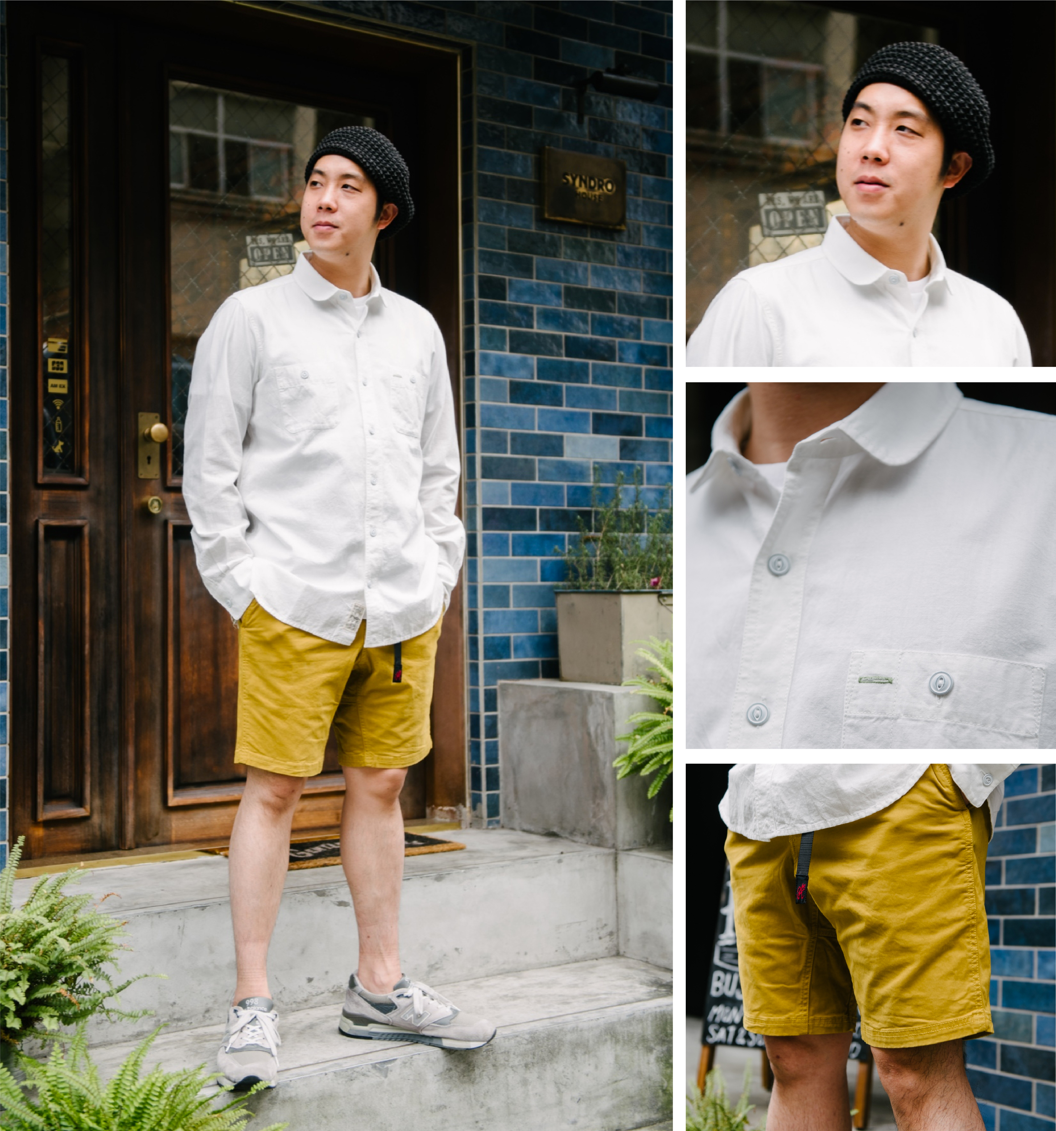 「活潑的芥末黃 GRAMICCI NN-SHORT搭配,輕盈的 CHAMBREY 工作襯衫,適合早春的休閒搭配。」