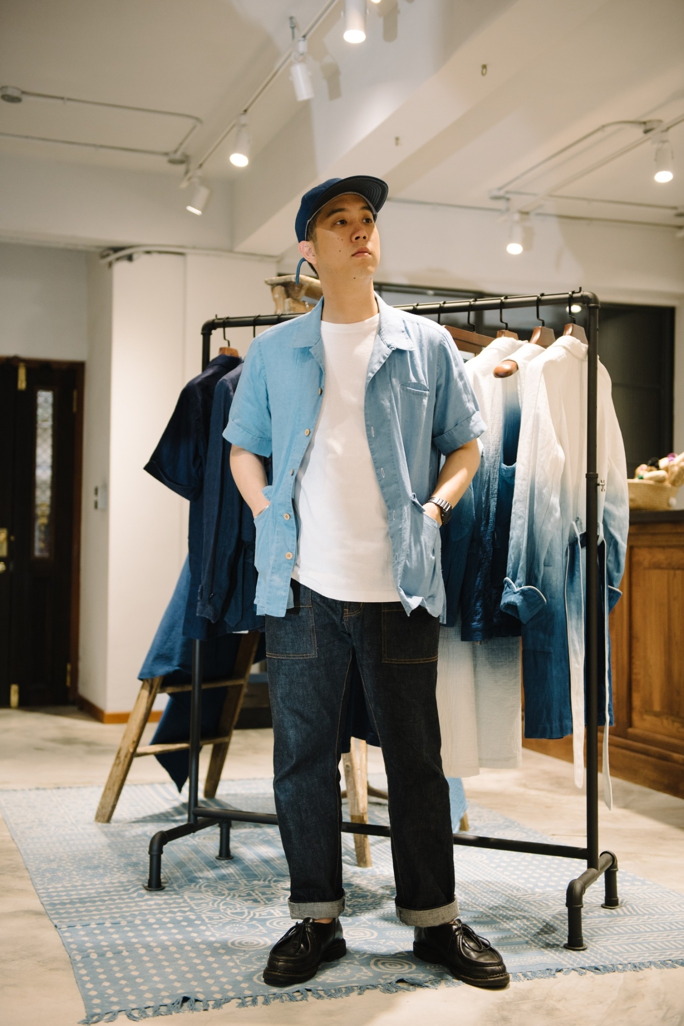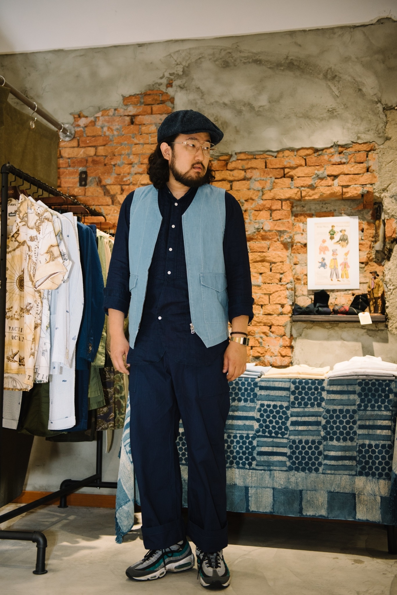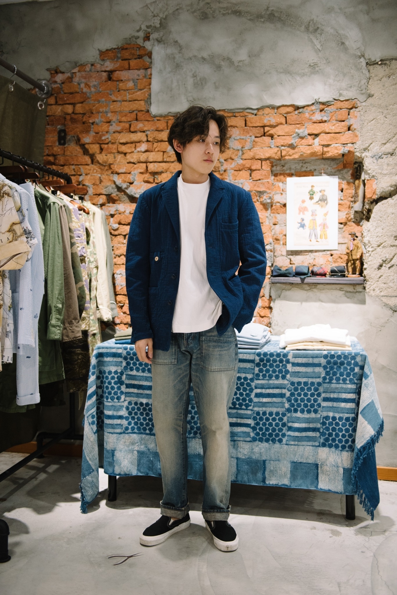 上身是十分飽滿的藍,下身搭上極具 vintage 感的 “CHIC LABOUR” 洗舊丹寧褲,在單品之間的層次感拉提不少,這樣老舊、樸實隨性的氛圍也是自身十分熱愛的。
