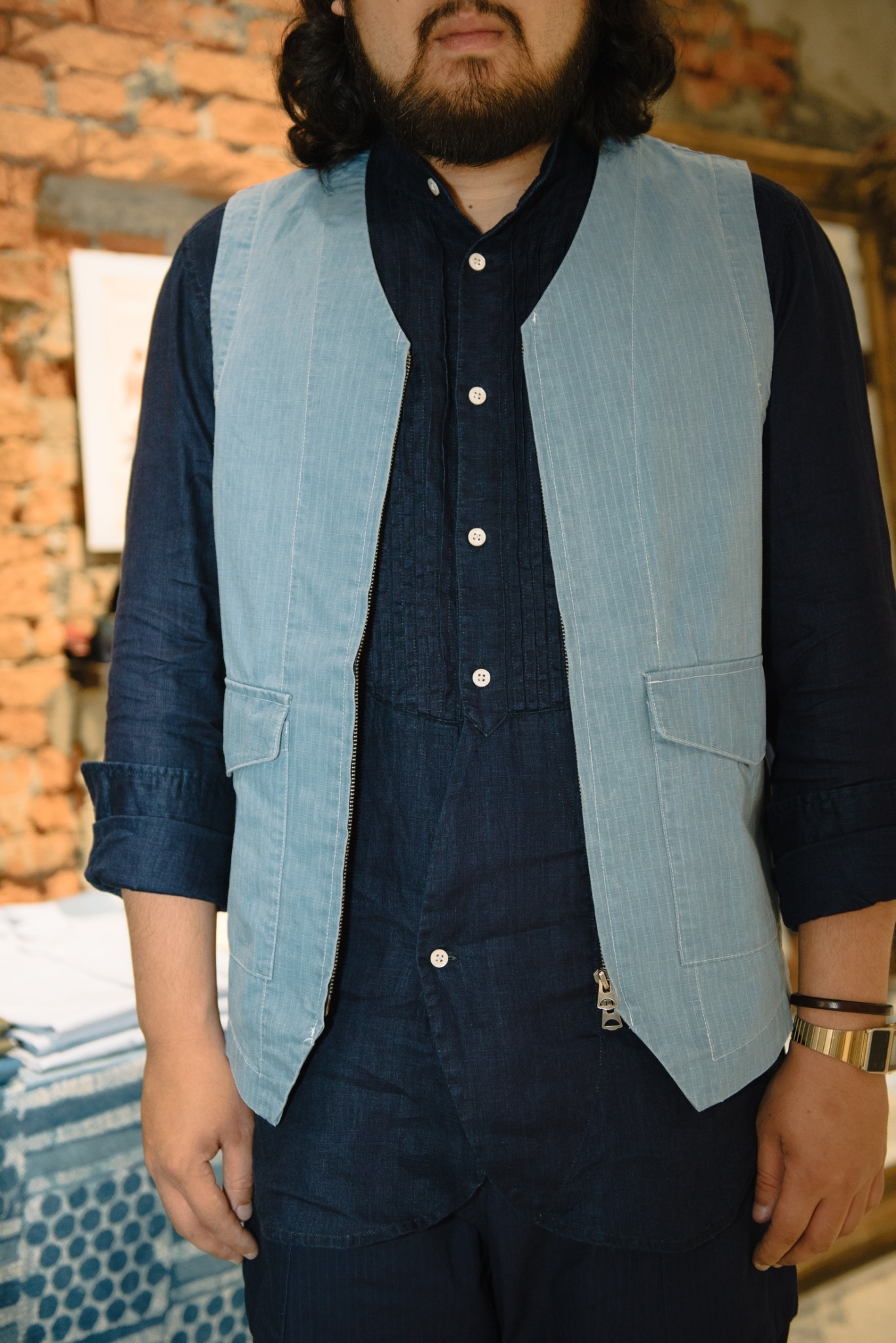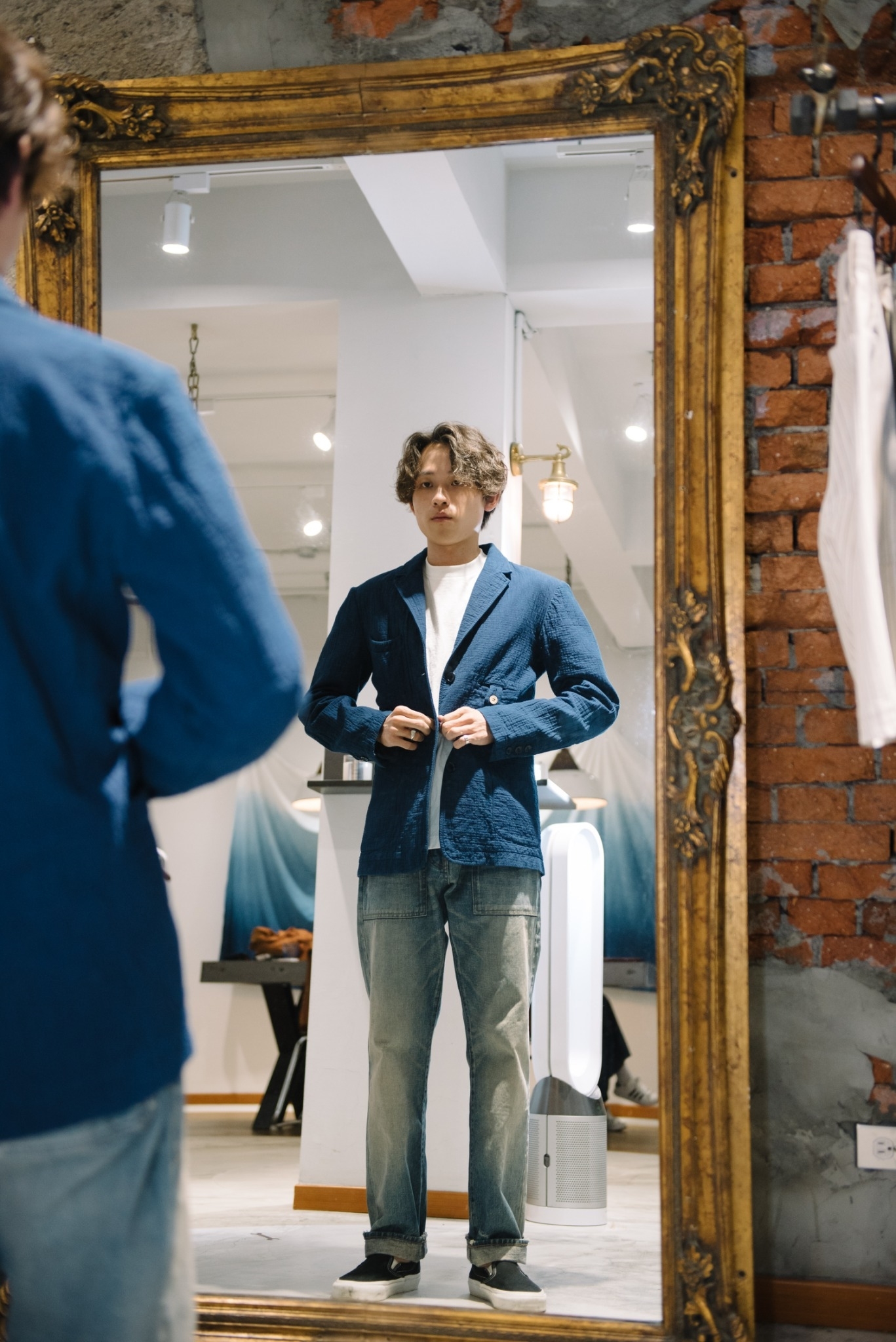 西裝外套好像都被認為是很不適合夏季的單品,但 “GAIA” 藍染三扣夾克布料上用純棉雙層網紗製作,結構蓬鬆透氣,實際穿著時只覺得十分舒適,不帶負擔。