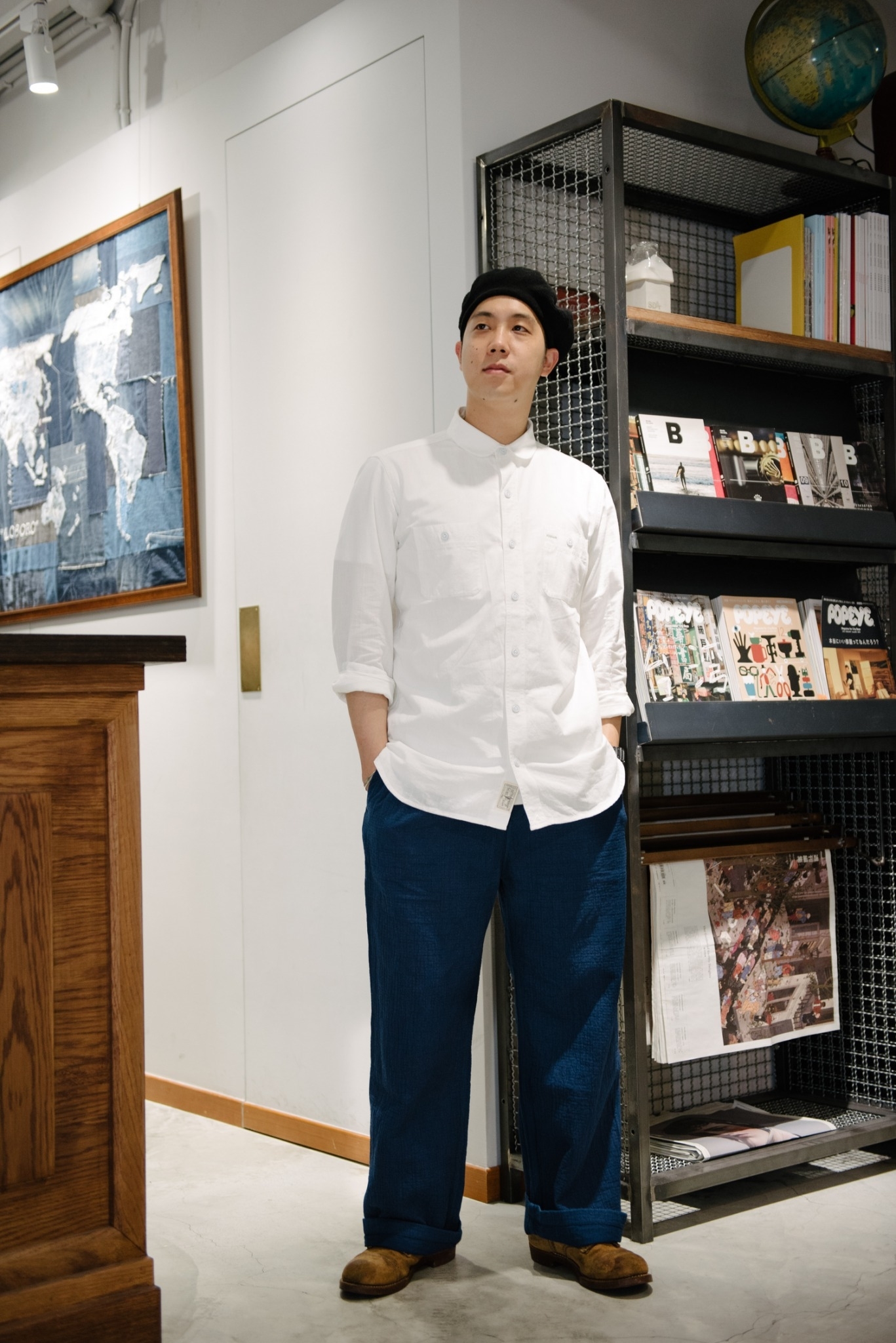 “OLD MINER” 工作襯衫雖然在各項細節都帶有滿滿的老工裝氣息,但穿上後又同時帶有一股優雅的休閒氣質,配上 “THE WIDE ONES” 寬版工作西褲,滿溢的書生氣息很令人喜愛,戴上相同氛圍的貝雷帽後,感覺好似能在咖啡廳看上整個下午的書。