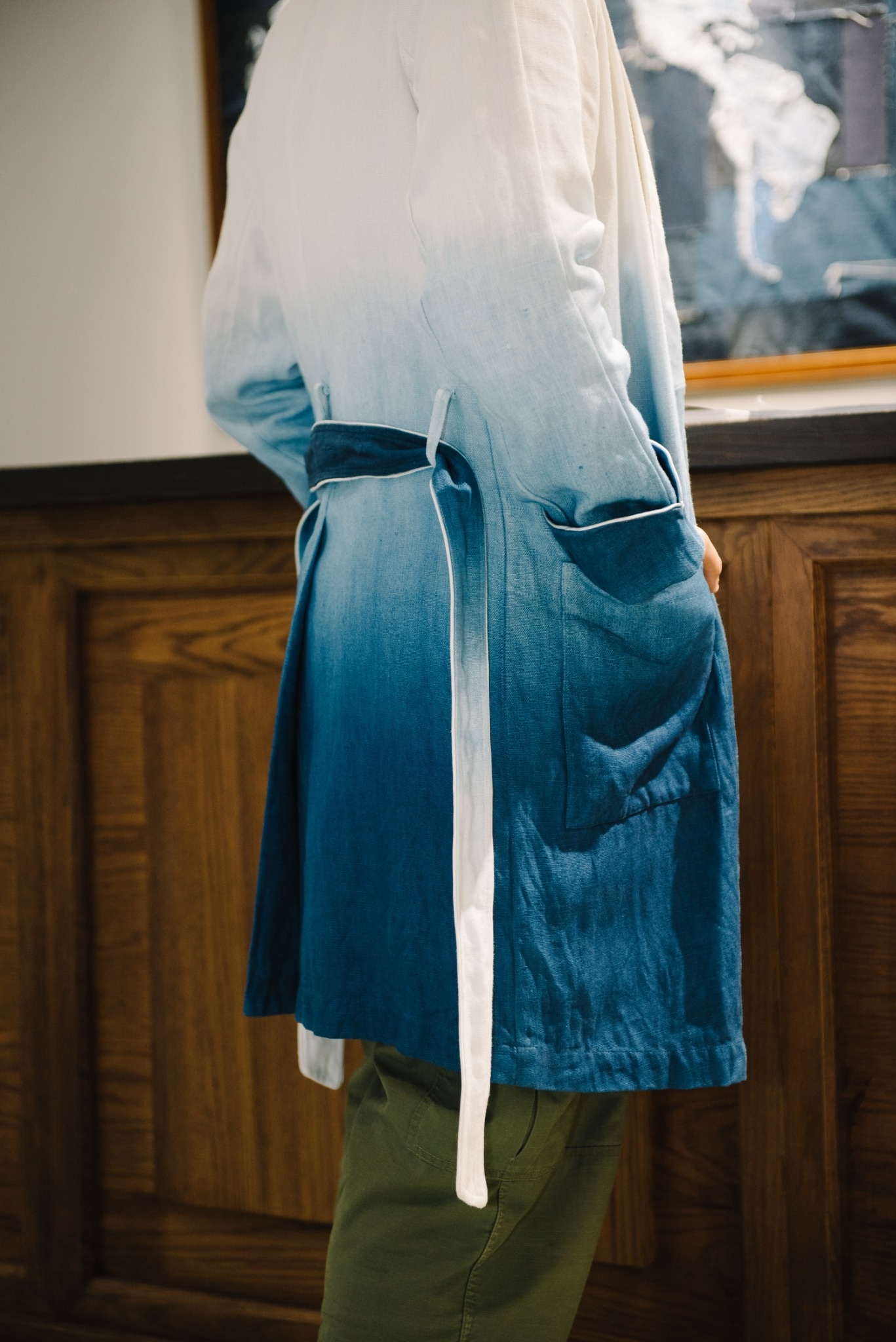 “INSOMNIAN” 長袍漸層的藍染色澤實在令人愛不釋手,材質上選擇亞麻帆布,像是老品般的素雅質感,染上漸層分明的藍後成獨樹一格的面貌。
