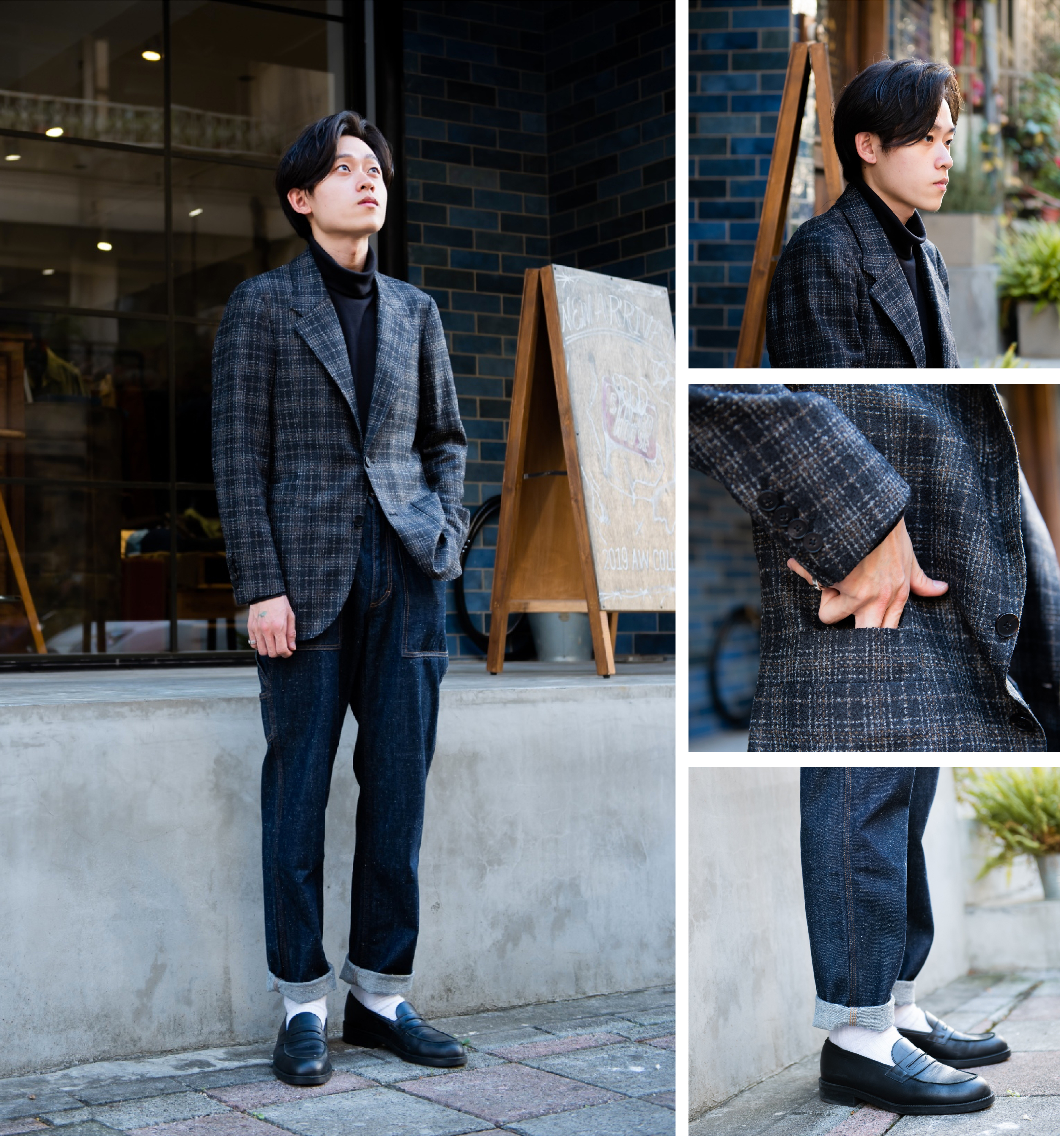 「西裝配上高領衫搭配出大人味的質感。」