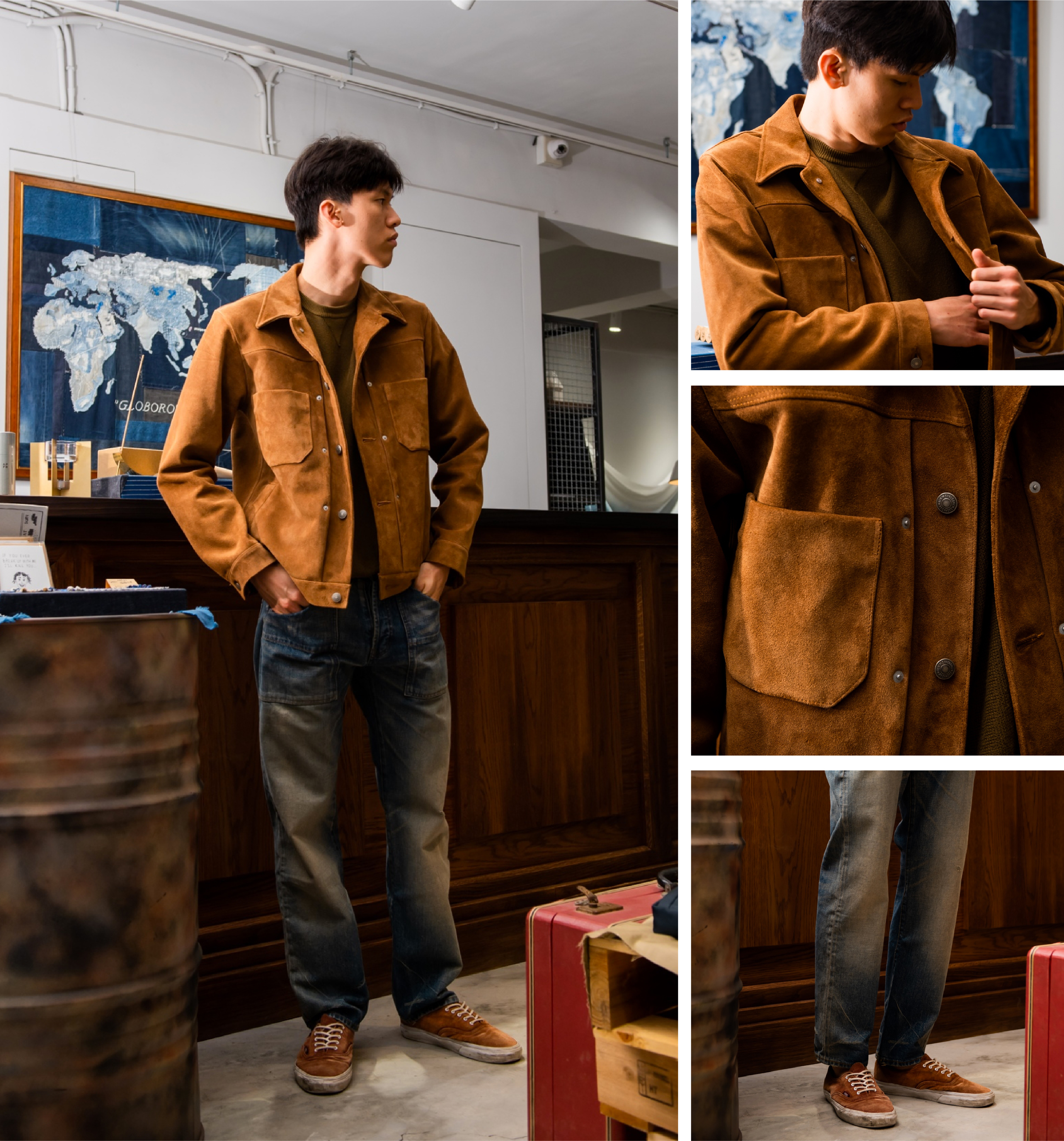 「駝色麂皮夾克配上刷色單寧褲,顯現出隨性粗獷的樣貌。」